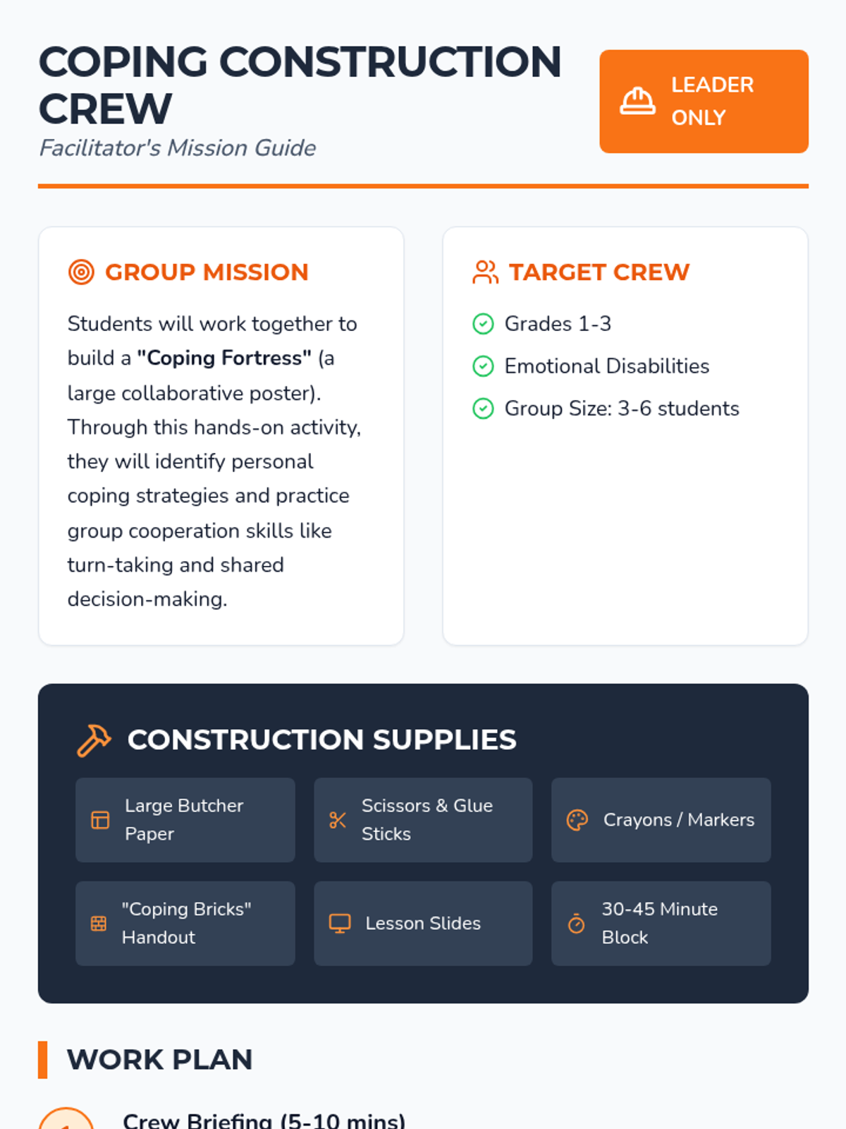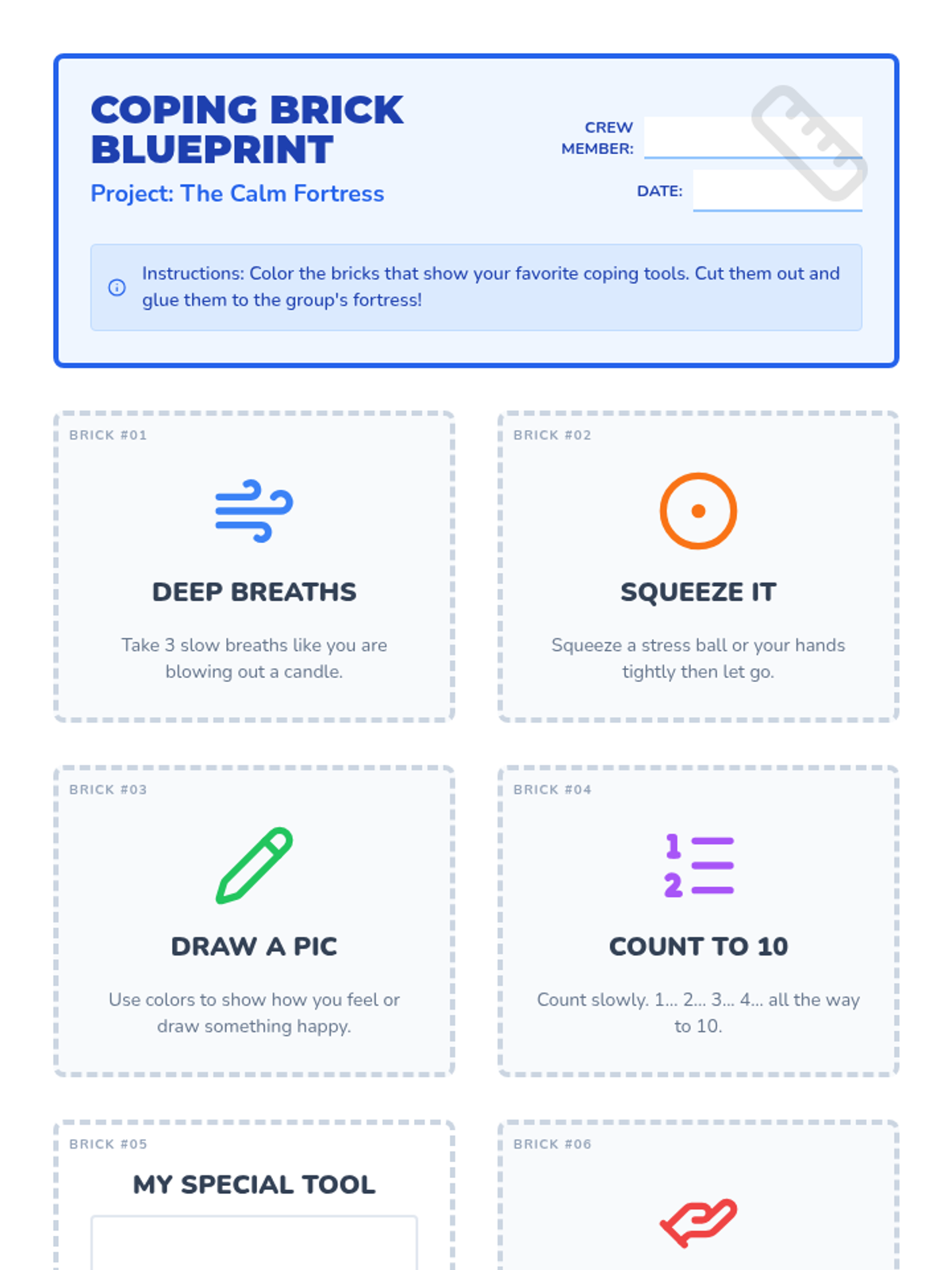 A hands-on group counseling lesson for students in grades 1-3 with emotional disabilities, focused on identifying and using coping strategies through a collaborative building activity.