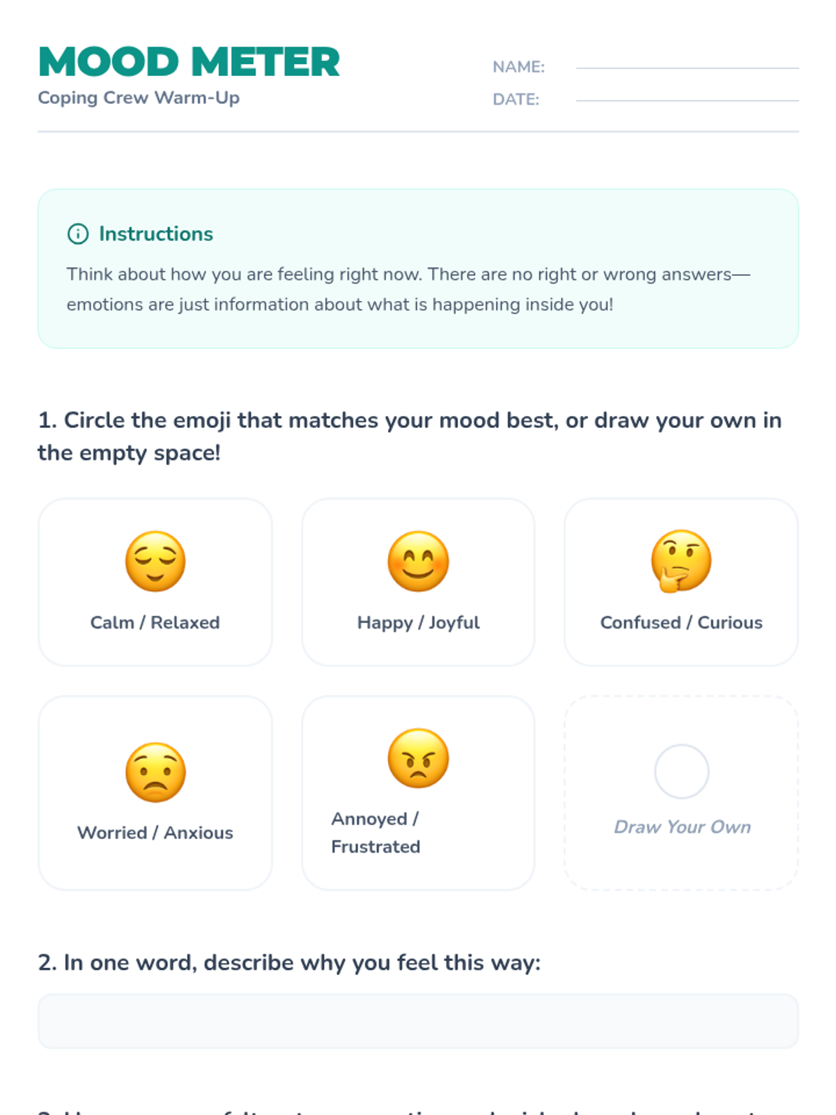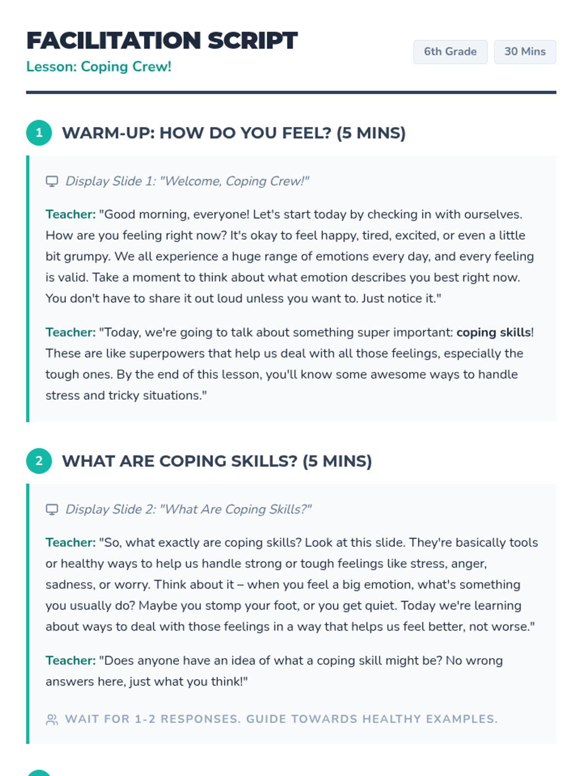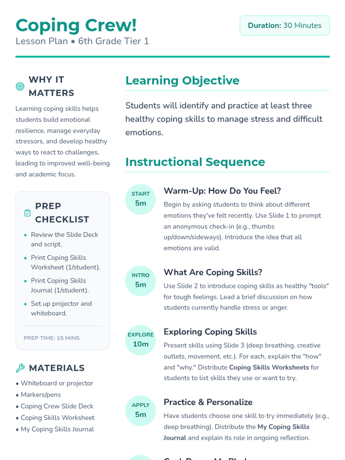 A 30-minute interactive lesson for 6th graders to identify and practice healthy coping skills for emotional resilience.
