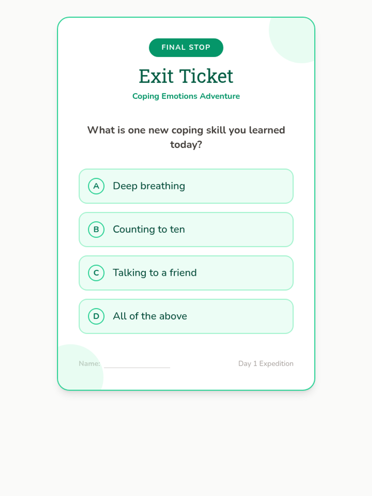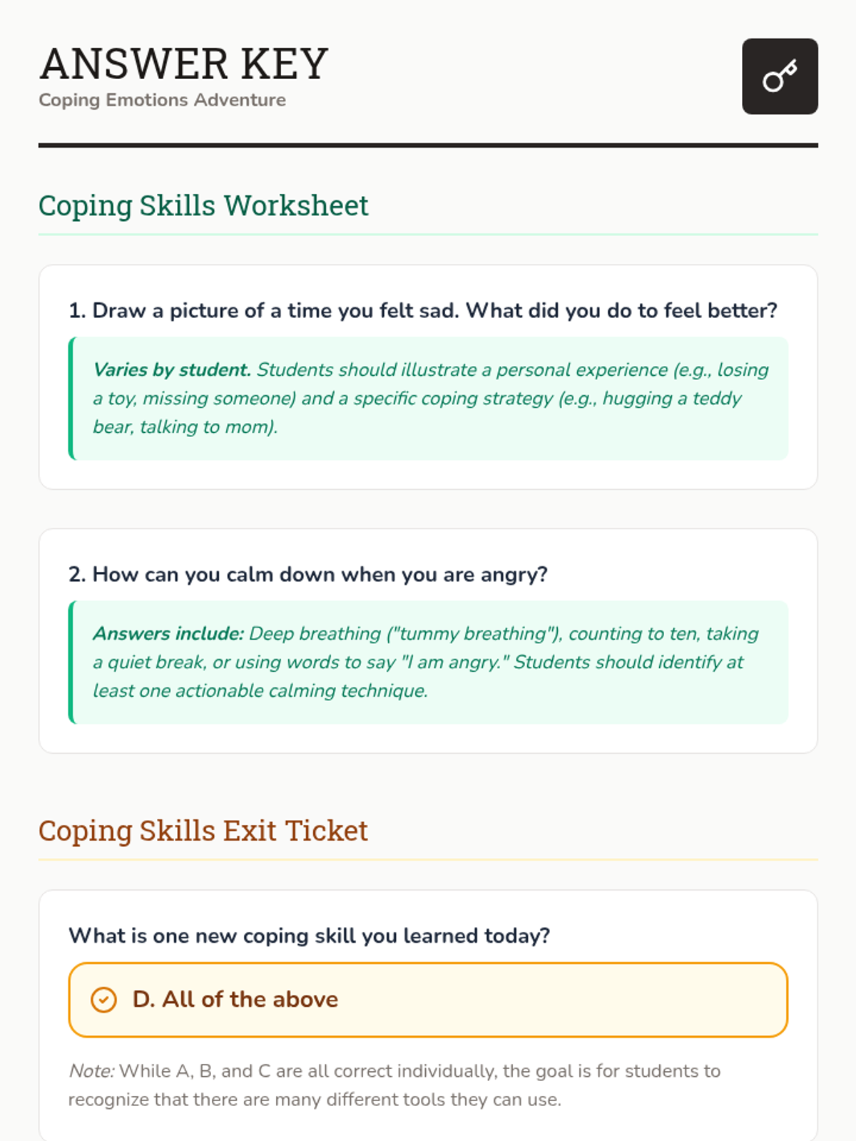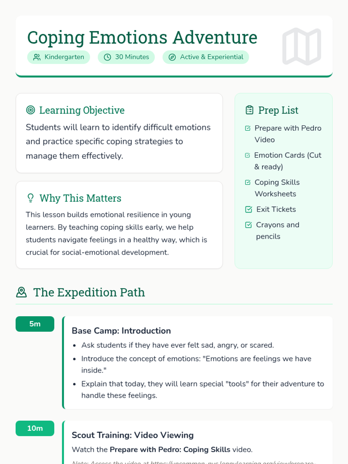 A kindergarten lesson that introduces students to coping skills through an interactive adventure. Students will learn how to identify and manage difficult emotions using a video, games, and creative activities.