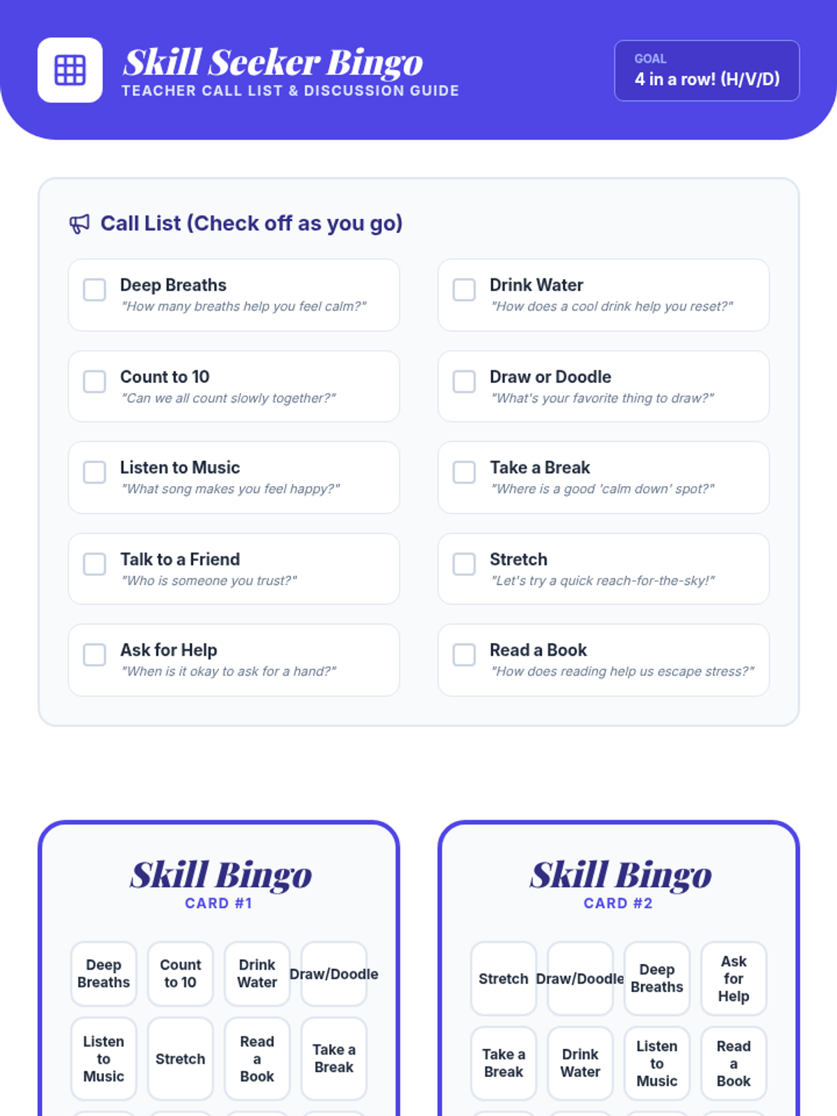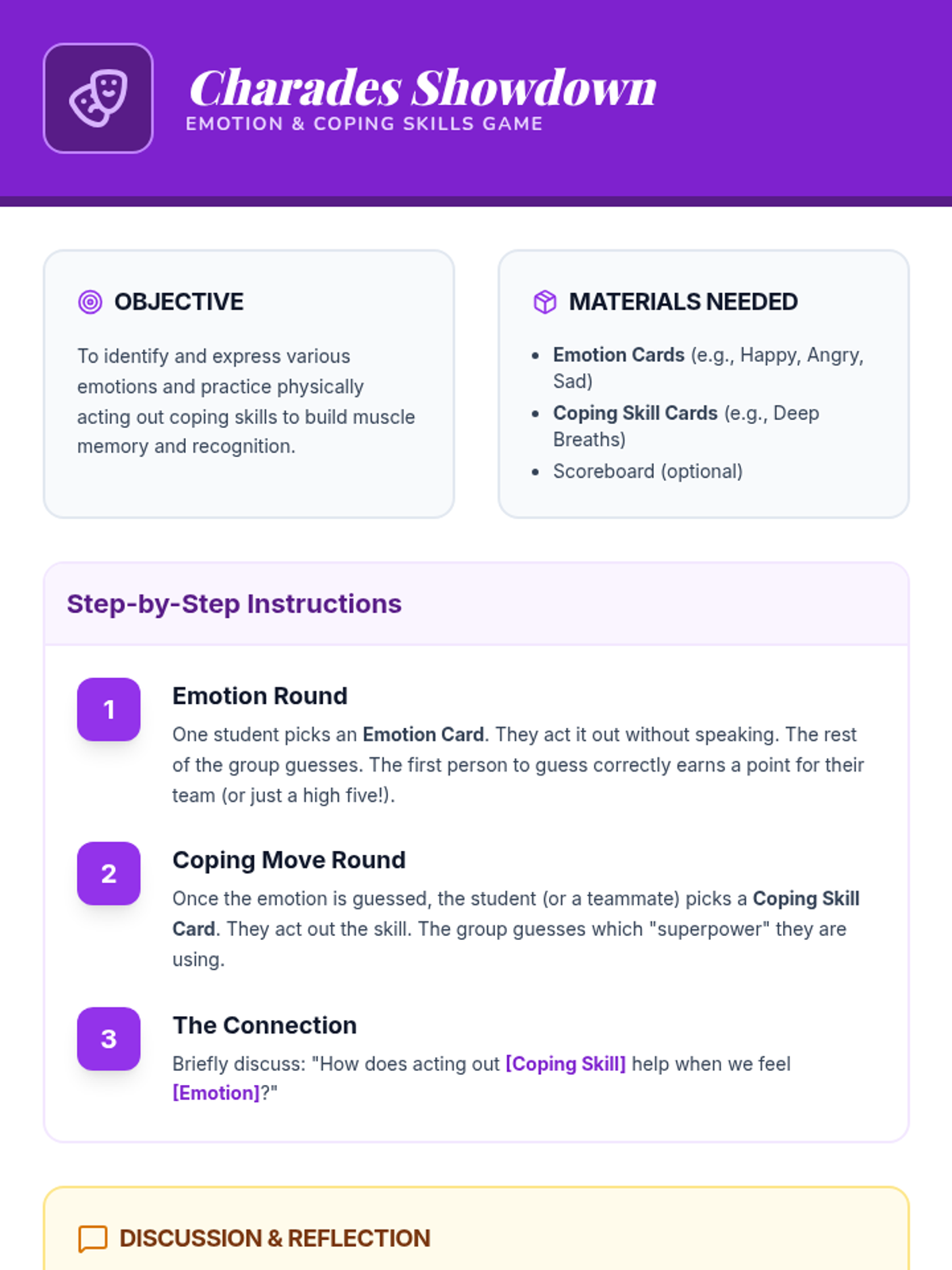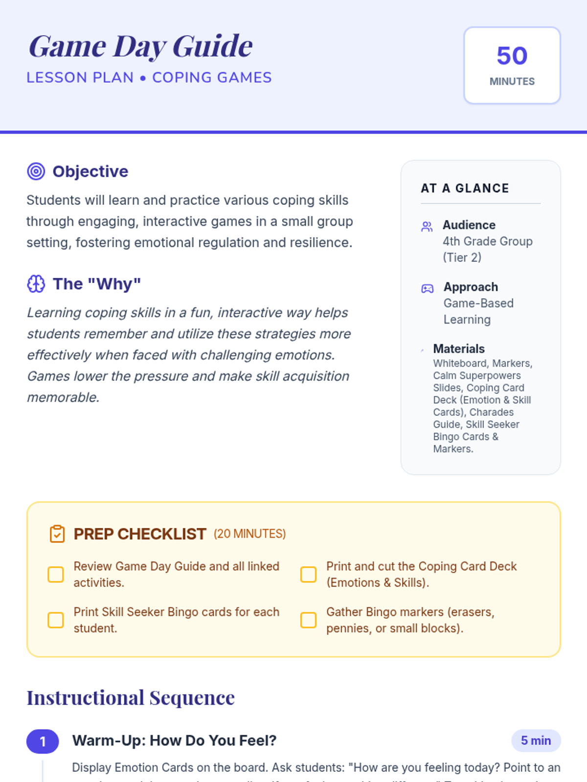 A 50-minute Tier 2 small group lesson for 4th graders that uses interactive games like Charades and Bingo to teach and practice emotional regulation and coping strategies.