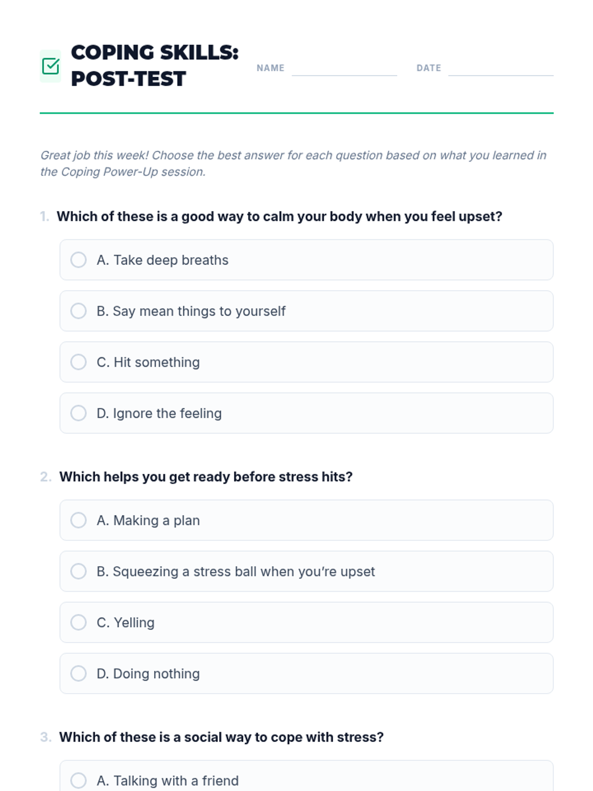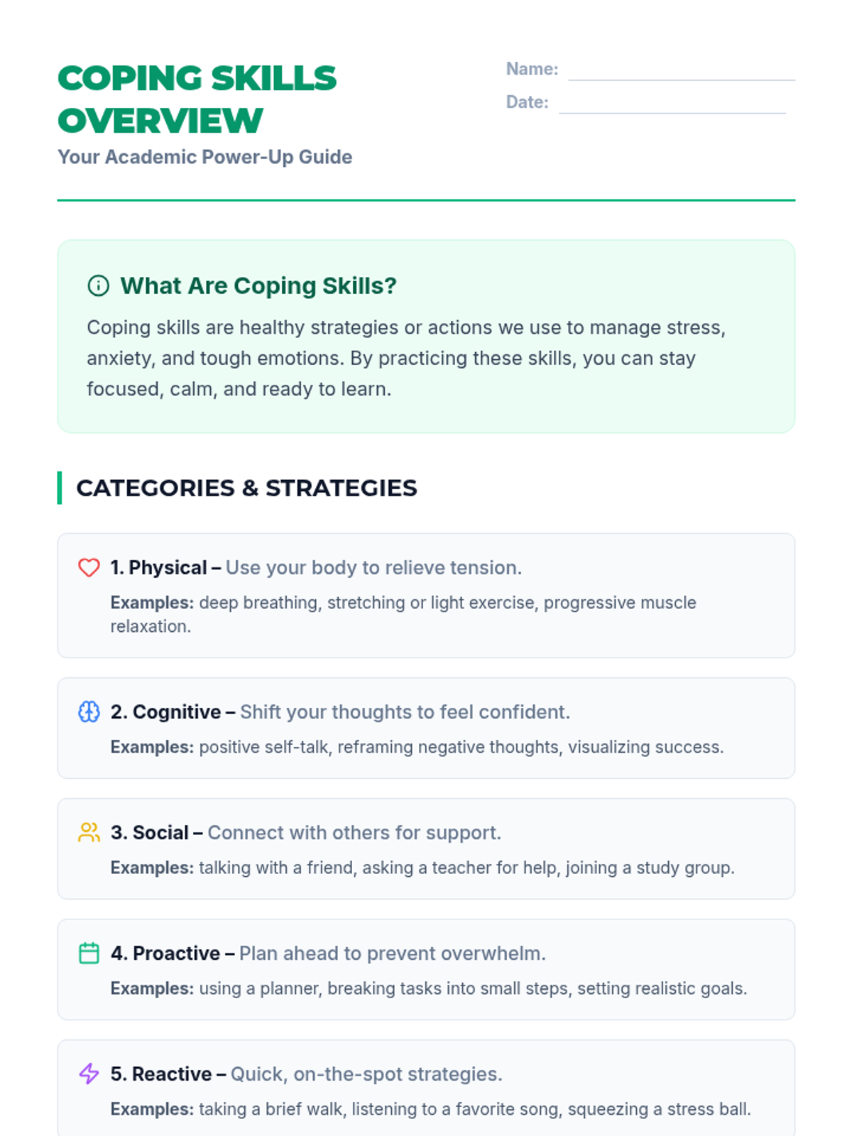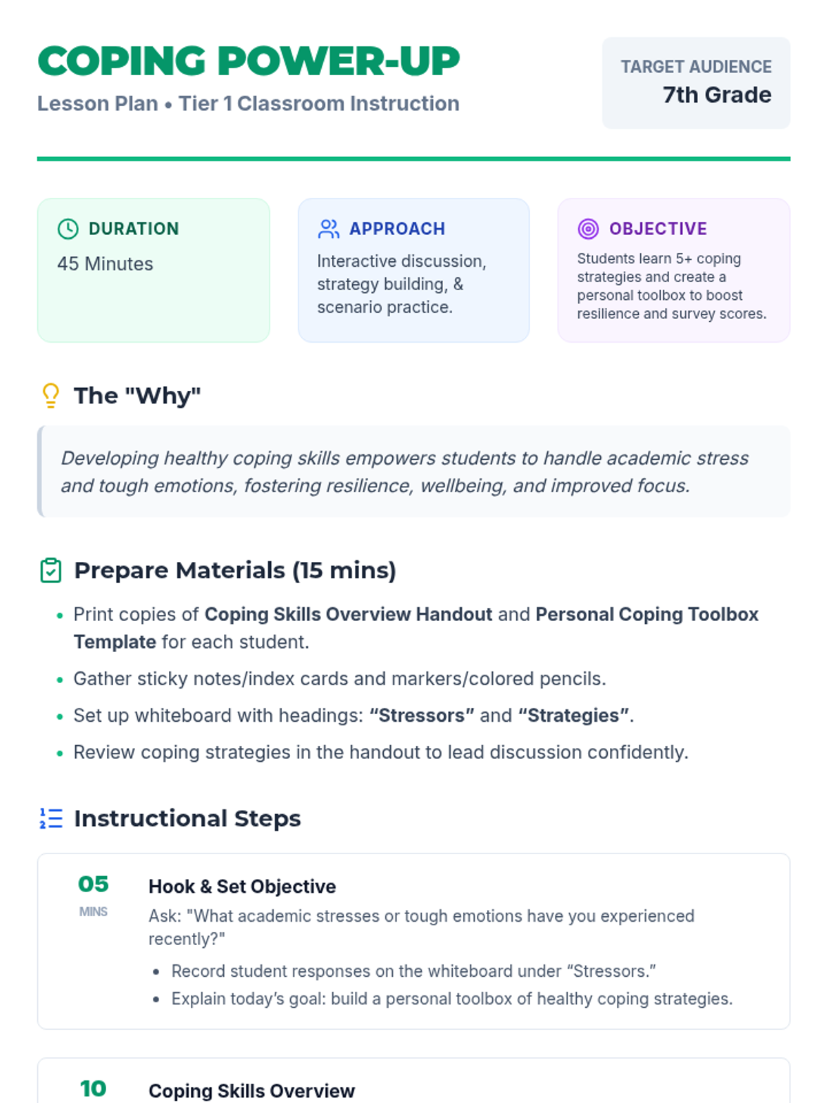 A 45-minute session for 7th graders focused on learning and practicing academic coping skills to manage stress and build emotional resilience. Students will identify personal stressors and build a customized 'toolbox' of strategies across physical, cognitive, social, proactive, and reactive categories.