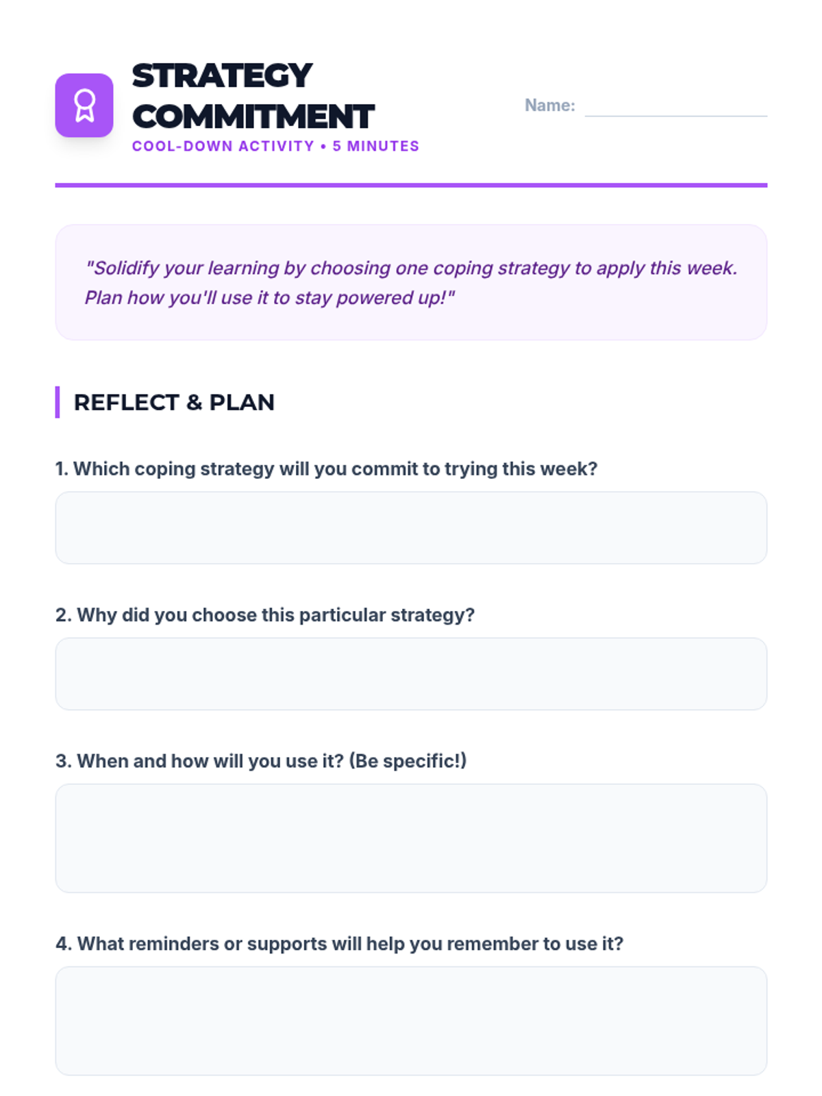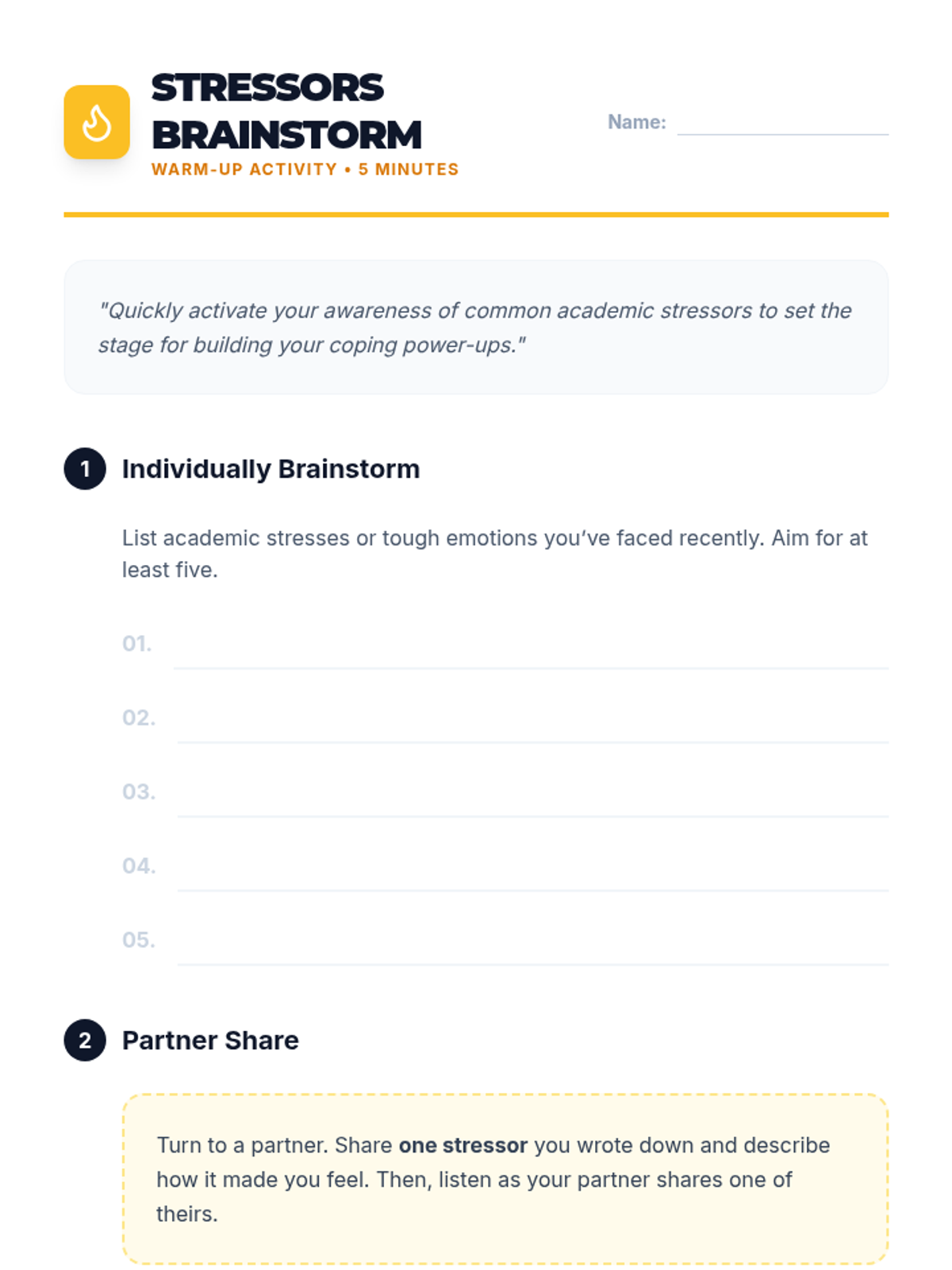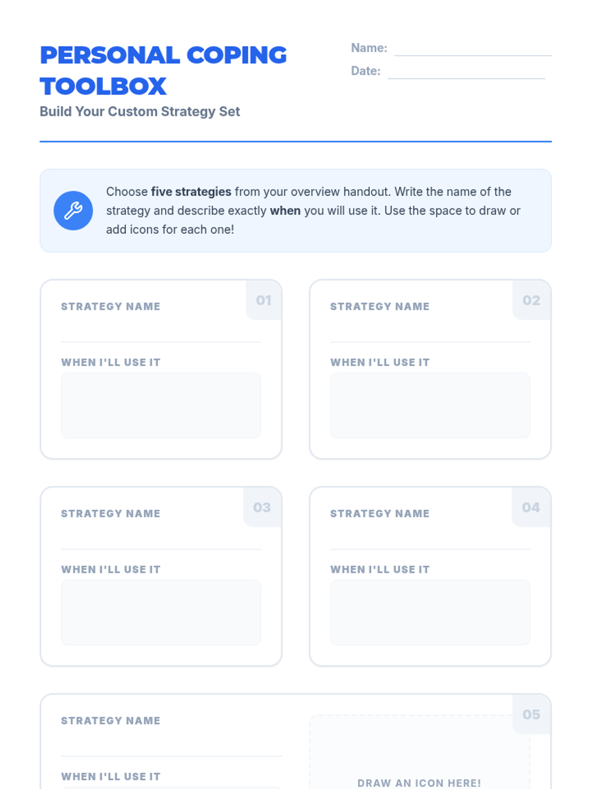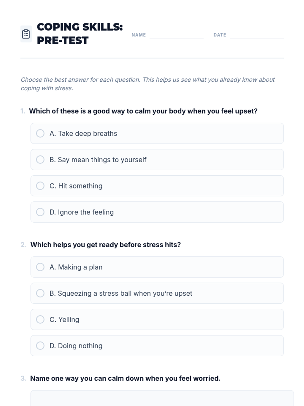 A 45-minute session for 7th graders focused on learning and practicing academic coping skills to manage stress and build emotional resilience. Students will identify personal stressors and build a customized 'toolbox' of strategies across physical, cognitive, social, proactive, and reactive categories.