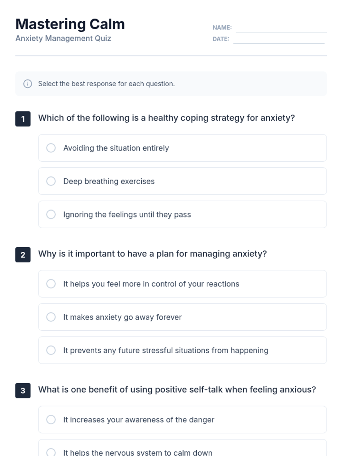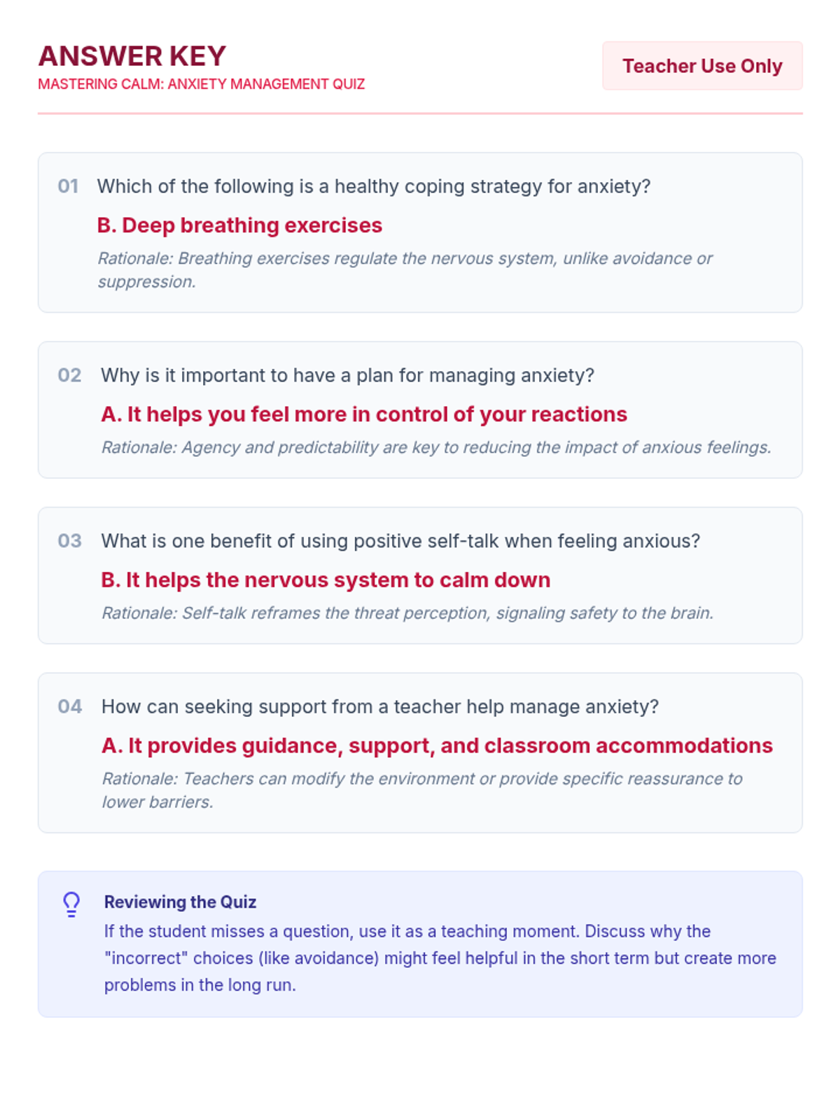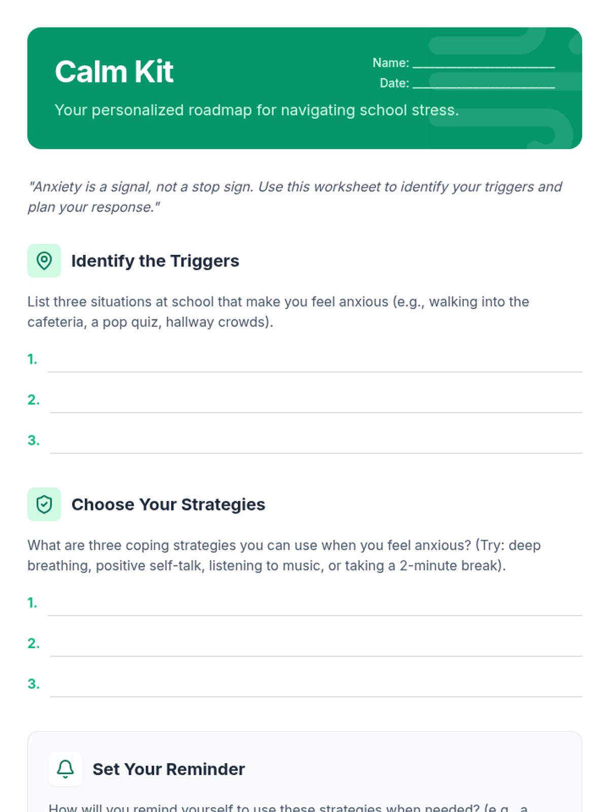 Students will explore a variety of sensory and cognitive coping strategies. They will evaluate which techniques work best for them and begin building their personal 'Coping Menu'.