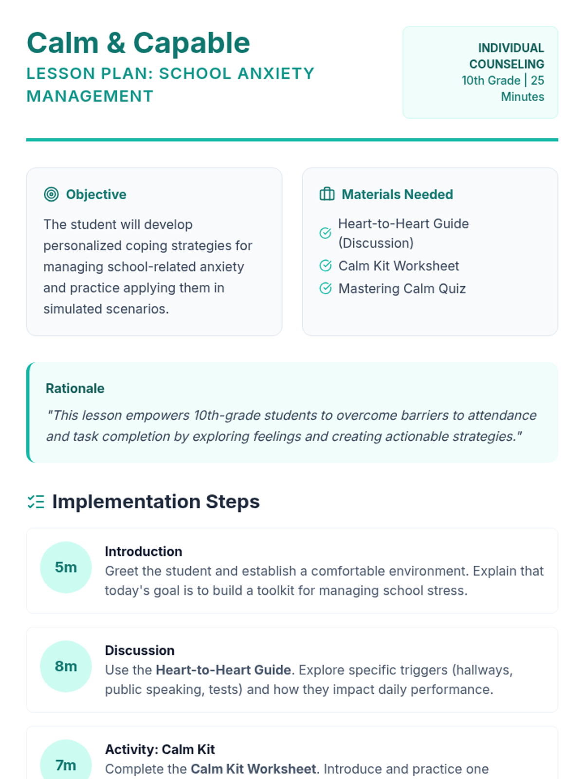 A Tier 3 individual counseling lesson for a 10th-grade student focused on identifying triggers and developing personalized coping strategies for school-related anxiety.