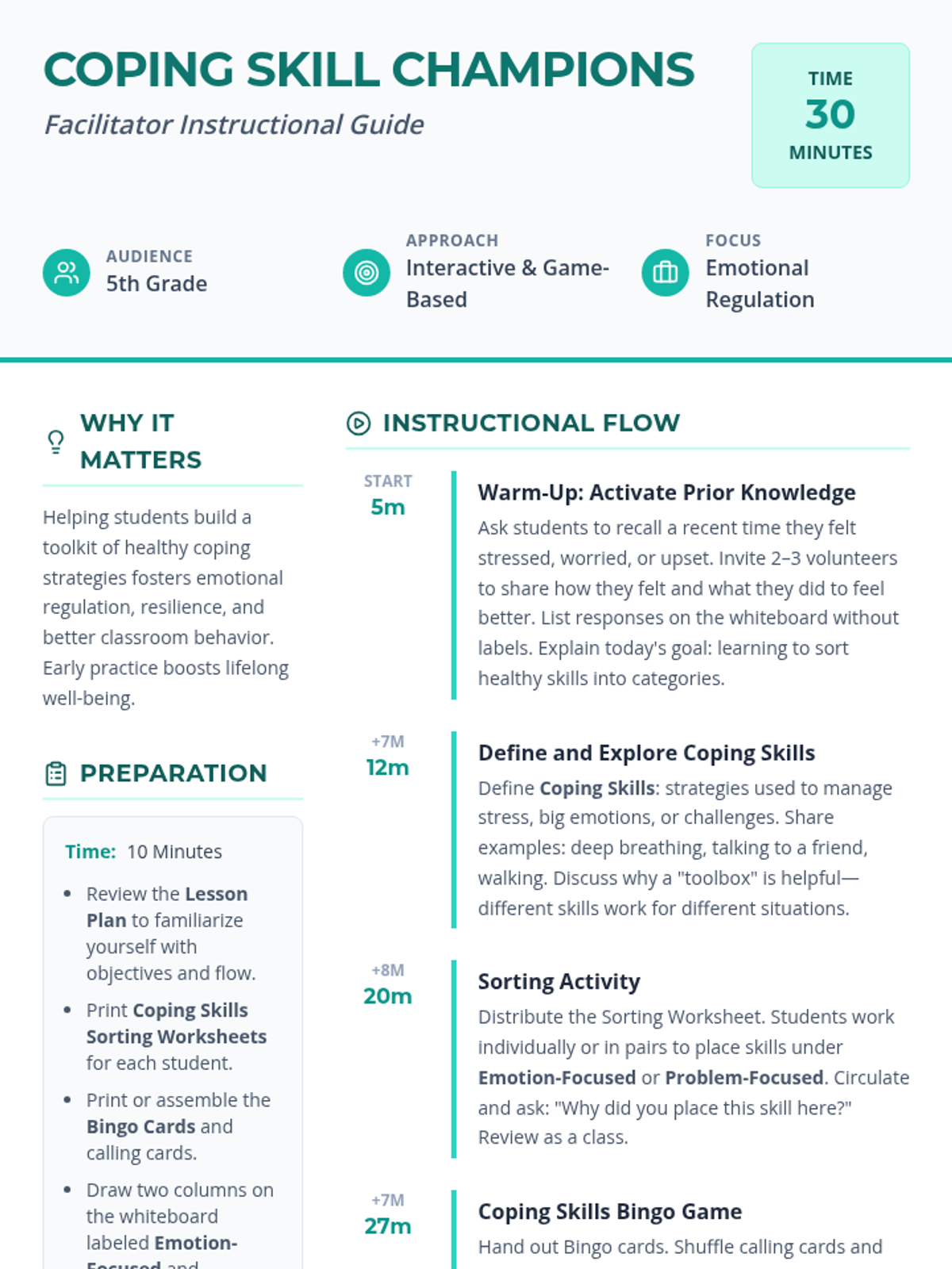 In this 30-minute session for 5th graders, students will learn what coping skills are and why they matter. They’ll explore different types of coping strategies, practice categorizing them, and celebrate their new toolkit with an engaging Coping Skills Bingo game.