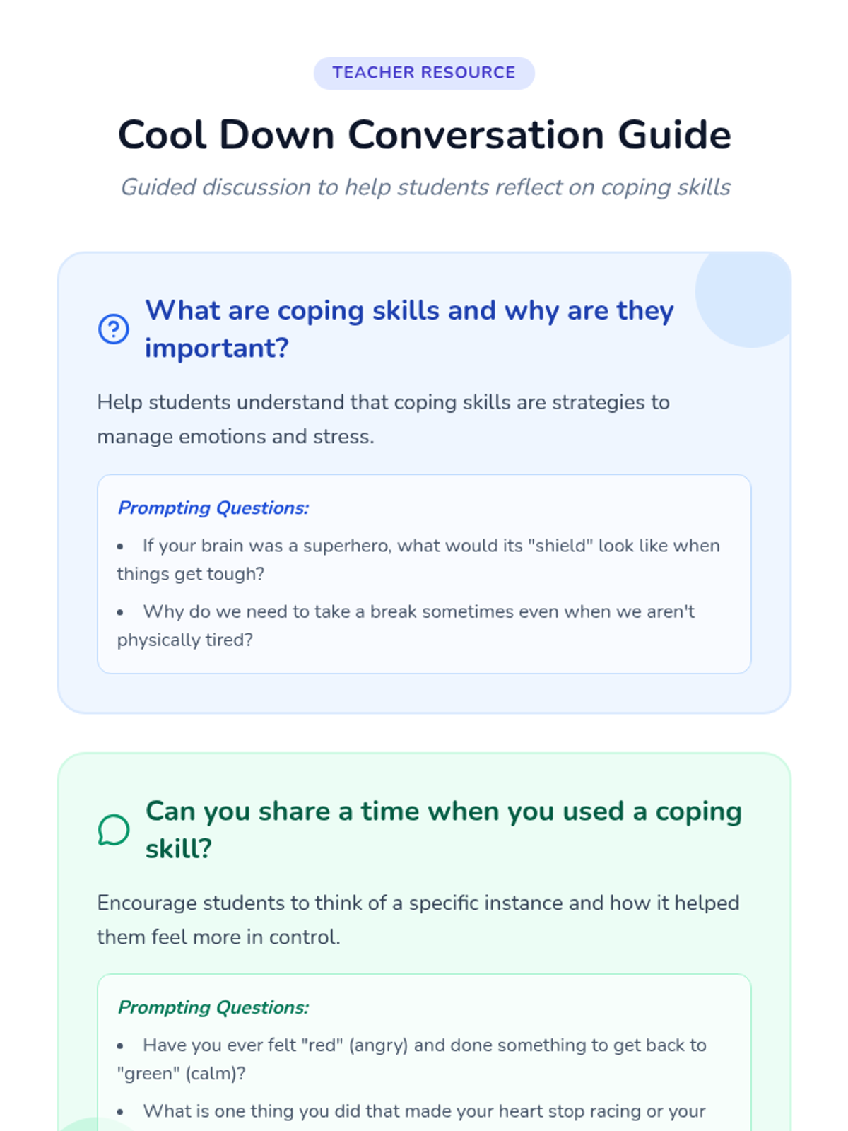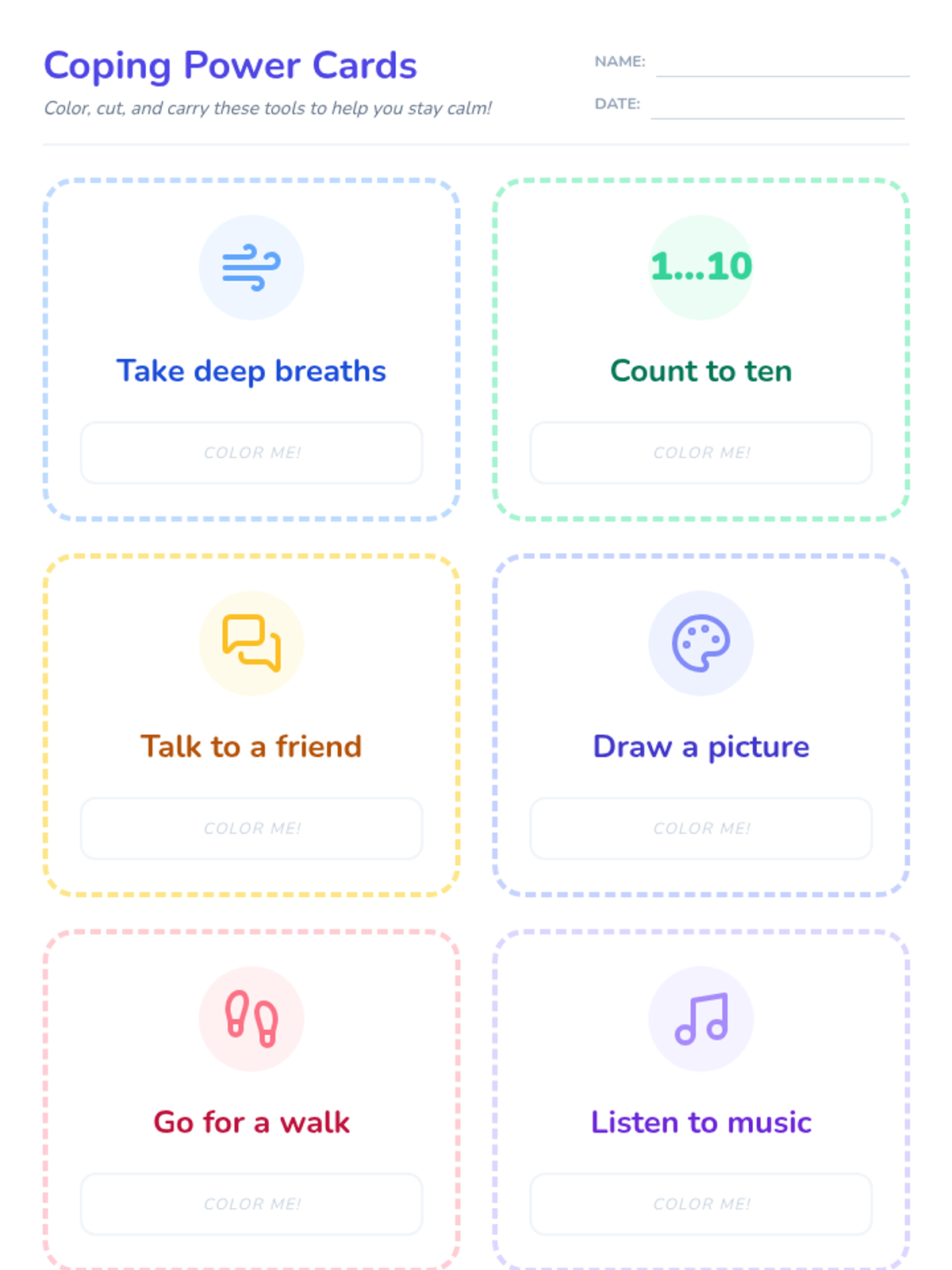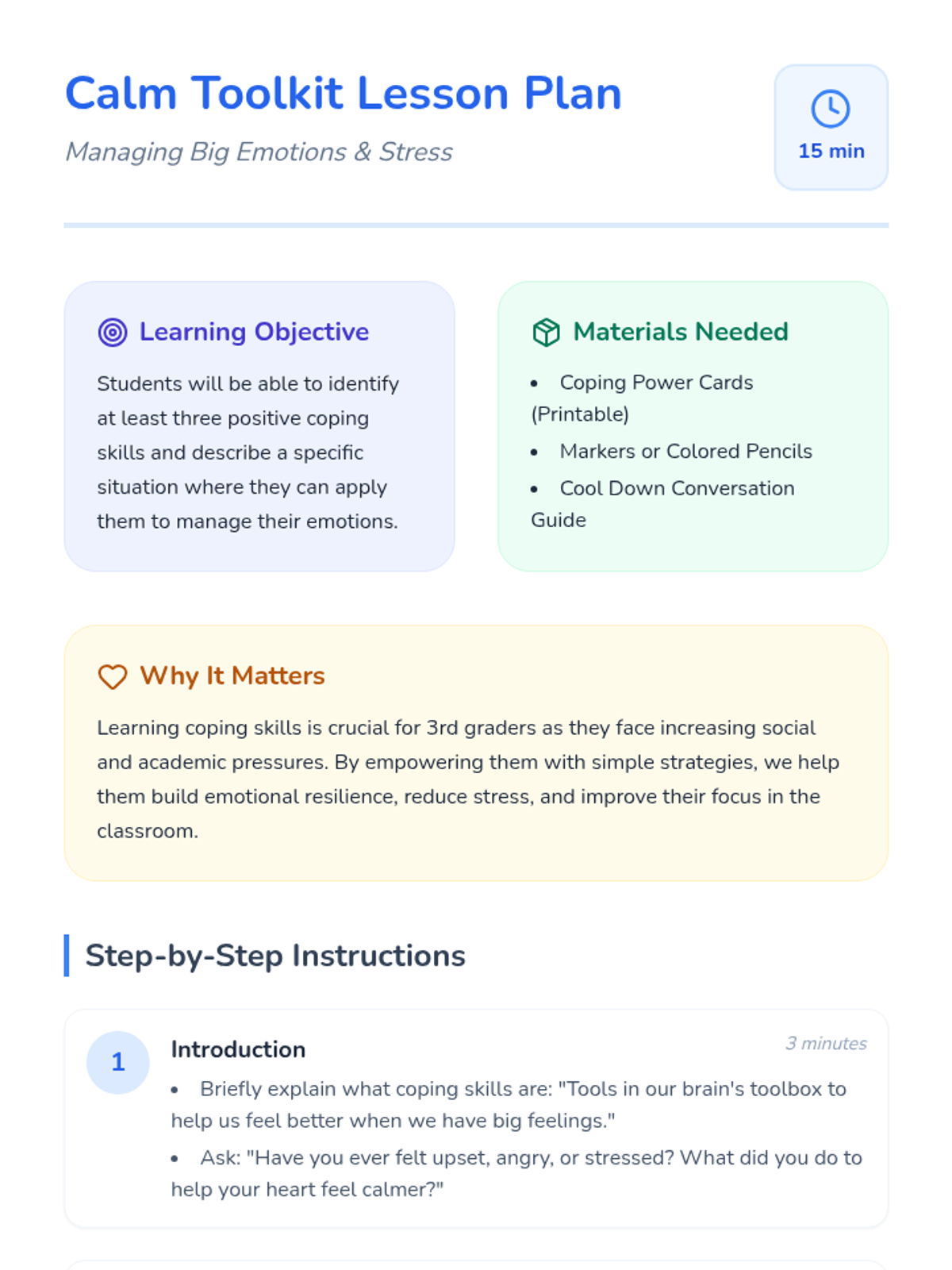 This lesson introduces 3rd graders to basic coping skills through an interactive card-making activity. Students will learn to identify and practice simple strategies for managing stress and big emotions in their daily lives.