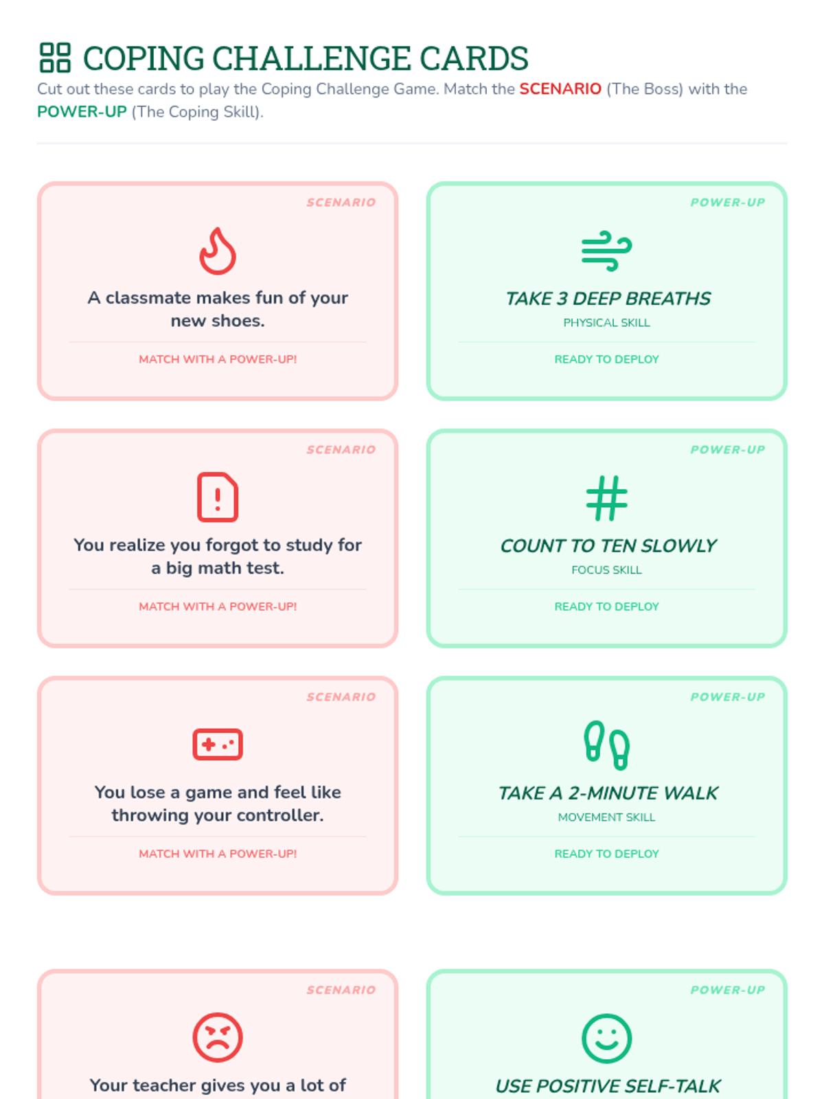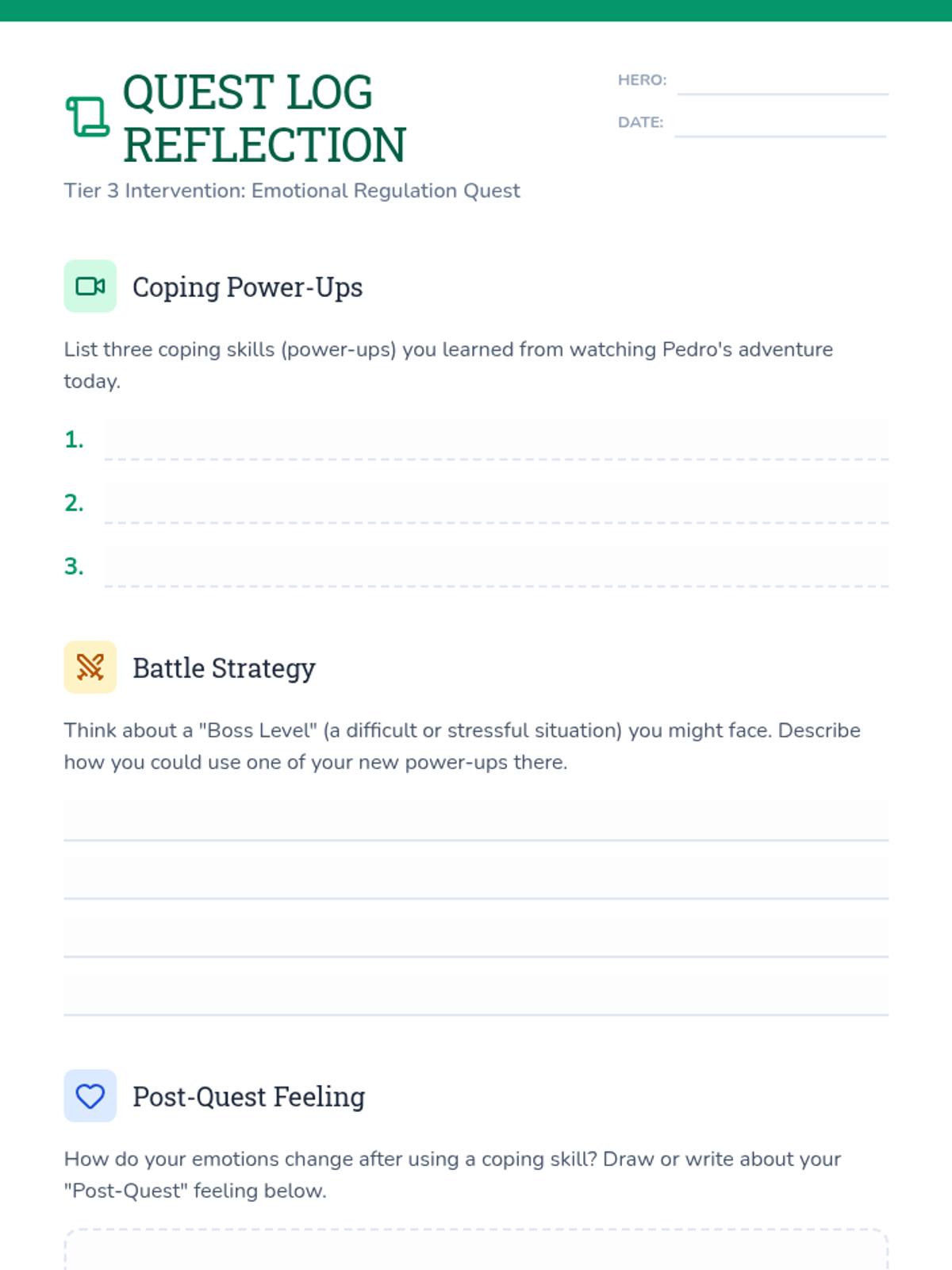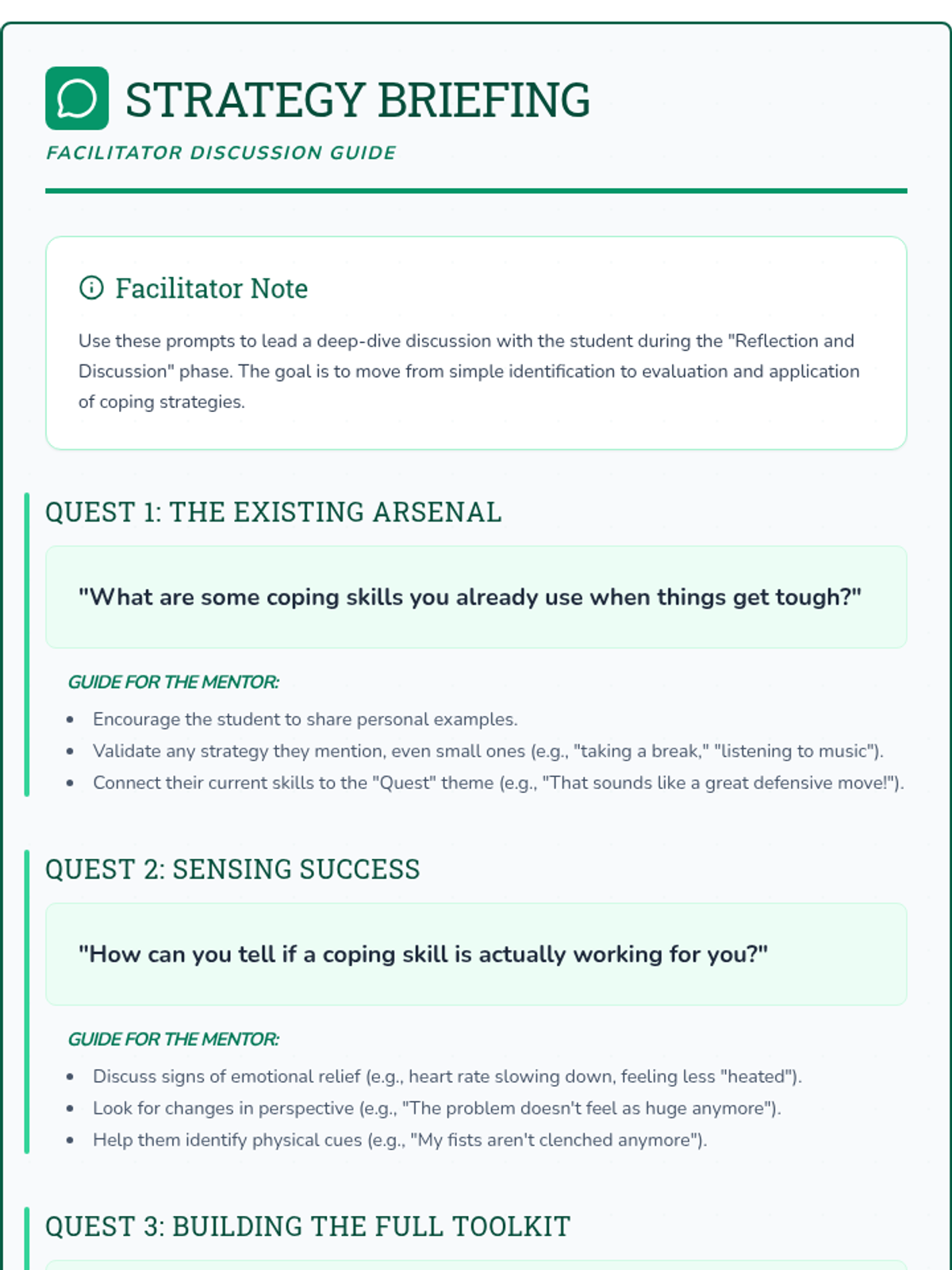This lesson helps a 5th-grade student develop effective coping strategies through game-based and active learning. Over several sessions, the student builds a personalized toolkit of techniques to manage challenging emotions and build resilience.
