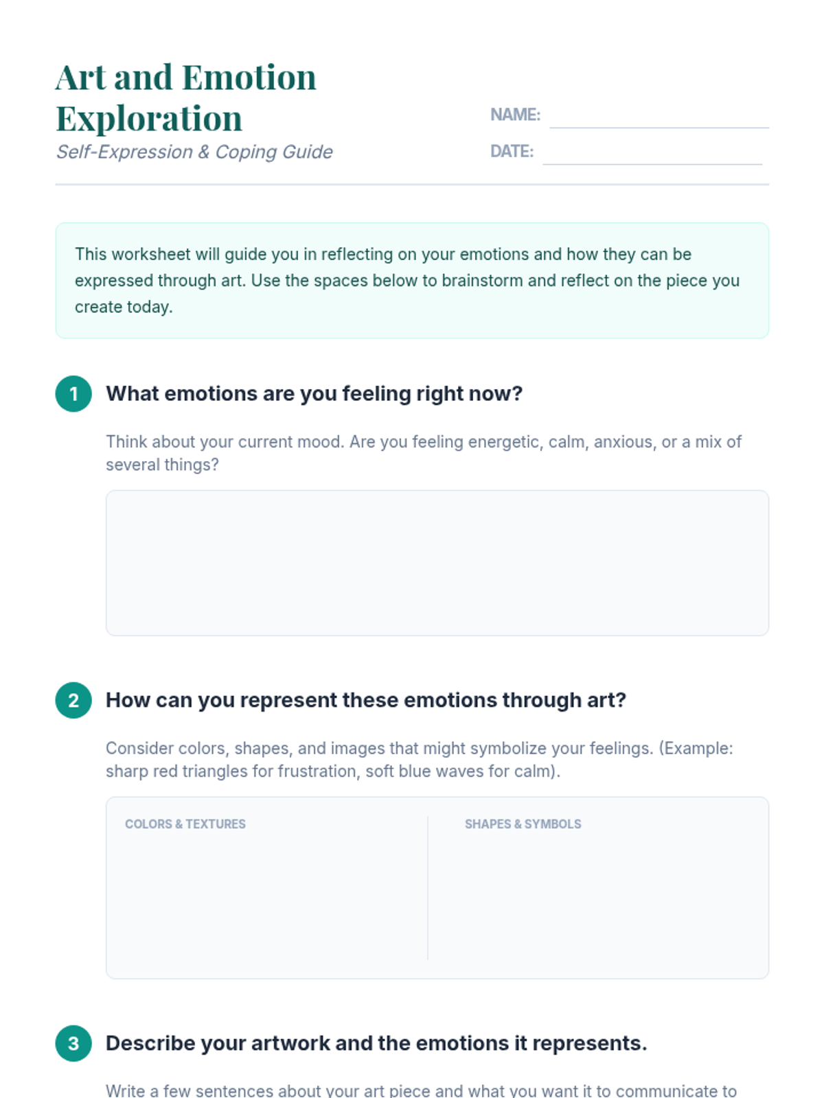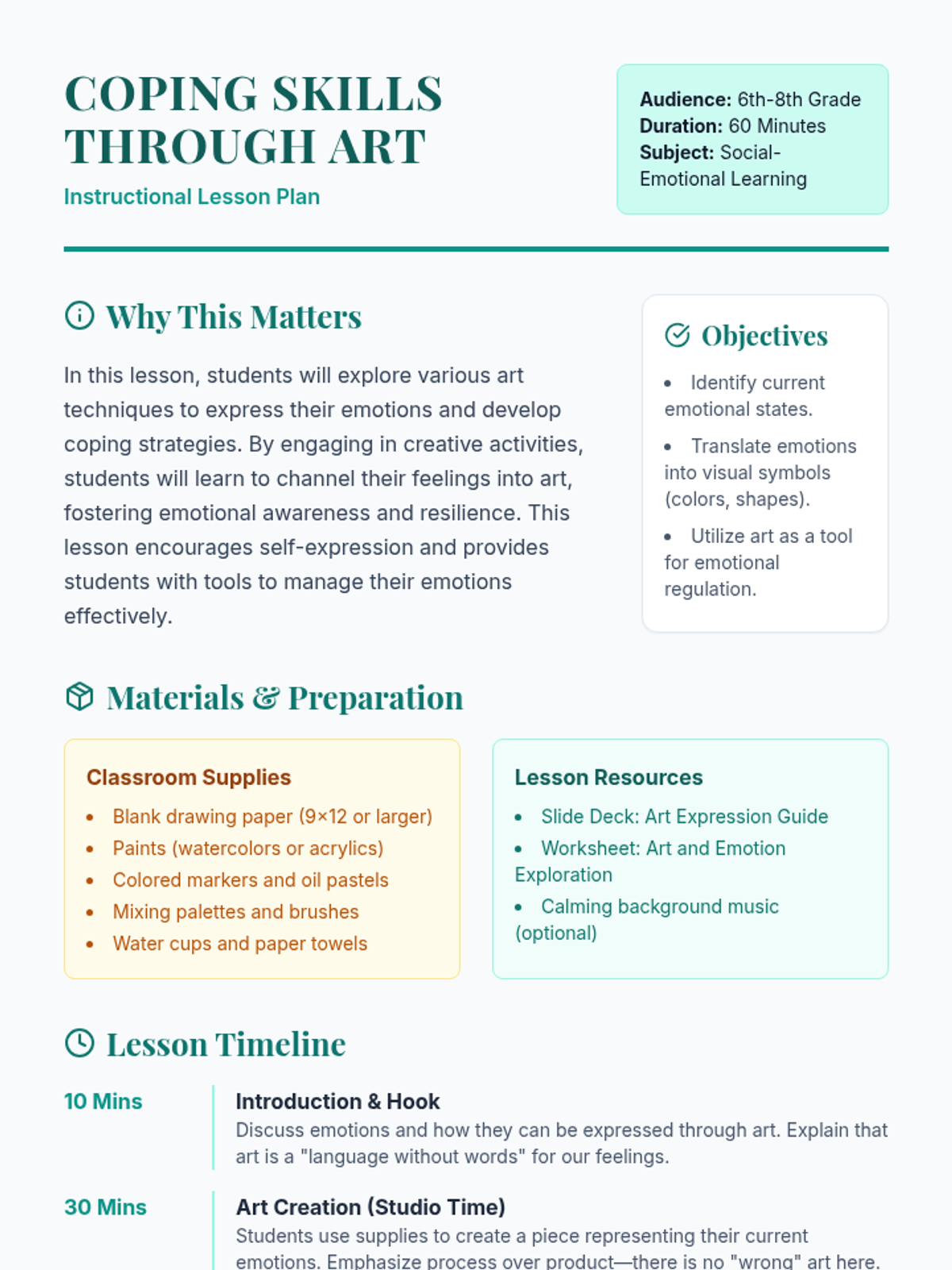 Students explore art as a tool for emotional regulation and self-expression, learning to translate complex feelings into visual representations and developing creative coping strategies.
