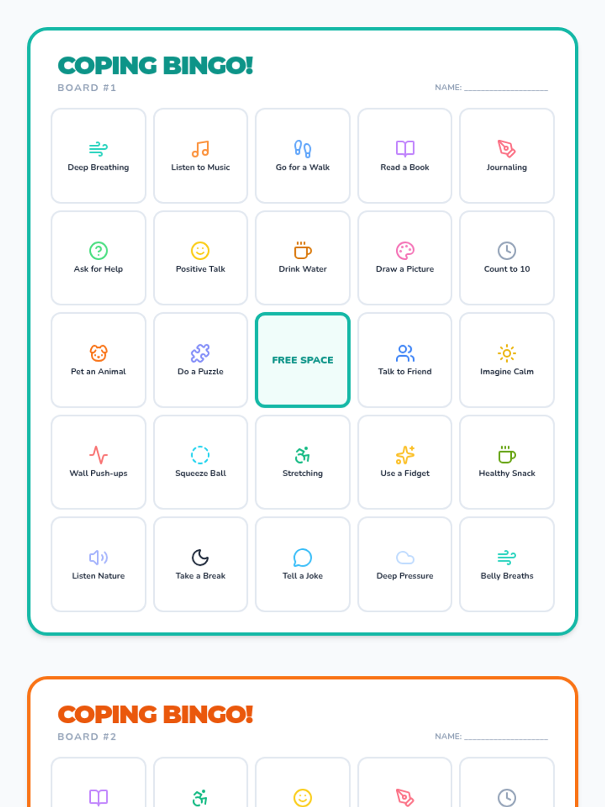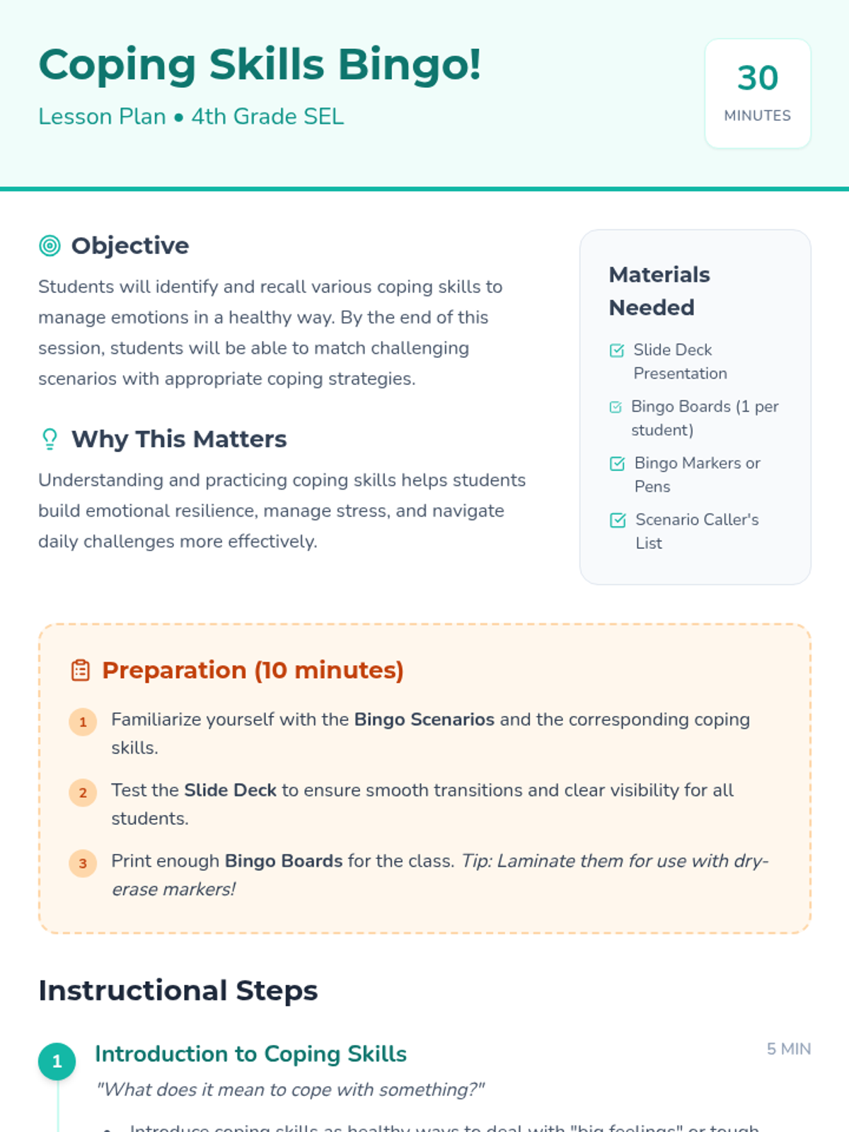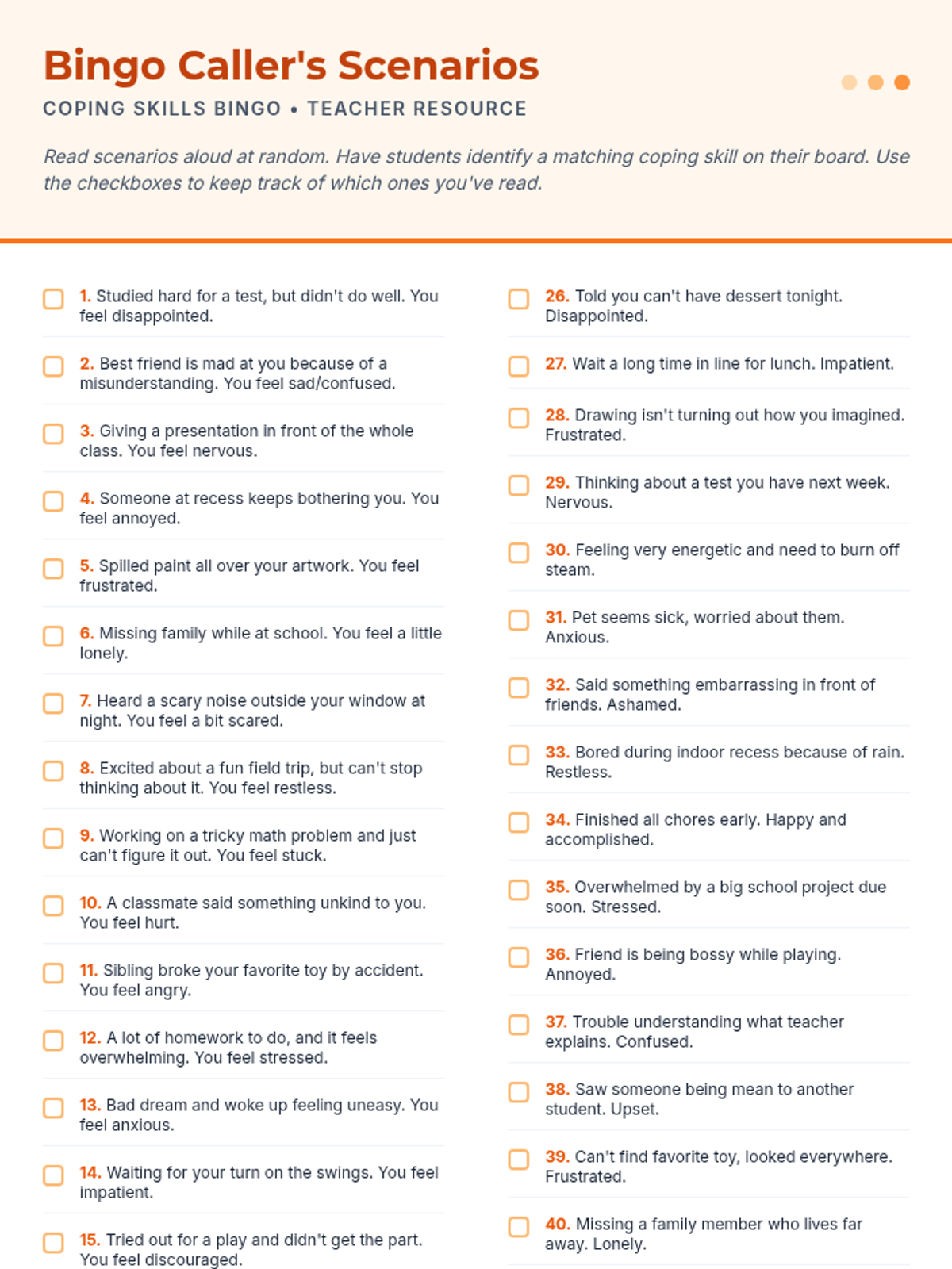 A fun, interactive bingo game for 4th graders to identify and practice coping skills for emotional resilience. Students will match real-life scenarios to healthy coping strategies.