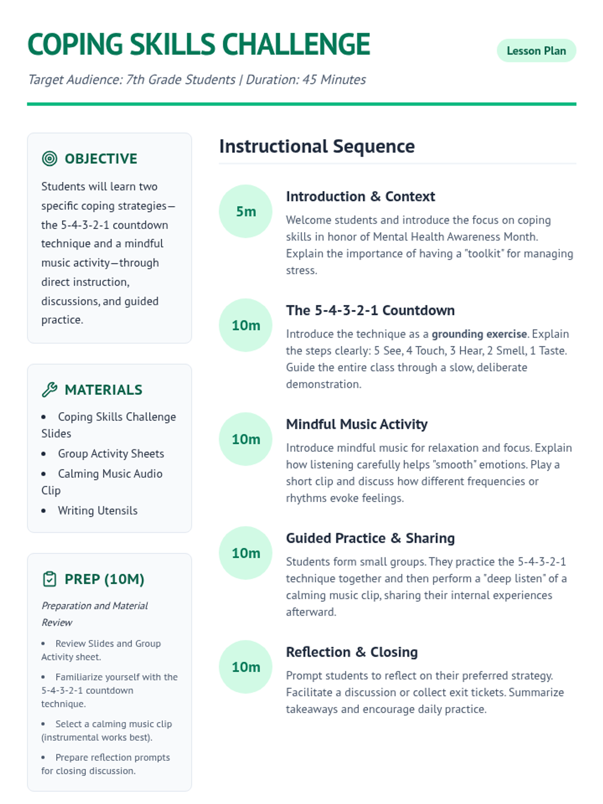 A 45-minute lesson for 7th graders focusing on grounding techniques like the 5-4-3-2-1 countdown and mindful music to manage stress and anxiety.