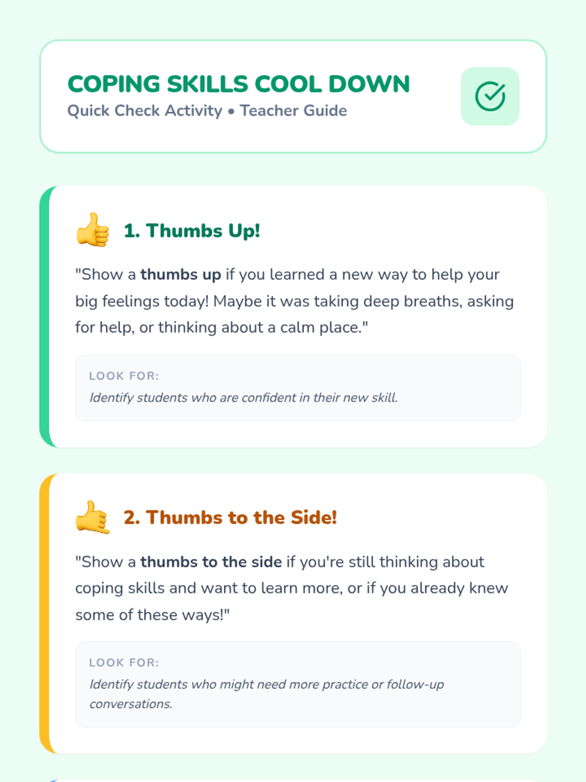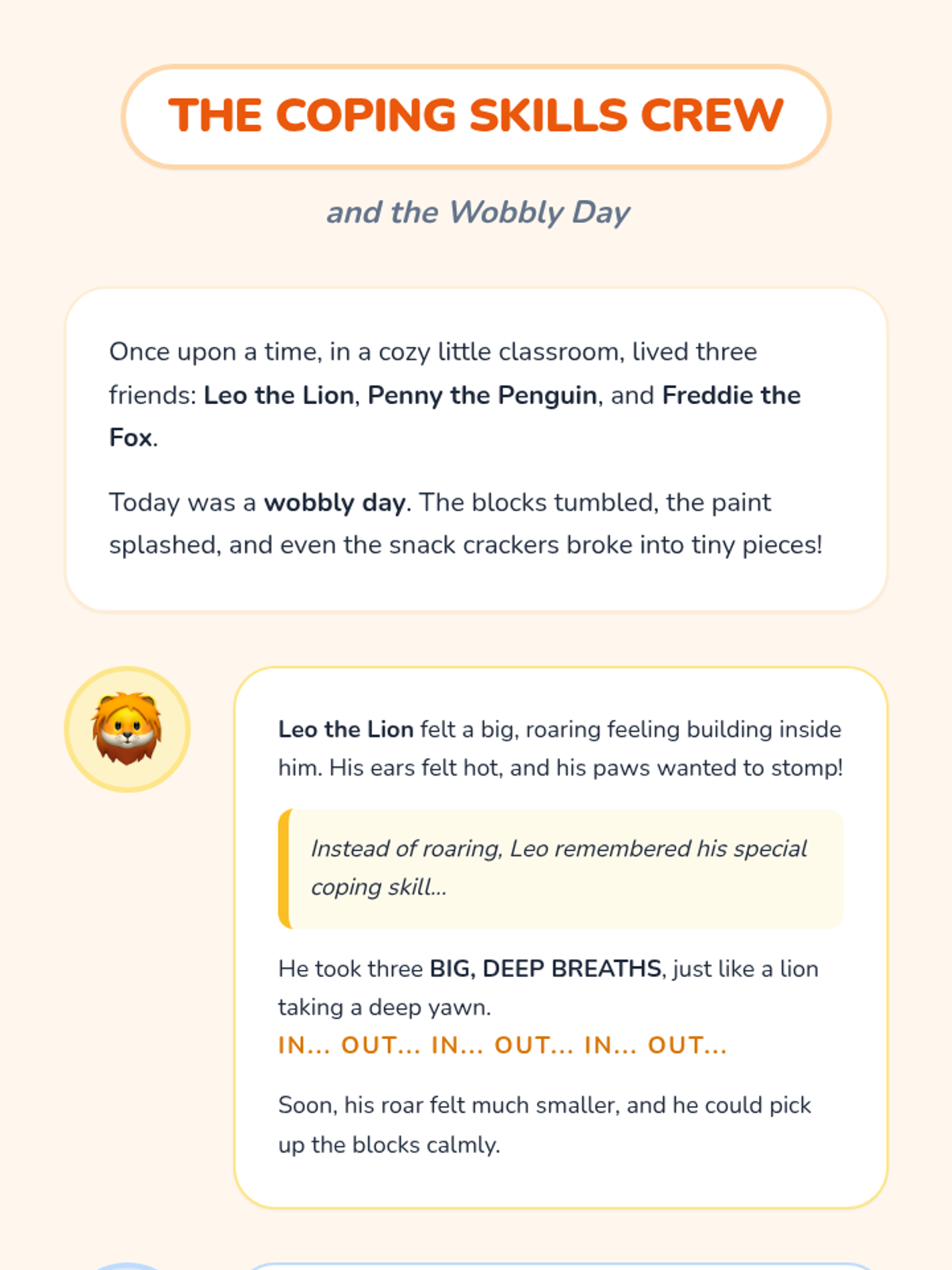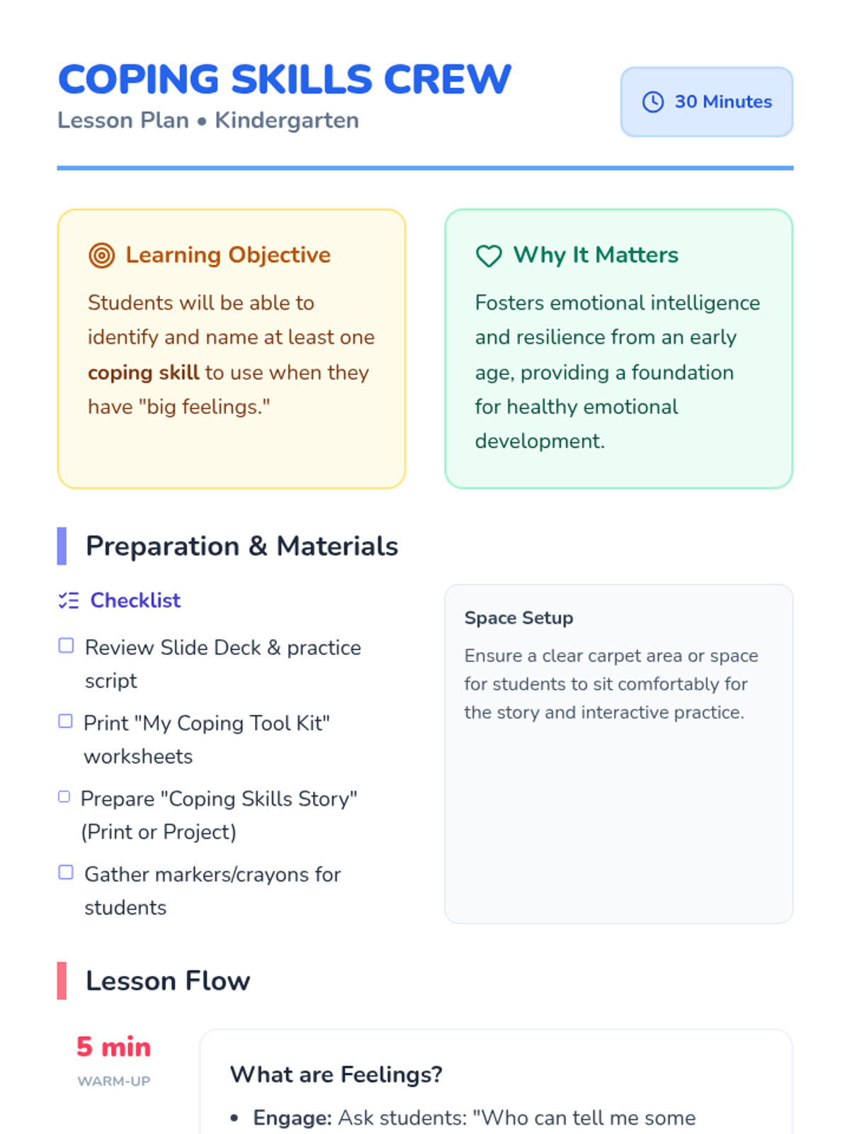 A 30-minute Kindergarten lesson introducing coping skills through the story of the Coping Skills Crew, helping students identify tools to manage big feelings.
