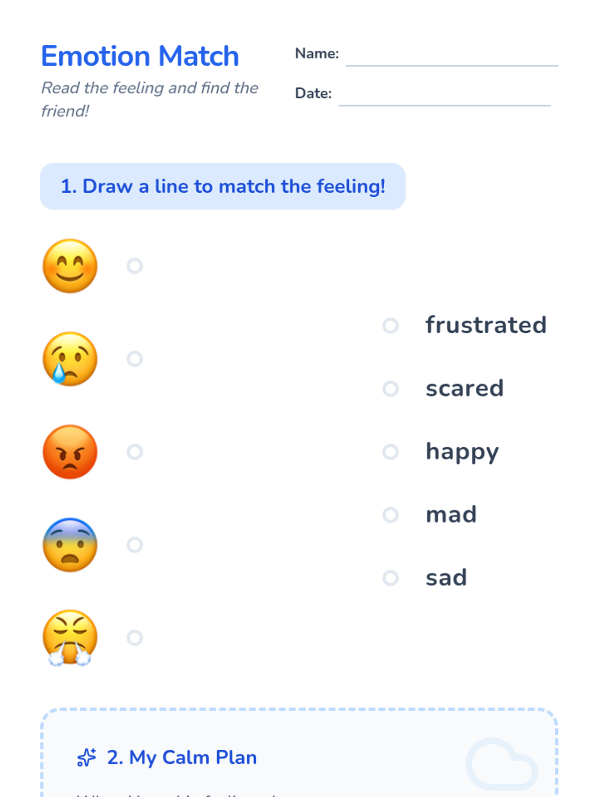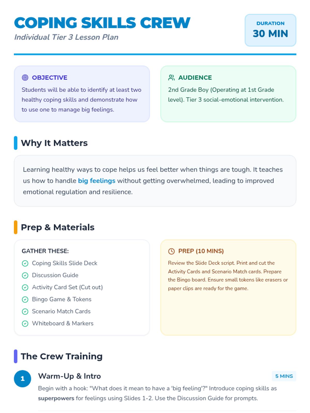 A 30-minute individual Tier 3 lesson for a 2nd-grade student to identify and practice healthy coping skills for emotional regulation.