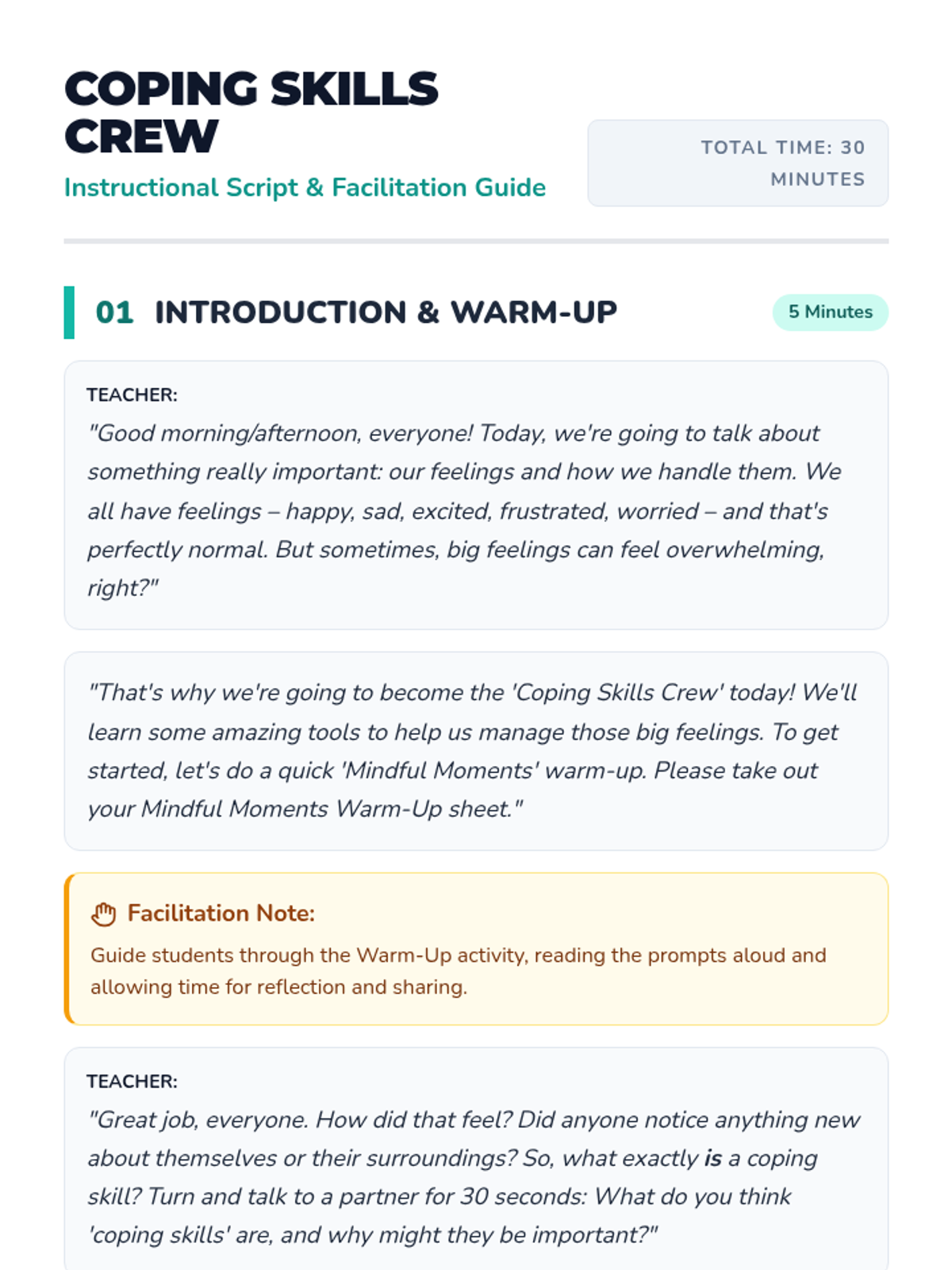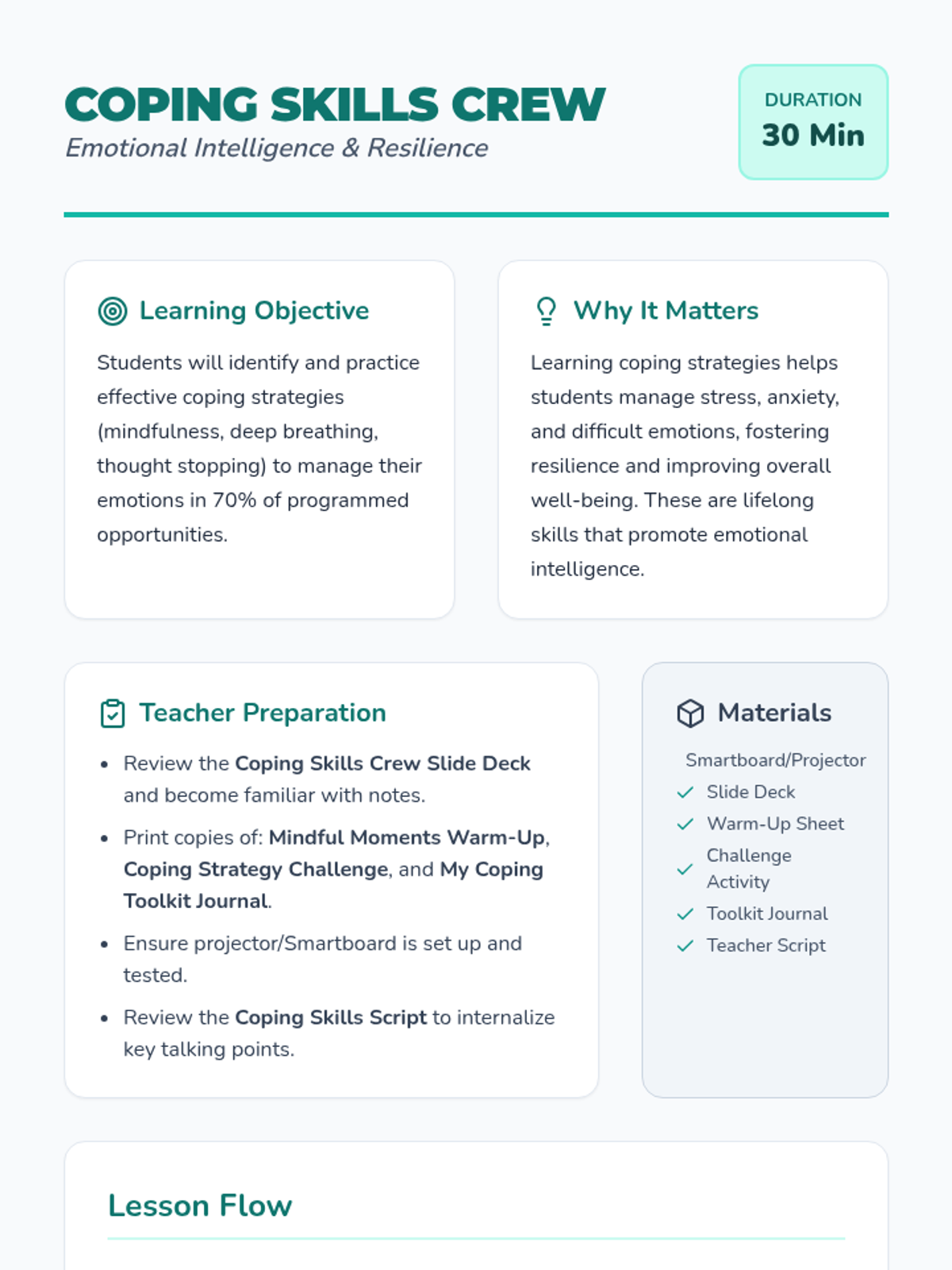 A 30-minute social-emotional learning lesson for 4th graders that teaches mindfulness, deep breathing, and thought-stopping techniques to manage emotions. Students learn to 'ride the waves' of their feelings using a personal coping toolkit.