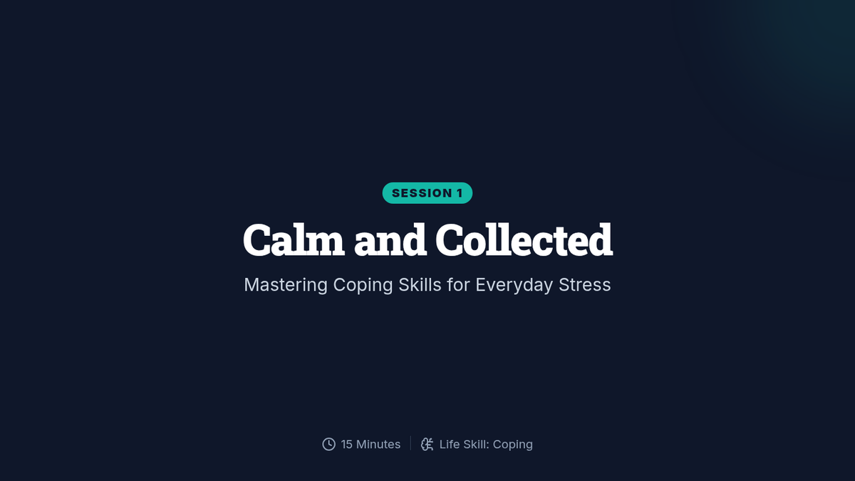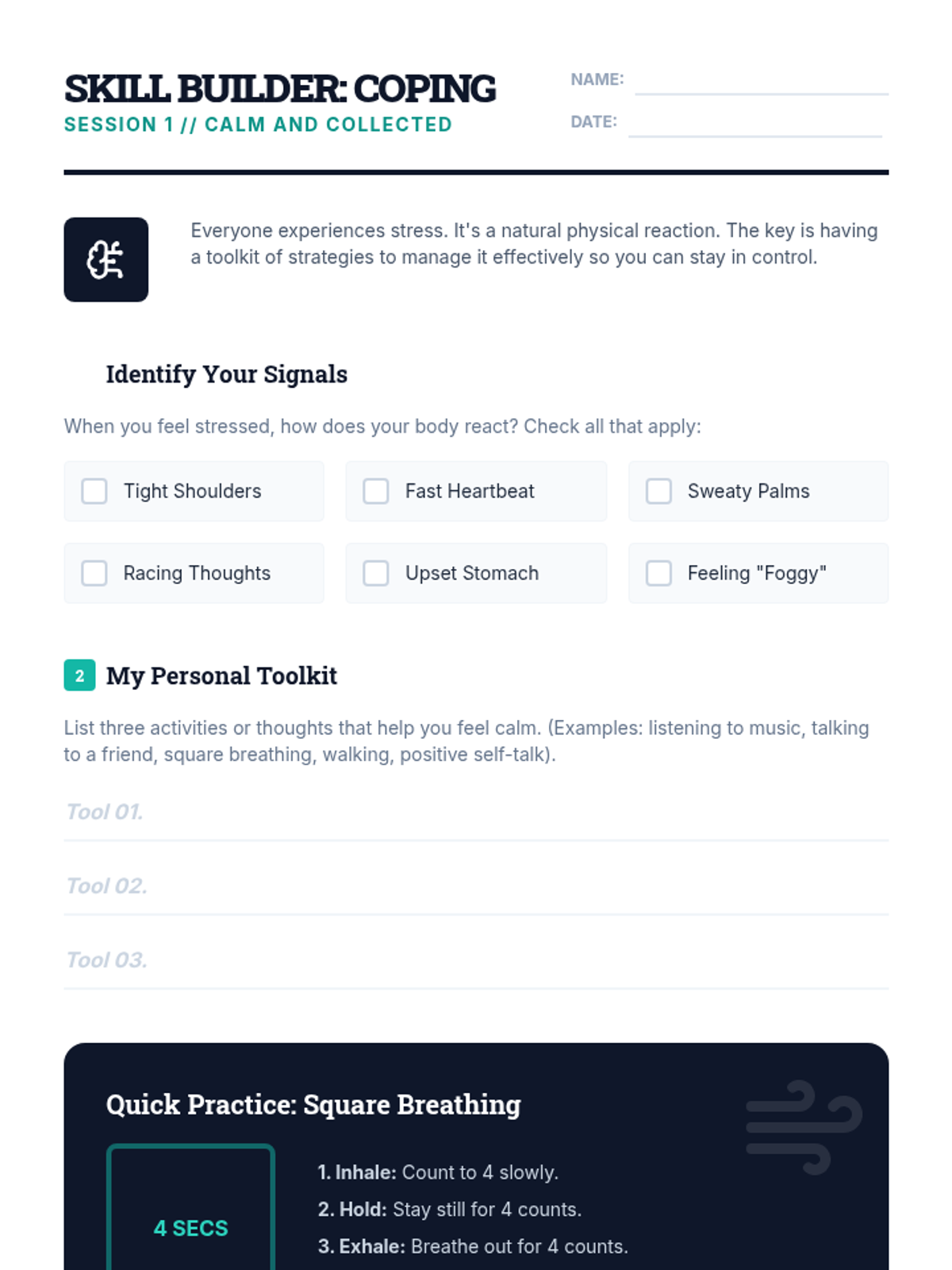 Students learn to identify stressors and practice immediate coping strategies like deep breathing and positive self-talk.
