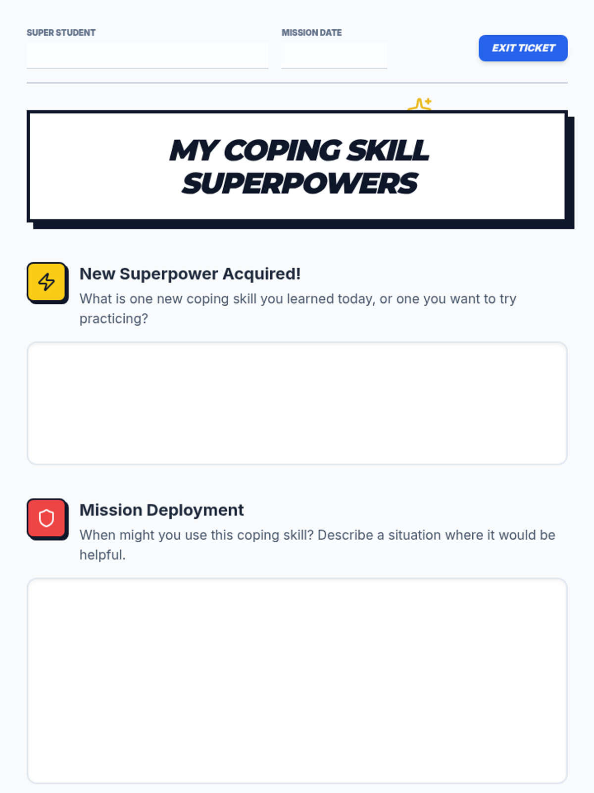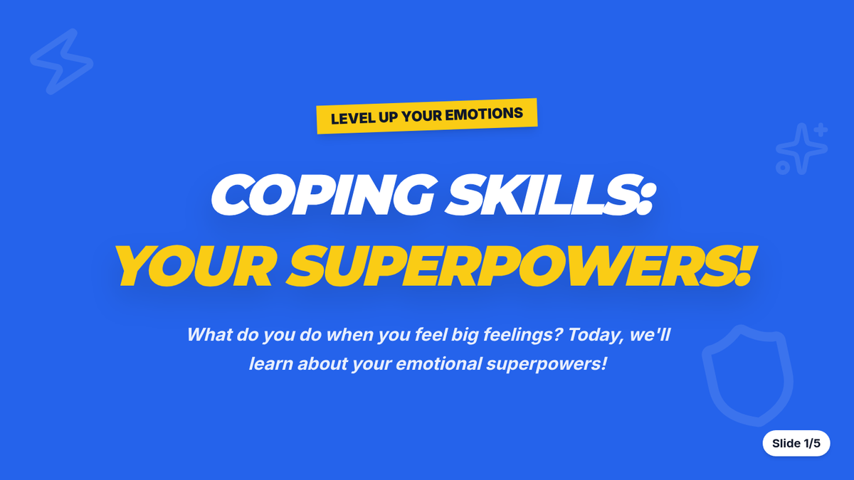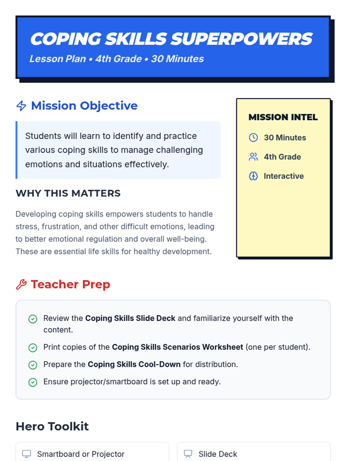 A 30-minute interactive lesson for 4th graders that introduces coping skills as emotional 'superpowers.' Students learn to identify and apply healthy strategies to manage challenging emotions through discussion and scenario-based practice.