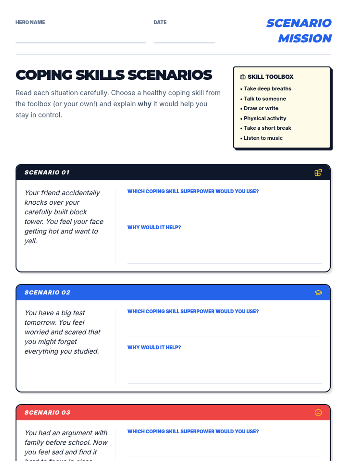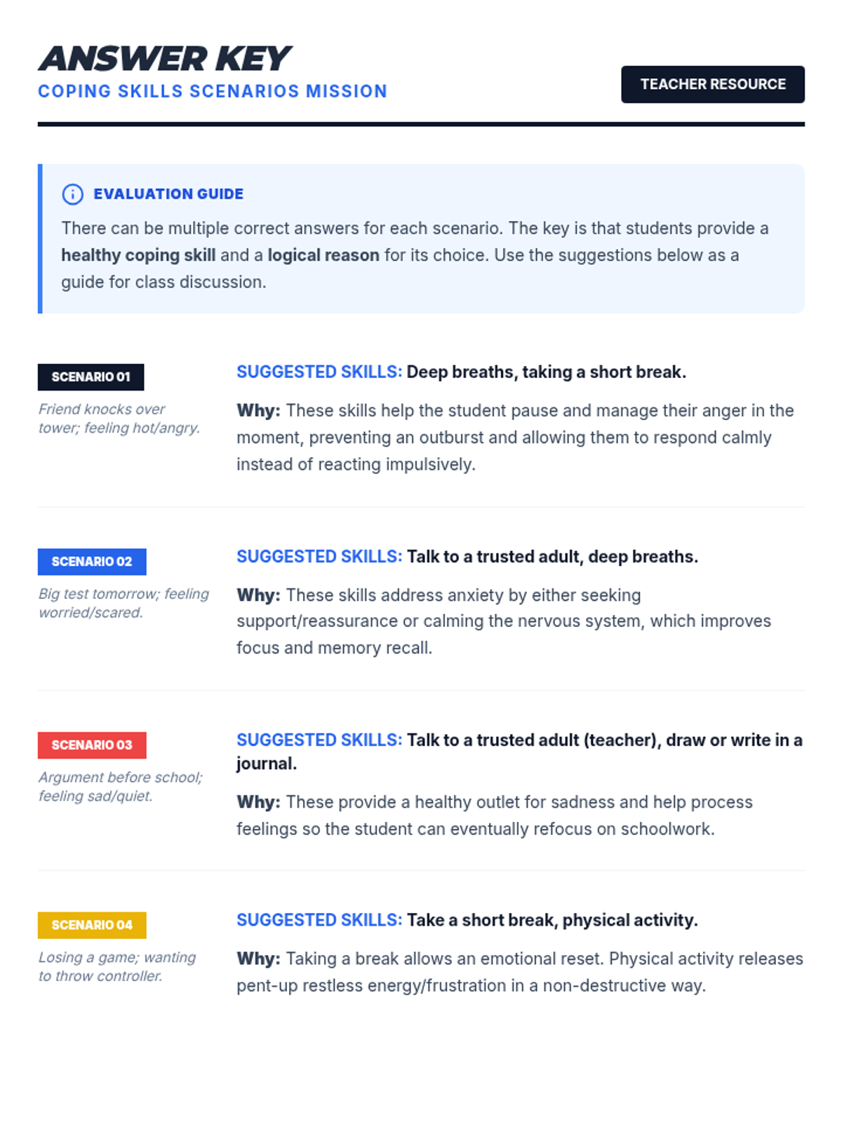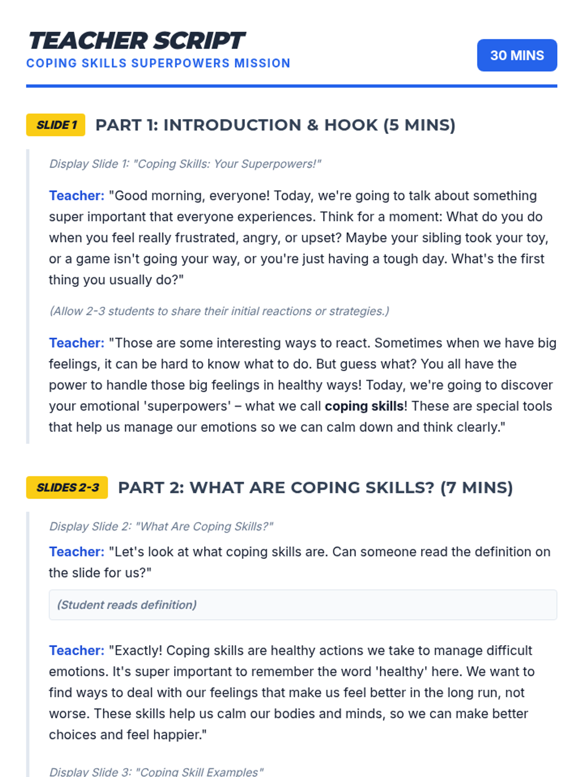 A 30-minute interactive lesson for 4th graders that introduces coping skills as emotional 'superpowers.' Students learn to identify and apply healthy strategies to manage challenging emotions through discussion and scenario-based practice.
