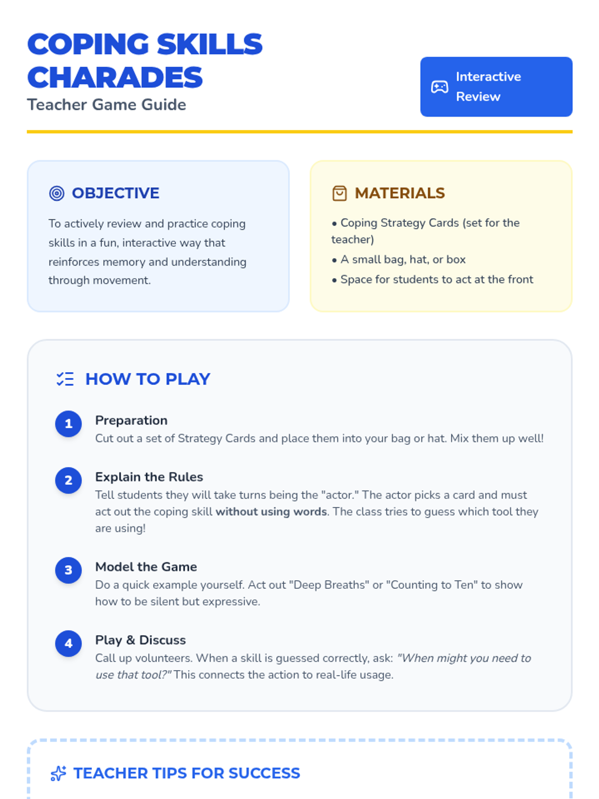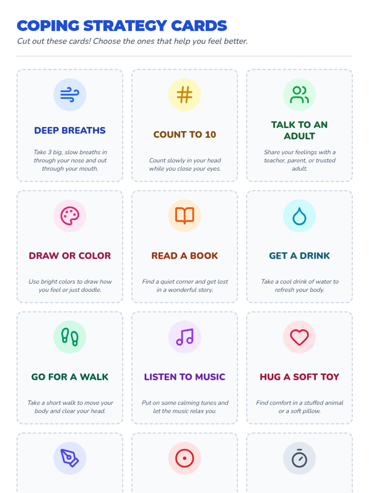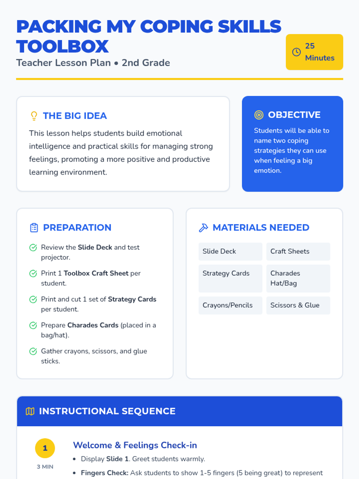A 20-minute lesson for 2nd-grade students to identify and practice coping strategies for big emotions by creating a personal 'Coping Skills Toolbox.'