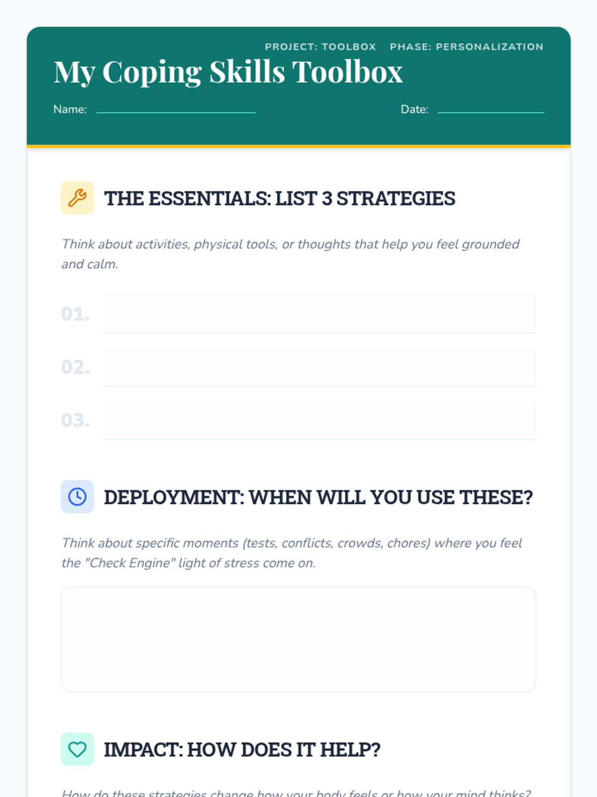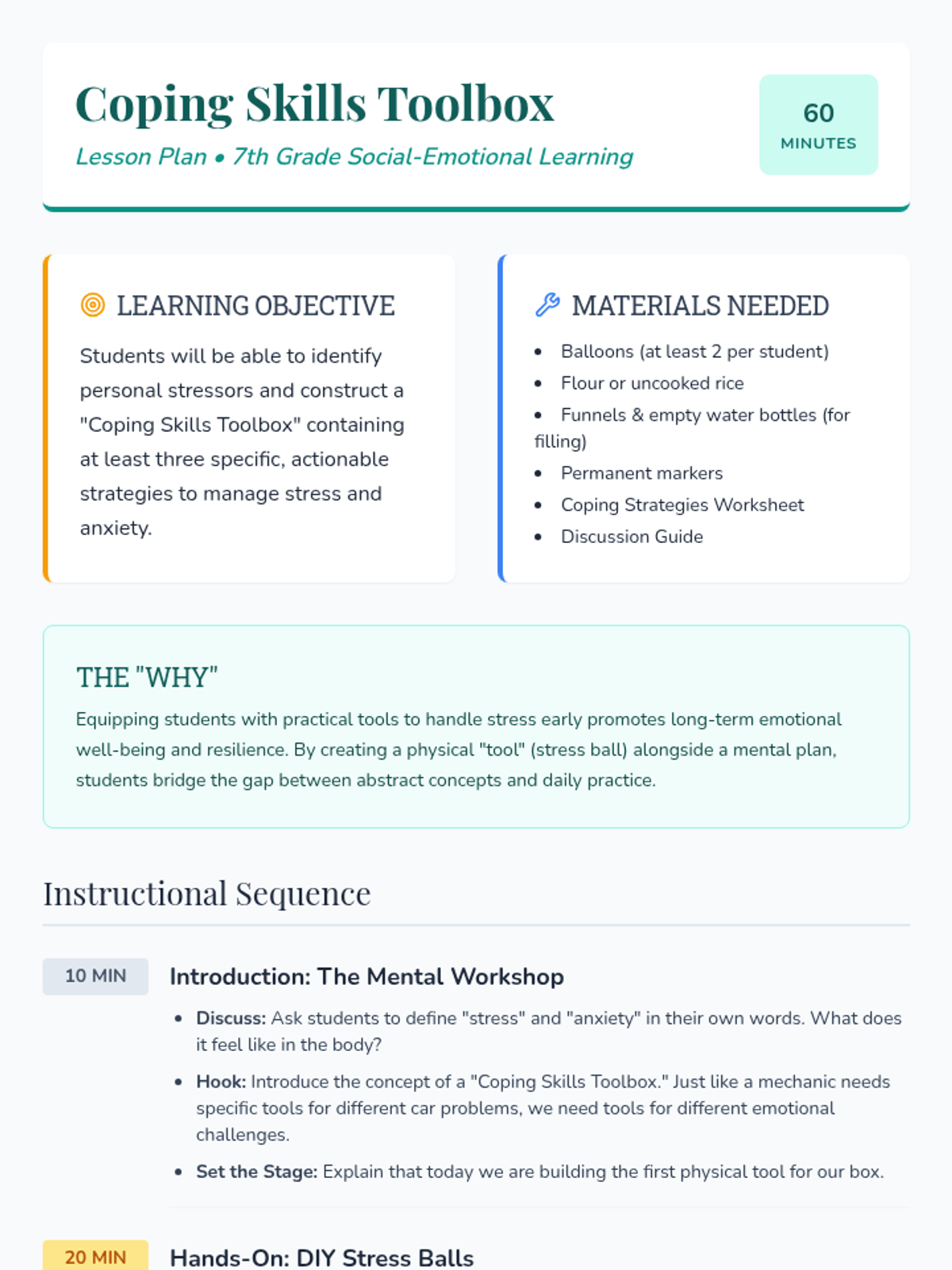 A lesson where 7th-grade students explore and create their own 'Coping Skills Toolbox' to manage stress and anxiety, featuring a hands-on stress ball activity and reflective worksheet.