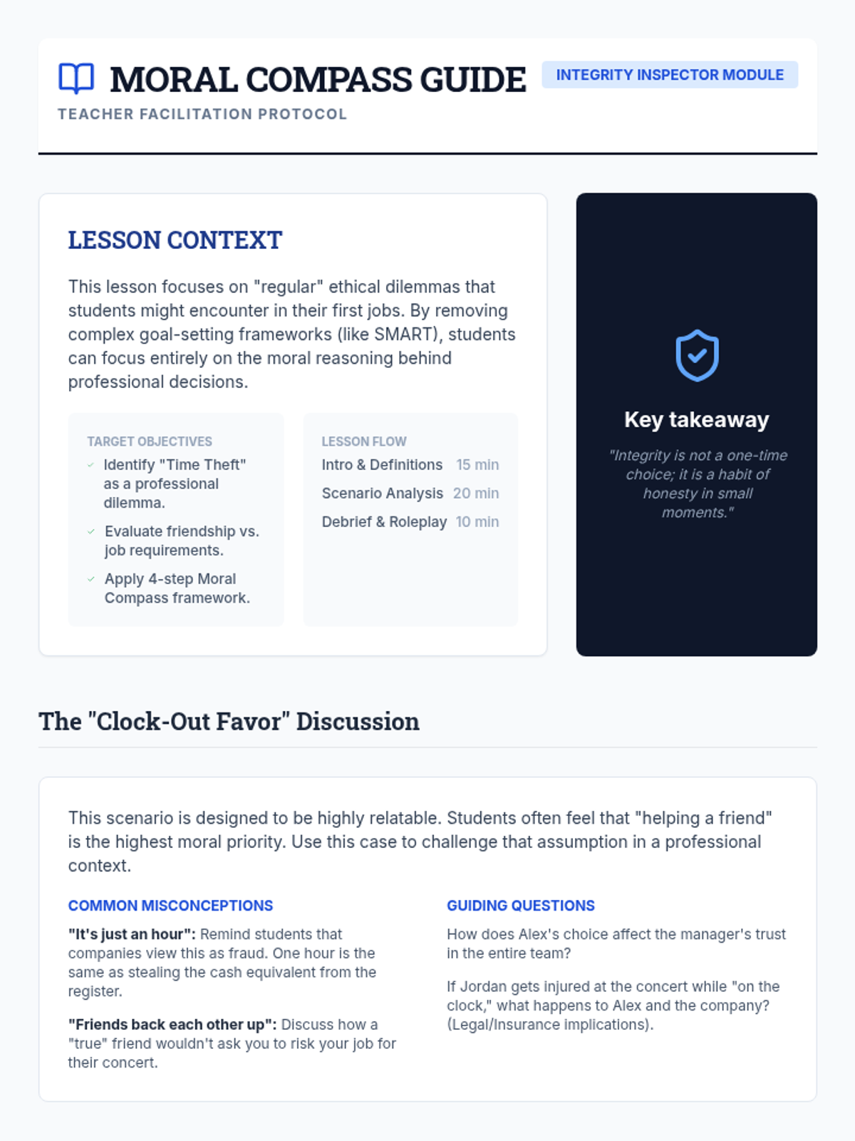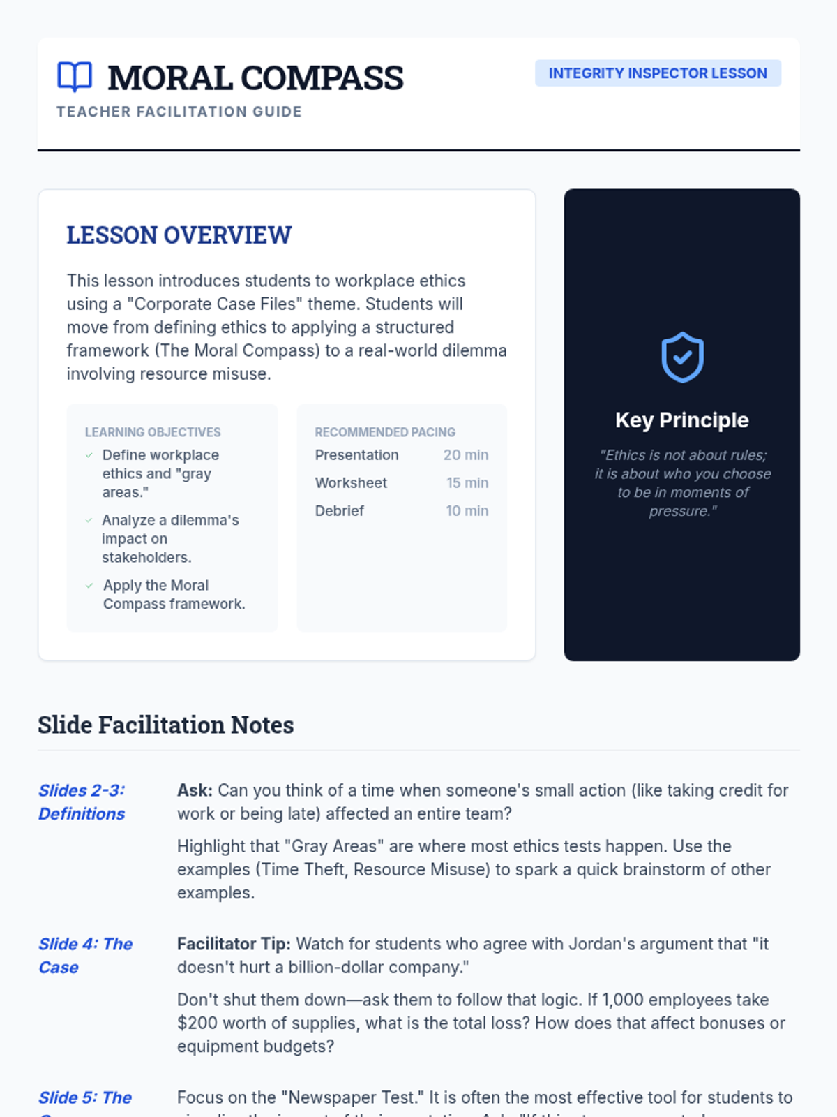 This lesson explores the fundamentals of workplace ethics, helping students identify ethical dilemmas and develop a framework for making principled decisions in professional settings through real-world case studies.