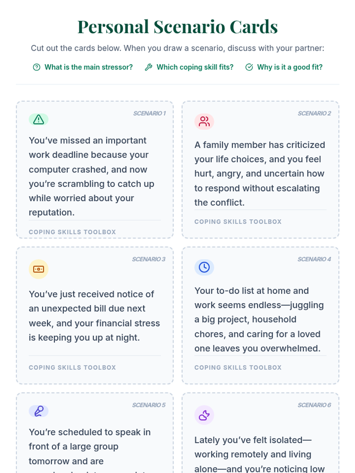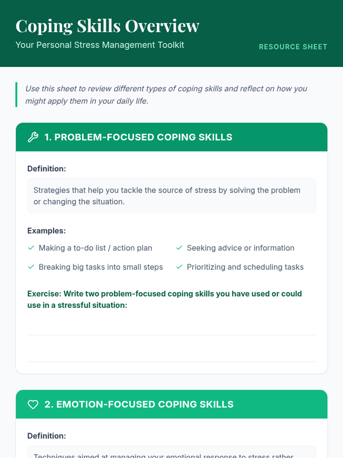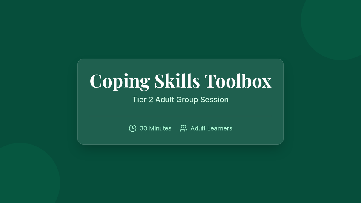 A 30-minute Tier 2 group session for adults focused on identifying and practicing problem-focused, emotion-focused, and relaxation coping strategies to enhance emotional resilience.
