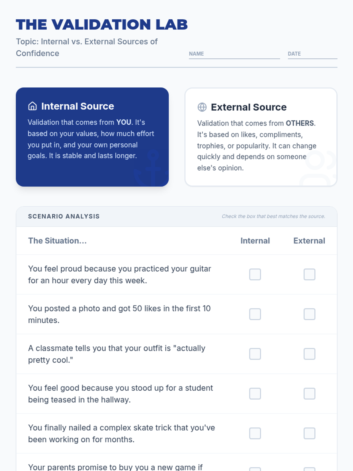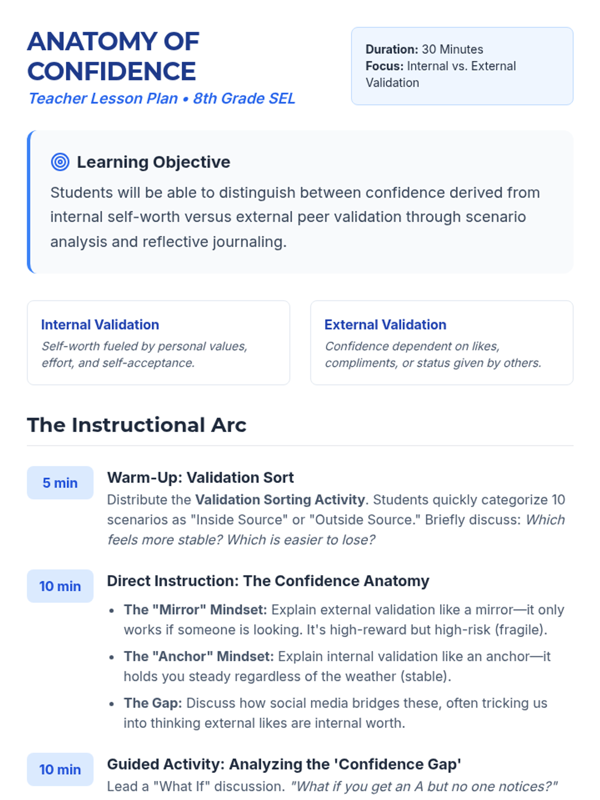 A 30-minute social-emotional learning lesson for 8th graders to explore the differences between internal self-worth and external peer validation. Students will learn to identify sources of confidence and develop strategies for building authentic self-esteem.