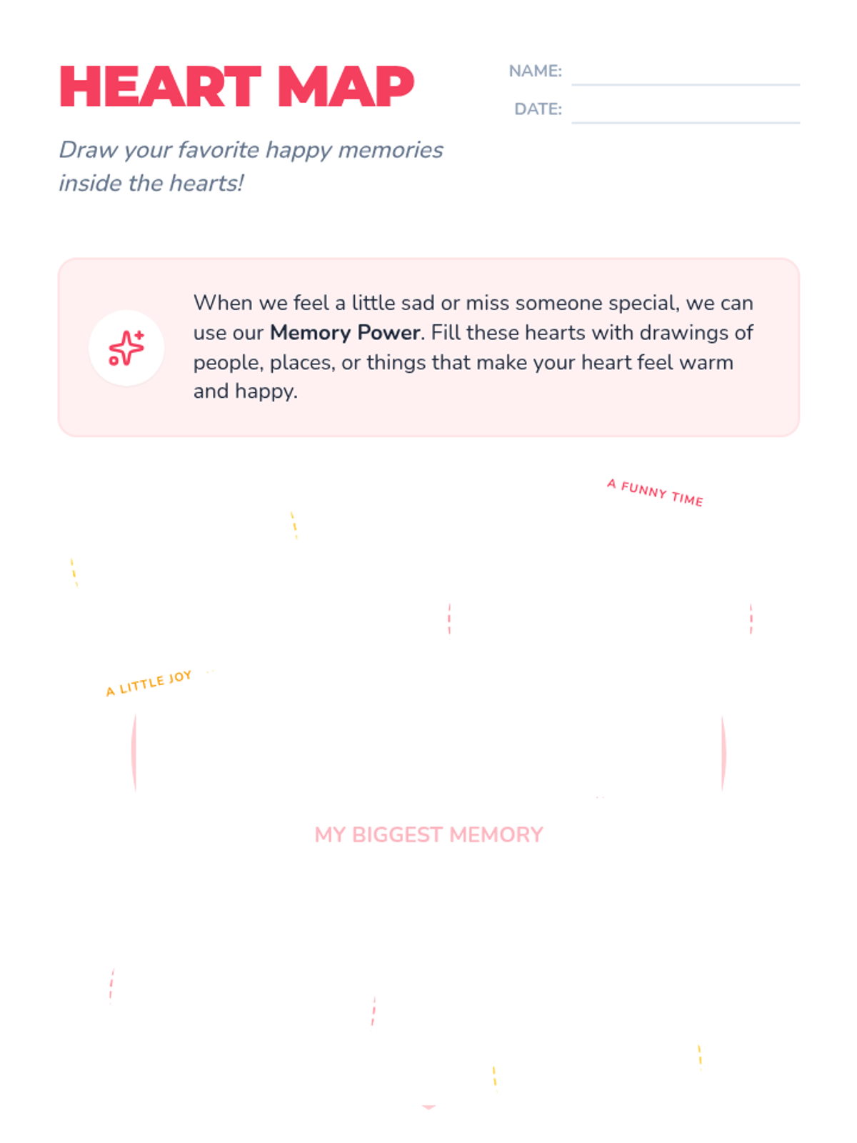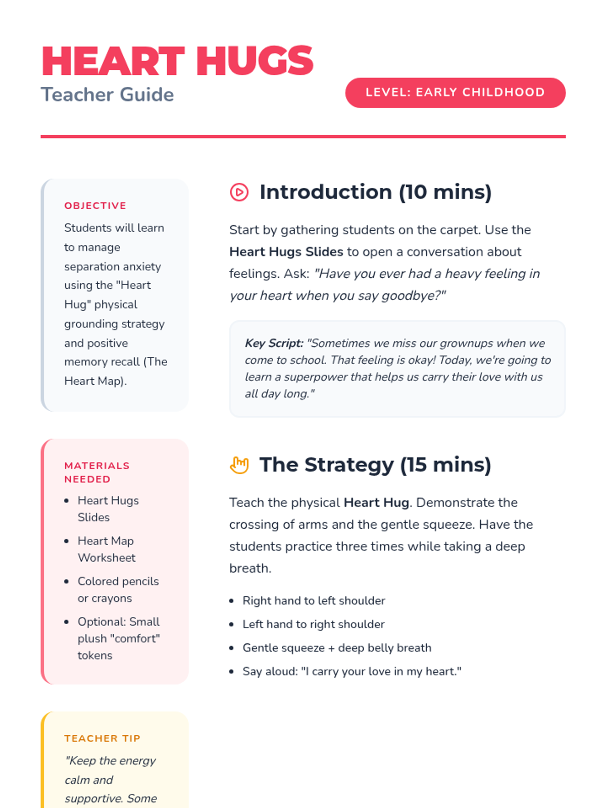 A comforting lesson designed to help young students navigate separation anxiety through the 'Heart Hug' strategy and positive memory recall. Students will learn practical coping tools and create a personal memory map to carry with them.