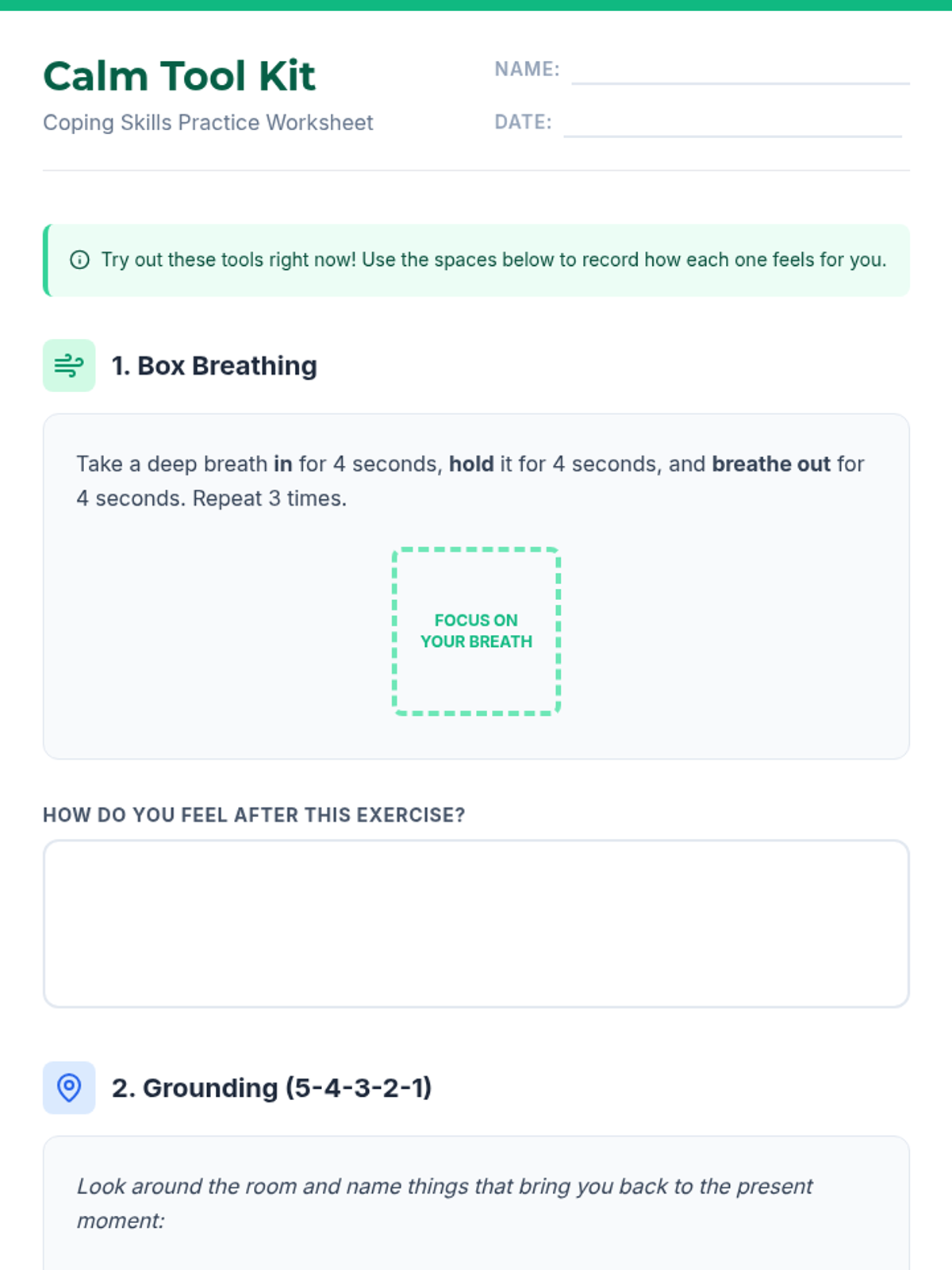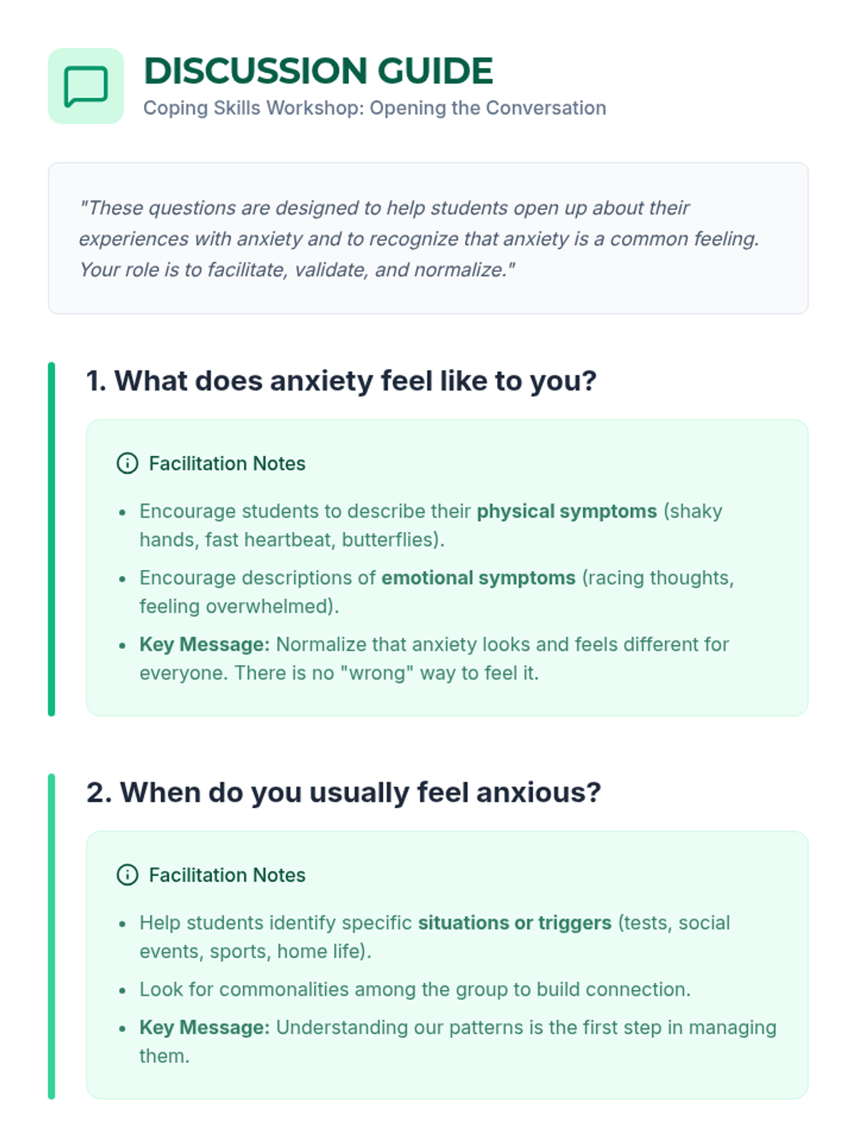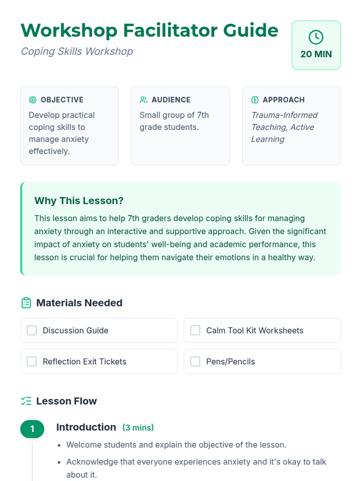 An interactive workshop designed for 7th graders to identify anxiety triggers and practice practical coping strategies like deep breathing, grounding, and positive affirmations.