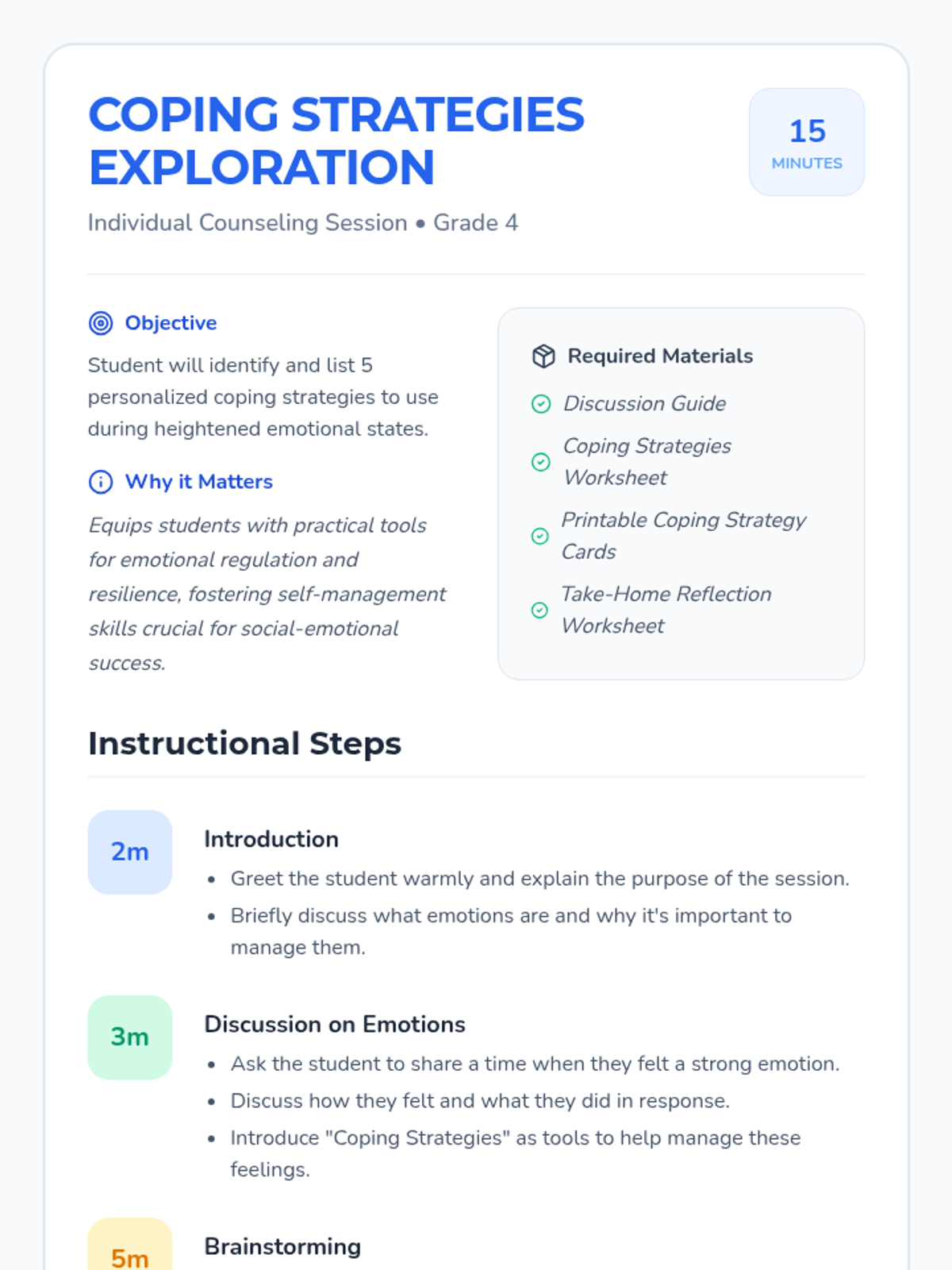 A one-on-one Tier 3 counseling session for 4th graders to identify and practice five personalized coping strategies for emotional regulation.