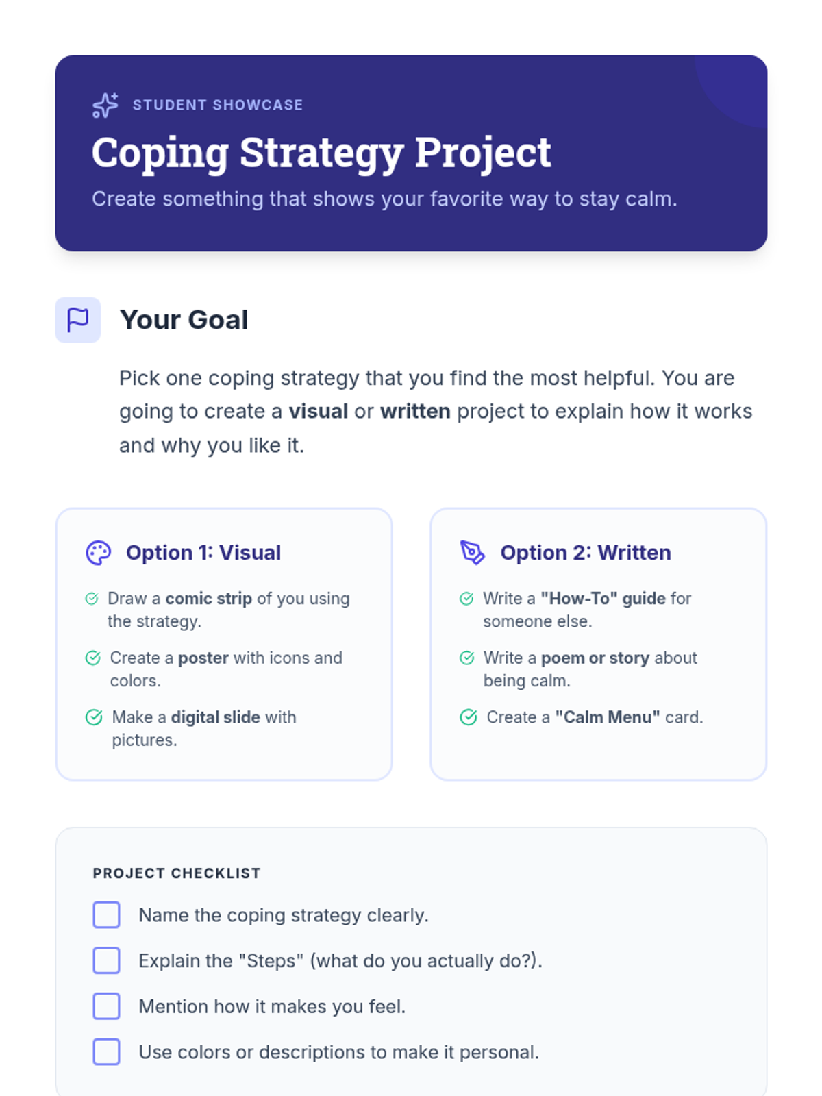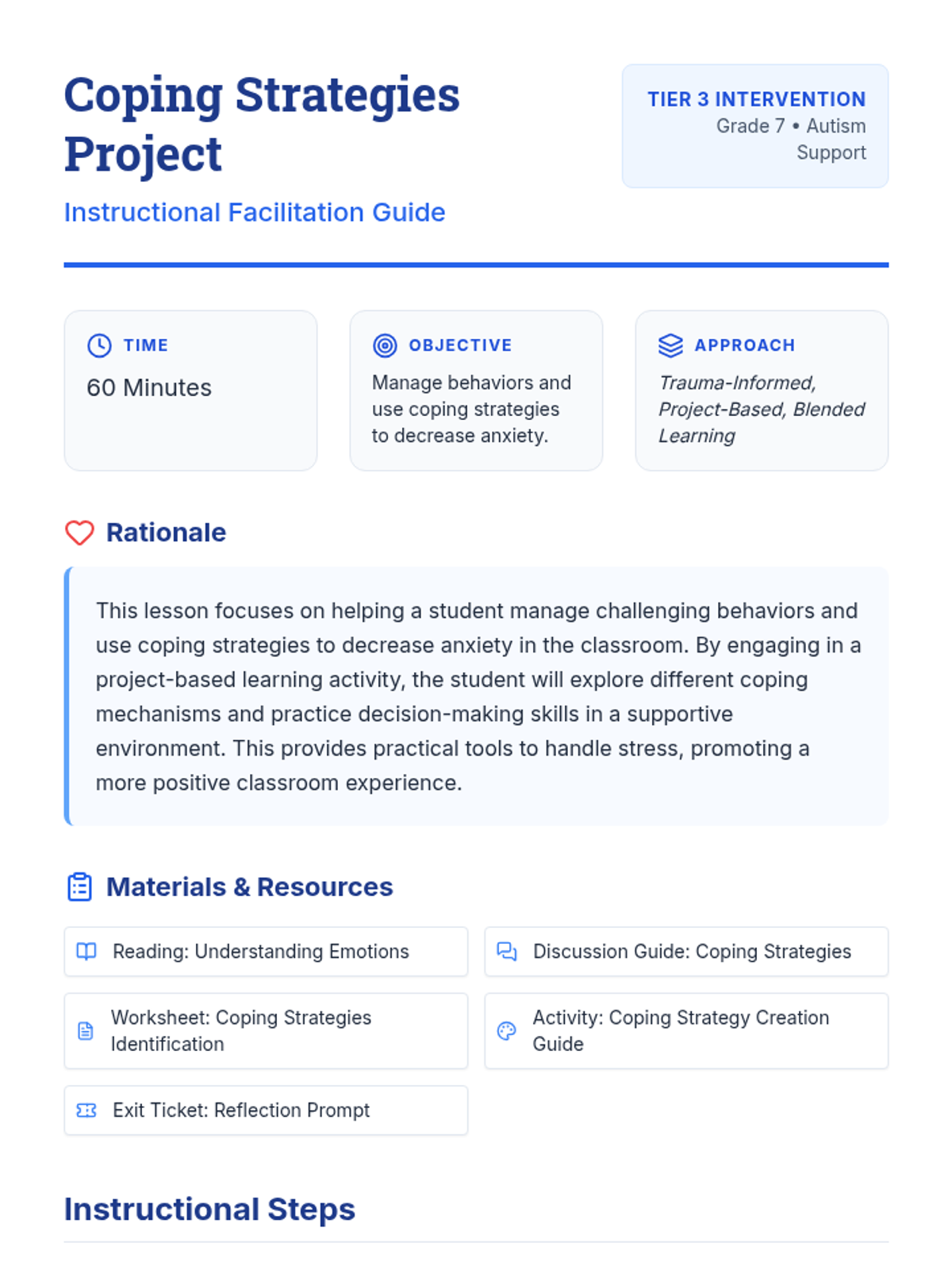A Tier 3 project-based lesson for a 7th-grade student with autism to identify, explore, and create a personal coping strategy toolkit to manage anxiety and challenging behaviors.