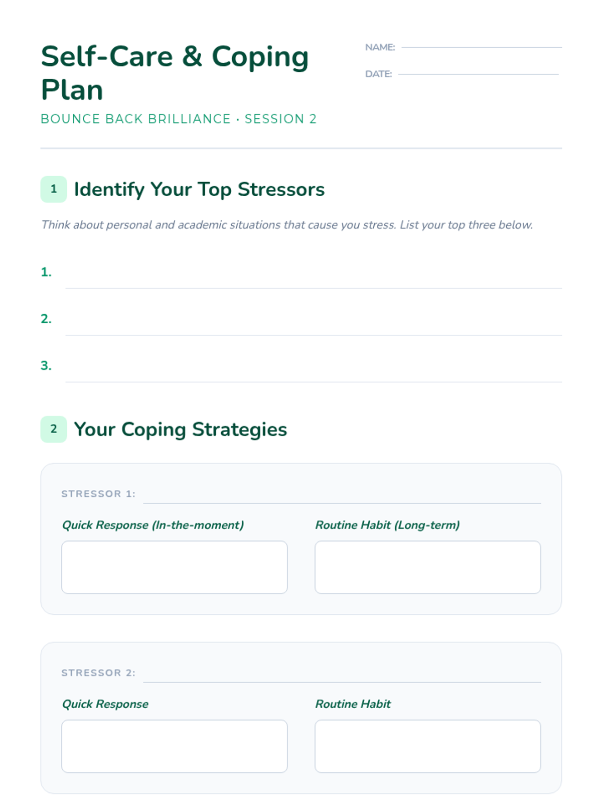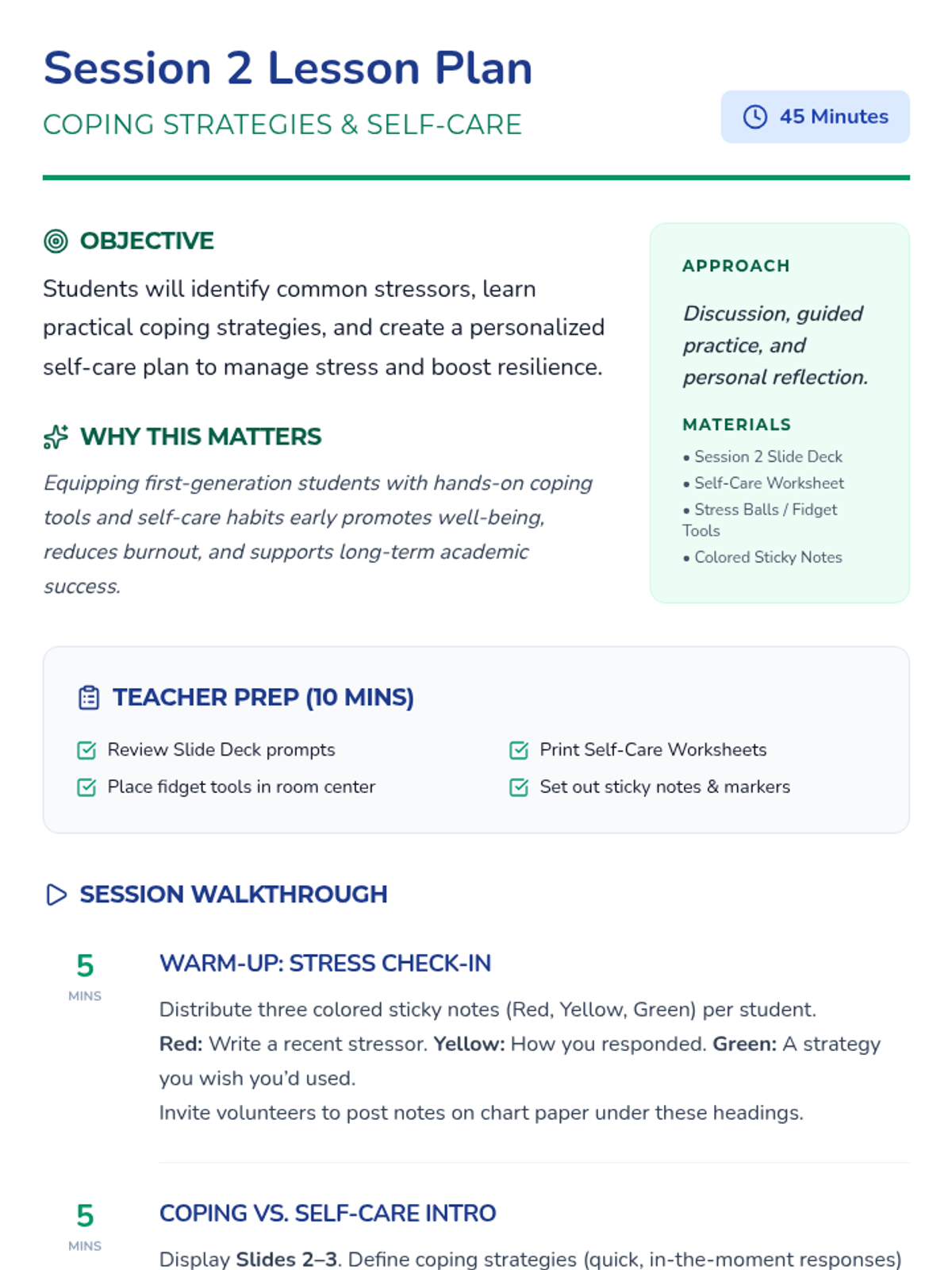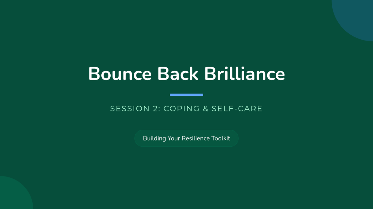 Students identify personal and academic stressors, learn practical coping strategies, and create a personalized self-care plan to manage stress and boost resilience.