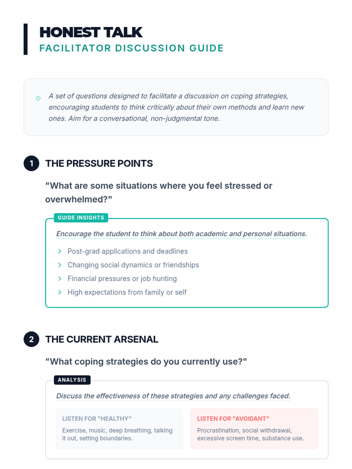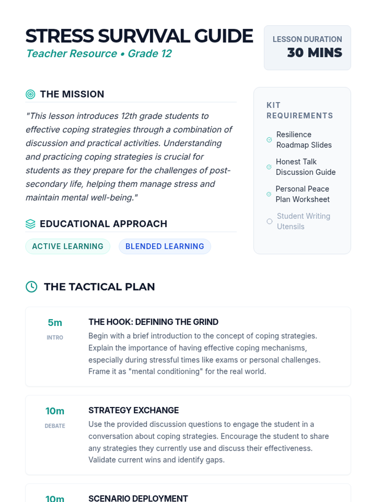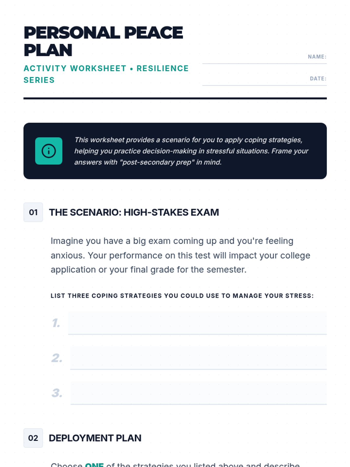 A lesson for 12th grade students to identify, discuss, and practice effective coping strategies for managing stress during their transition to post-secondary life.
