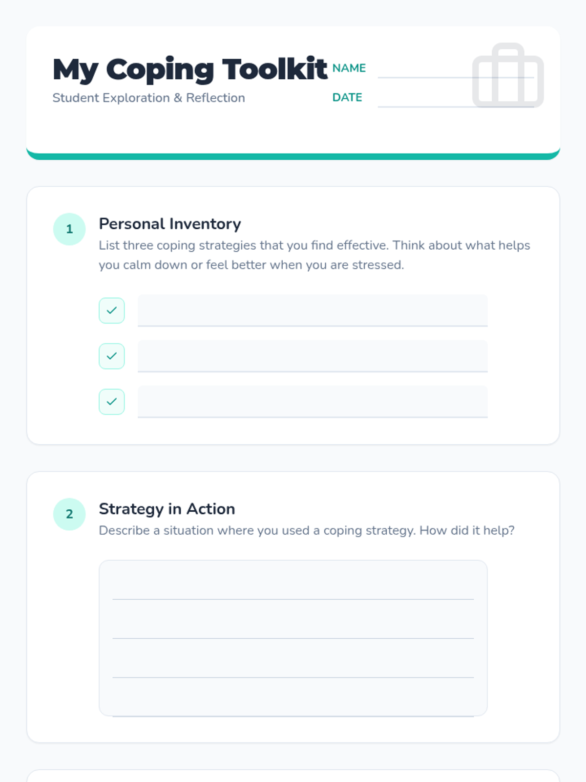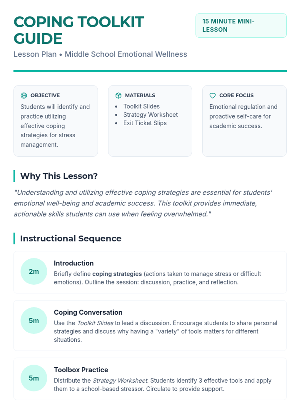 Students will explore various coping strategies to manage stress and emotions, participating in a class discussion, a reflective worksheet, and an exit ticket for self-assessment.