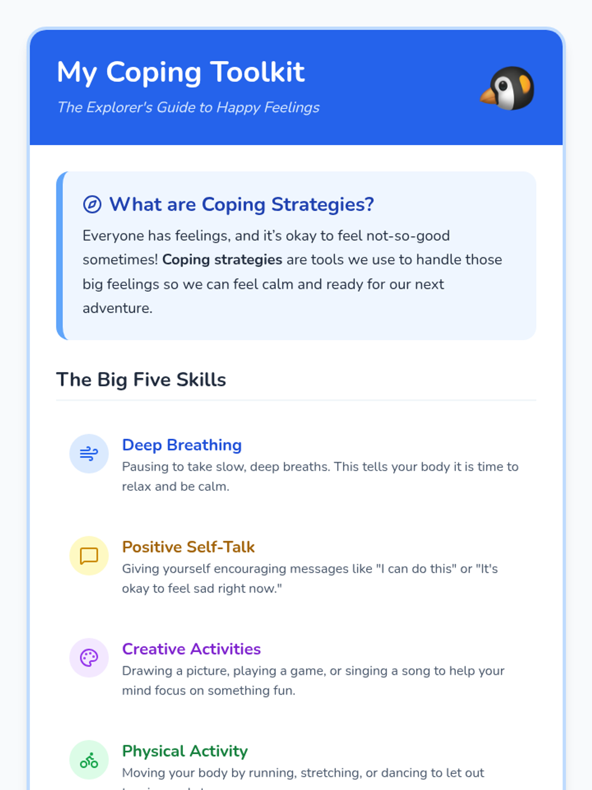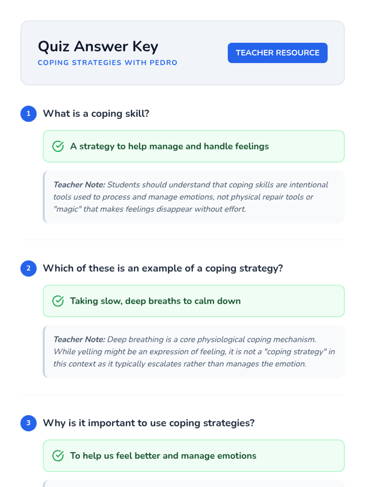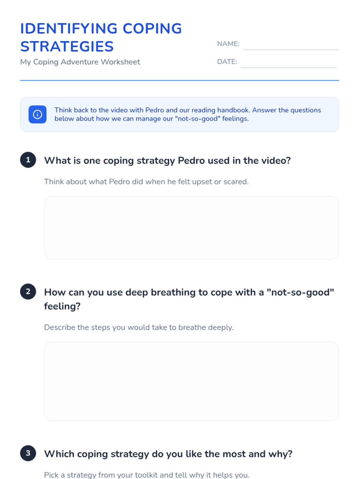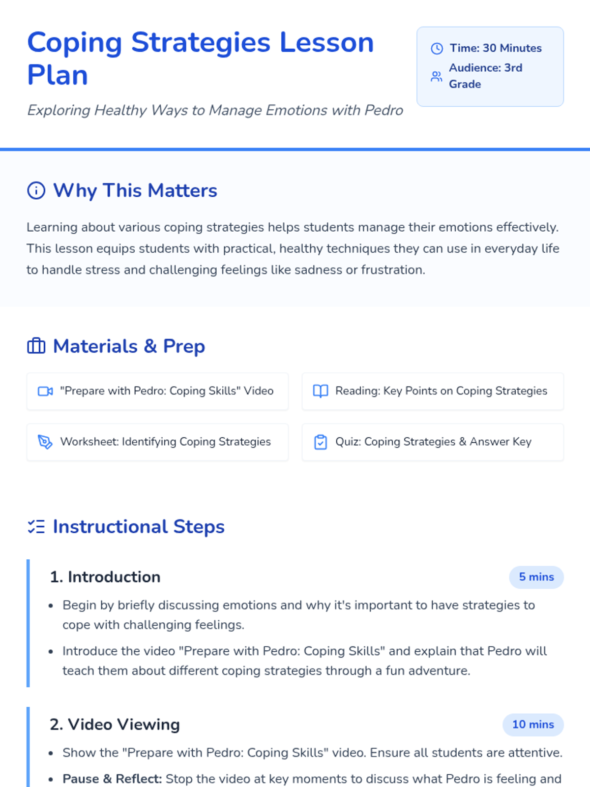 A social-emotional learning lesson for 3rd graders focusing on healthy coping strategies using the 'Prepare with Pedro' framework. Students will identify various techniques like deep breathing and positive self-talk to manage challenging emotions.