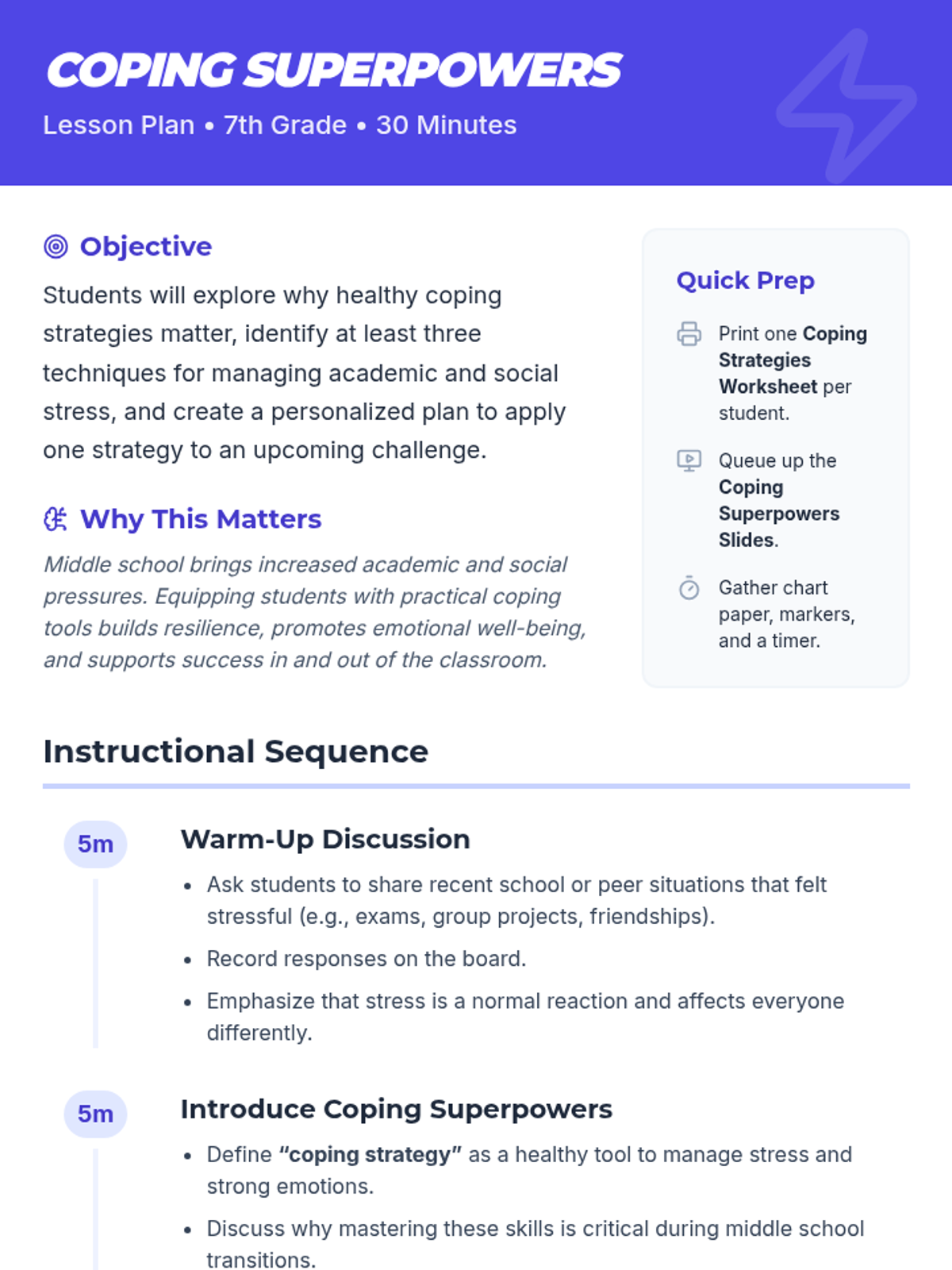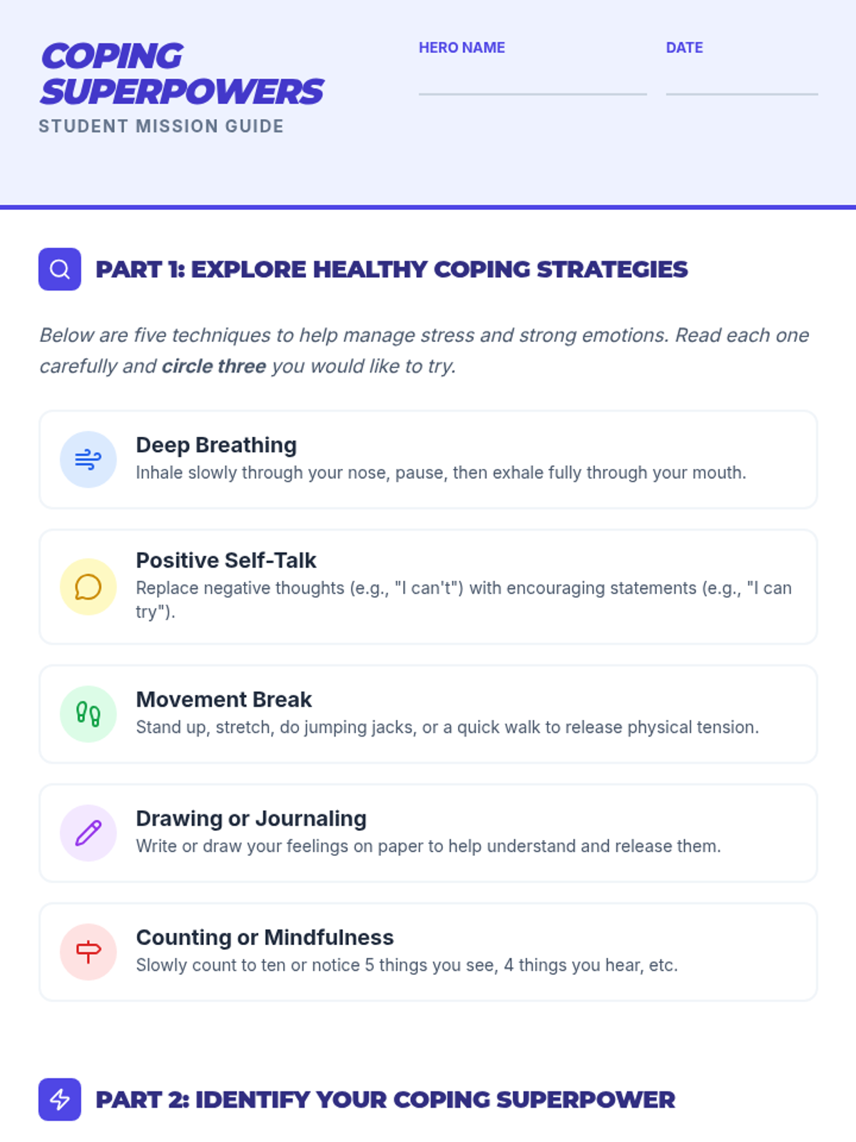 A 30-minute Tier 1 lesson for middle schoolers to identify and practice healthy coping strategies for managing stress and strong emotions through a superhero-themed lens.