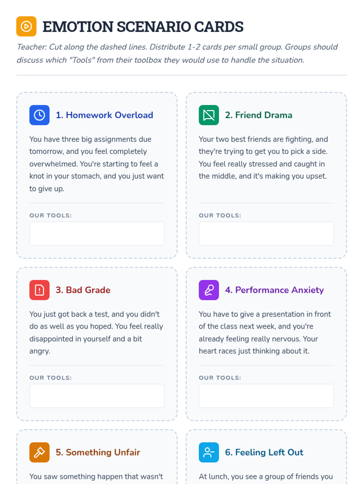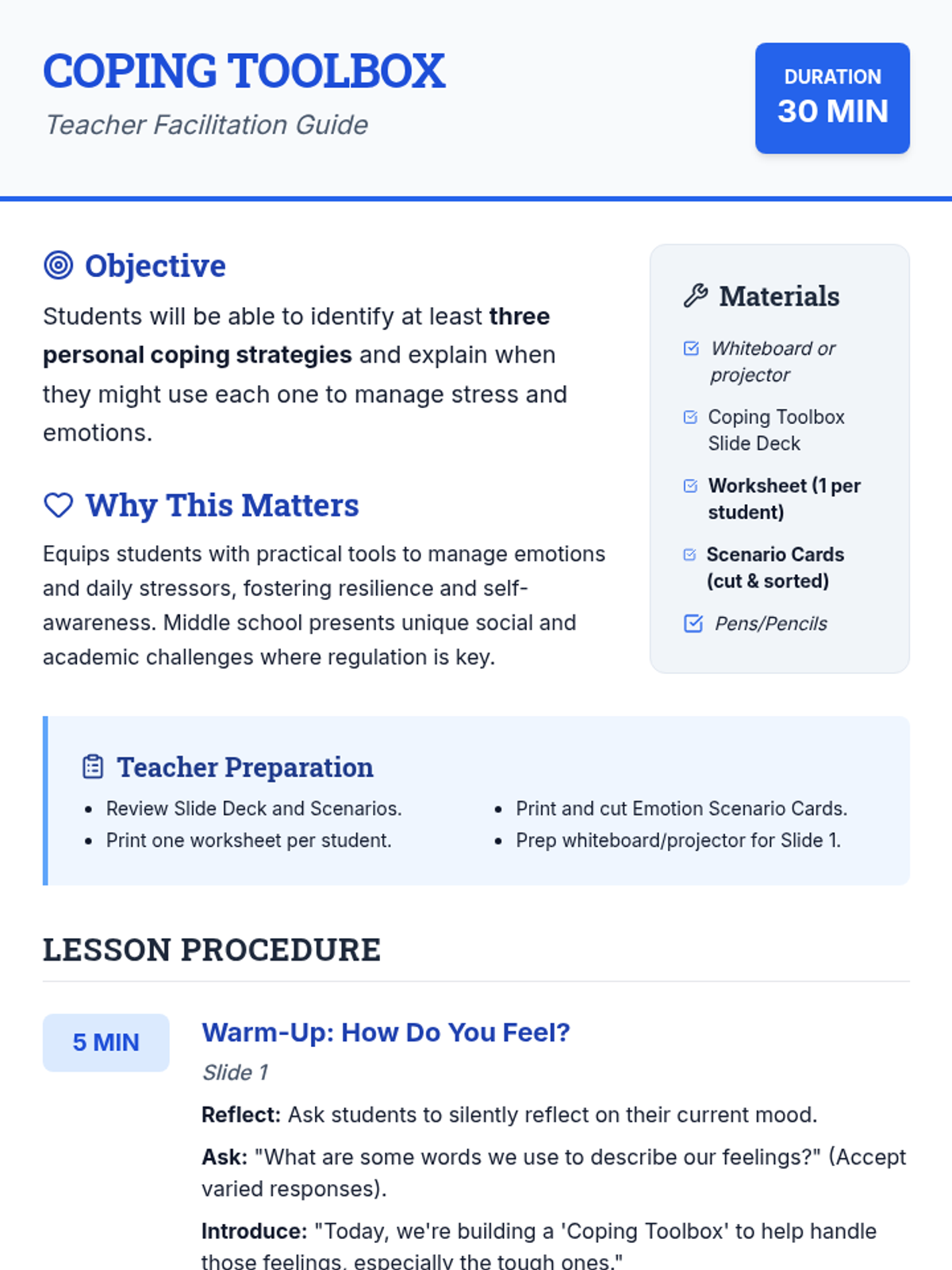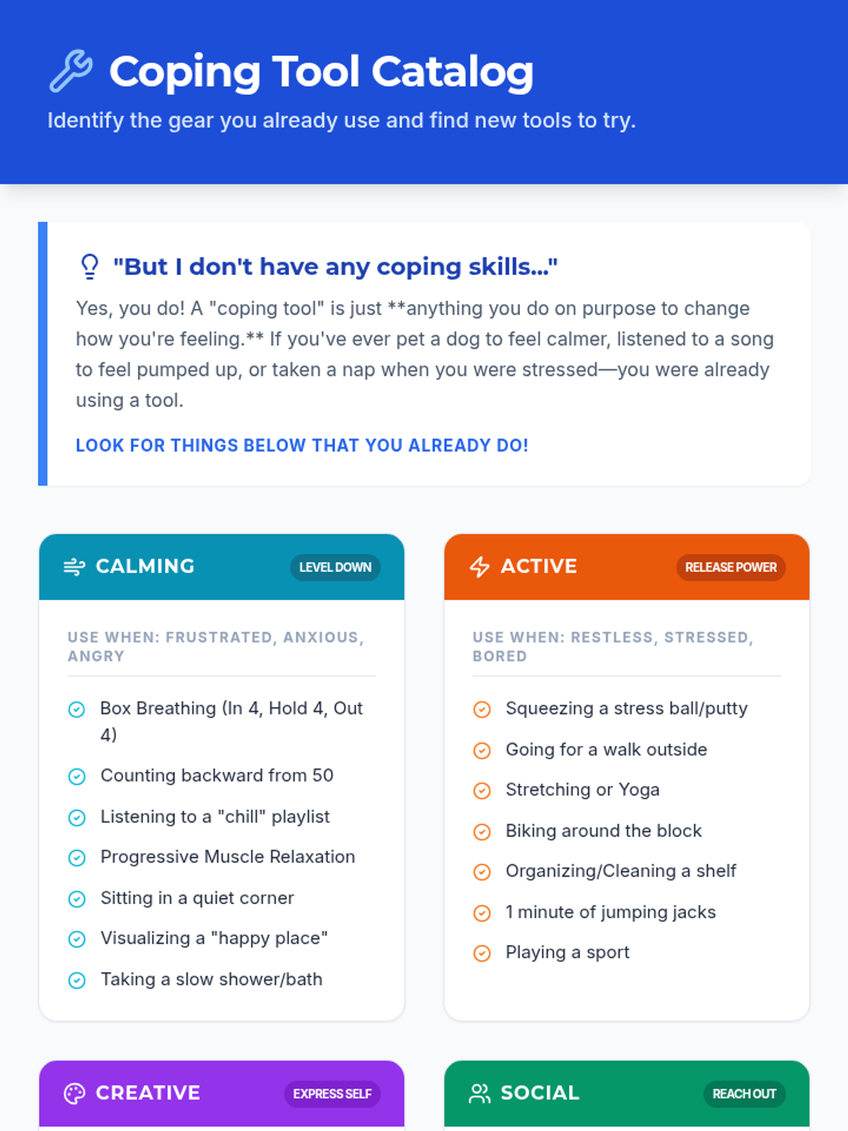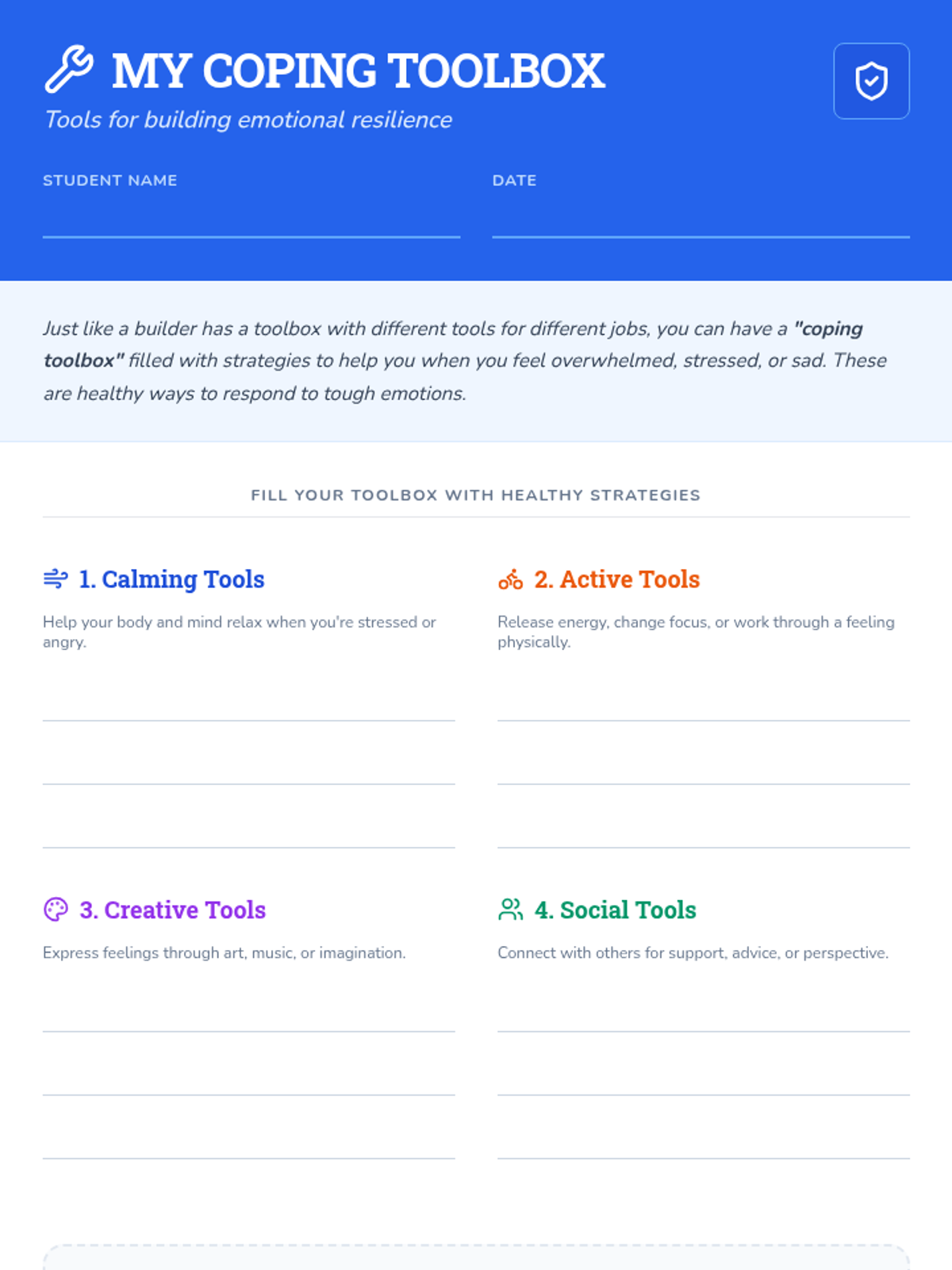 A 30-minute Tier 1 lesson for 7th graders to identify and explain personal coping strategies using a 'Coping Toolbox' metaphor. Students will explore calming, active, creative, and social strategies to build emotional resilience.