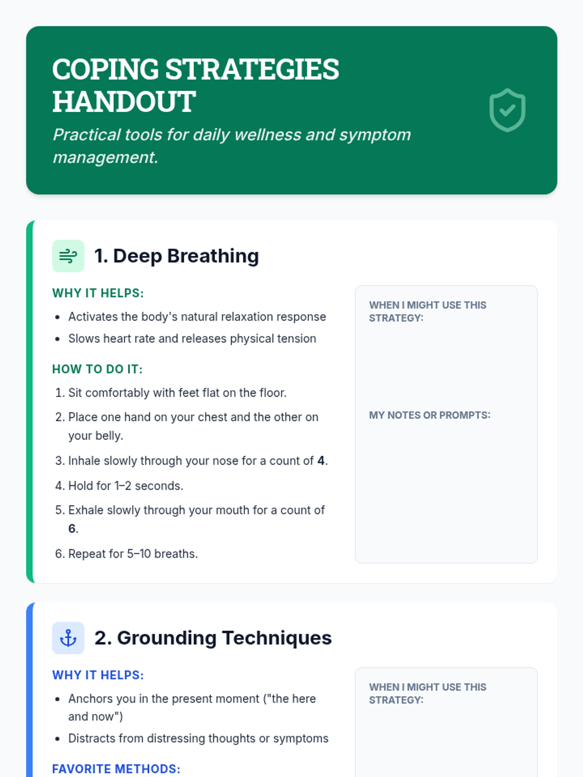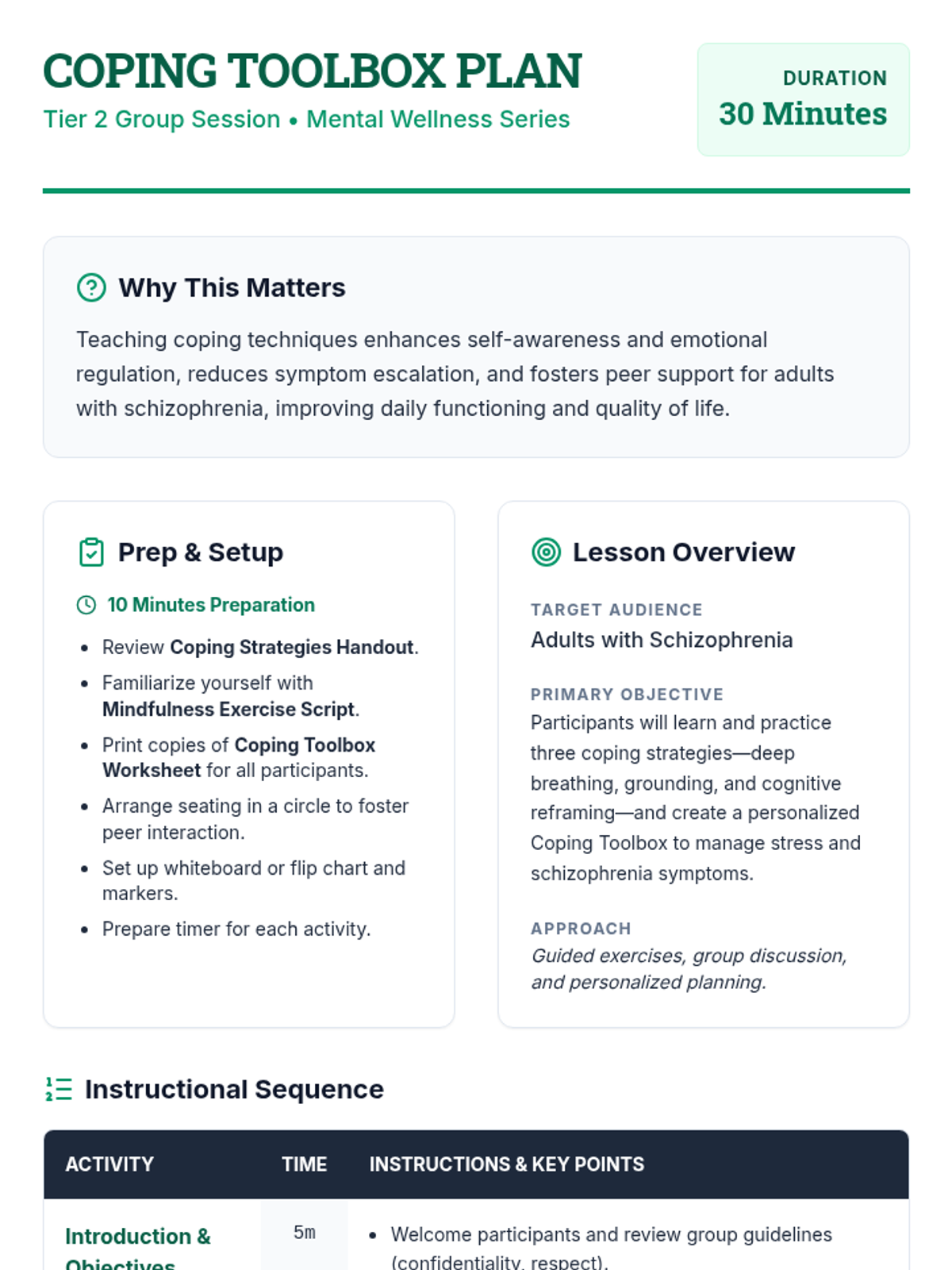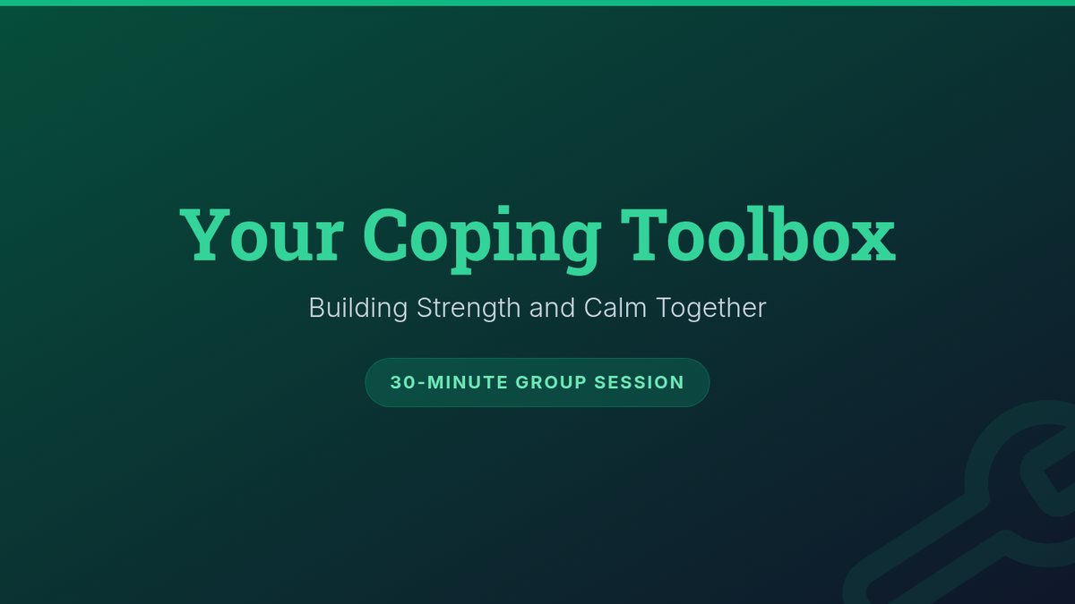 A 30-minute Tier 2 group session for adults with schizophrenia focused on practical coping strategies including deep breathing, grounding, and cognitive reframing to manage stress and symptoms.