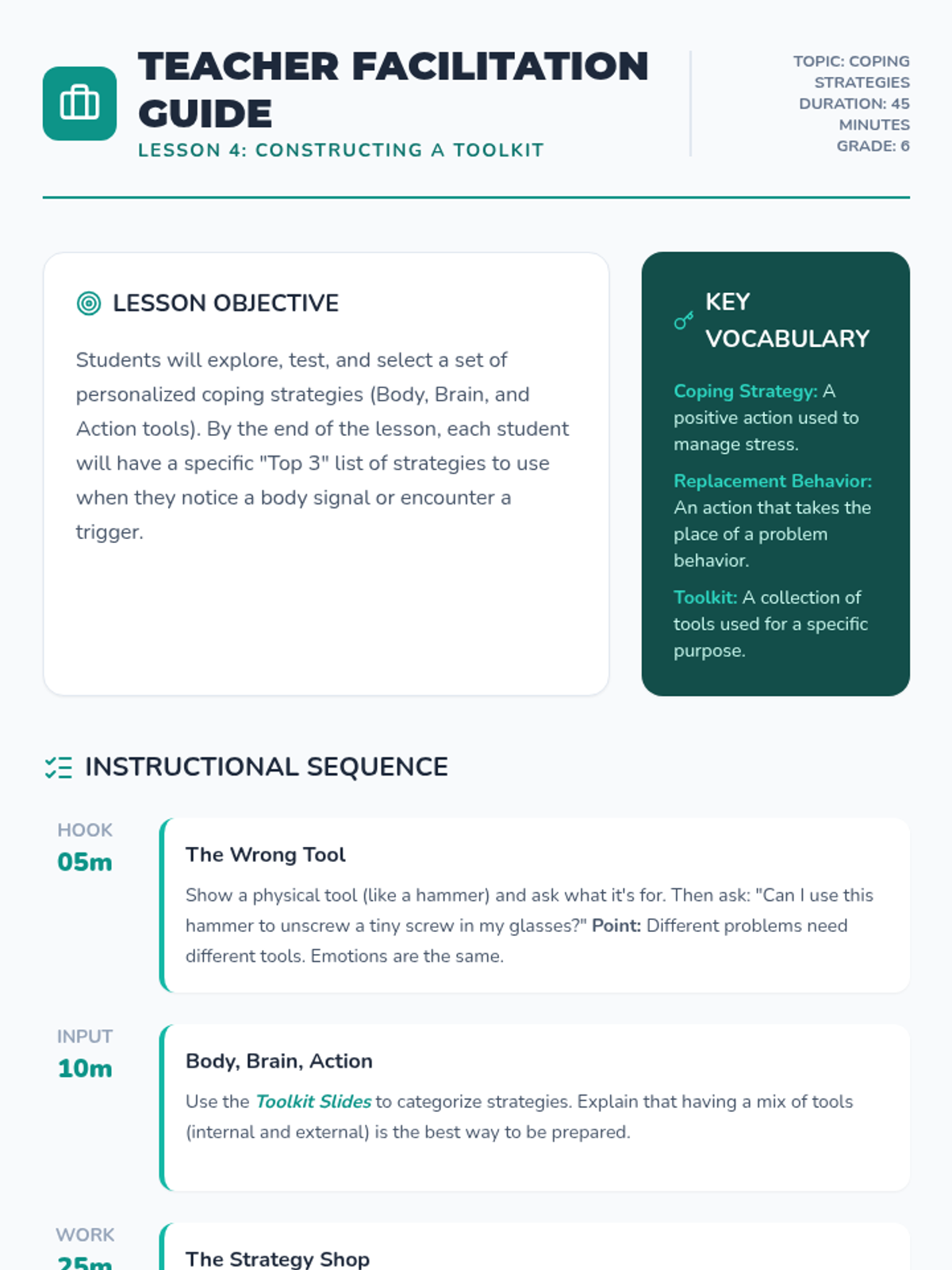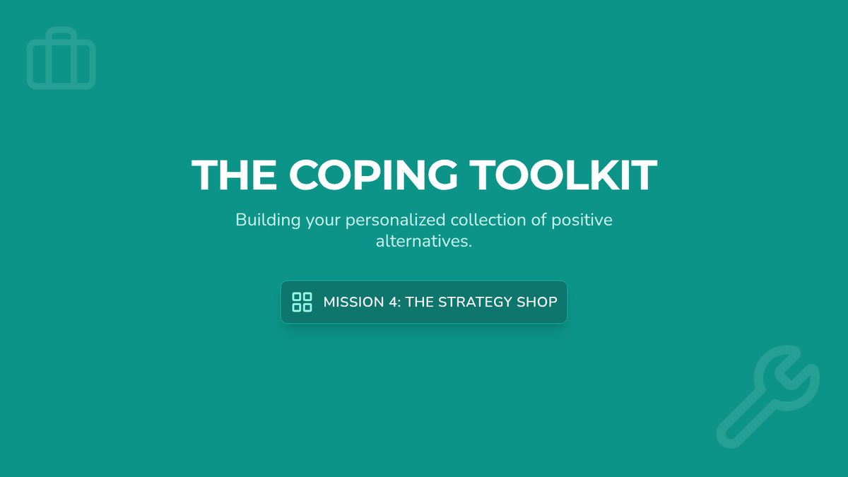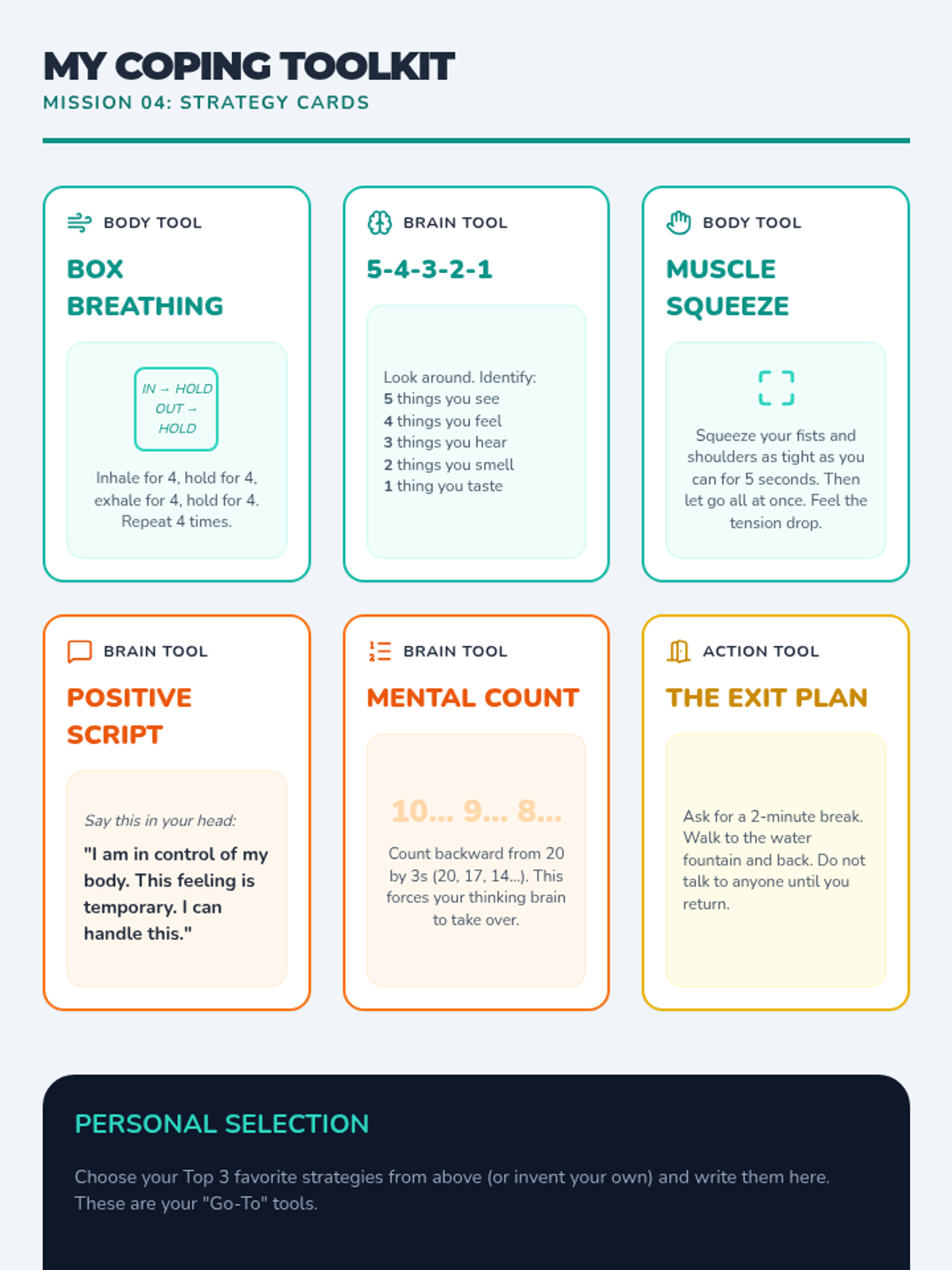 Students explore and select personalized coping strategies, such as deep breathing or positive self-talk, to create a portable 'regulation toolkit'.