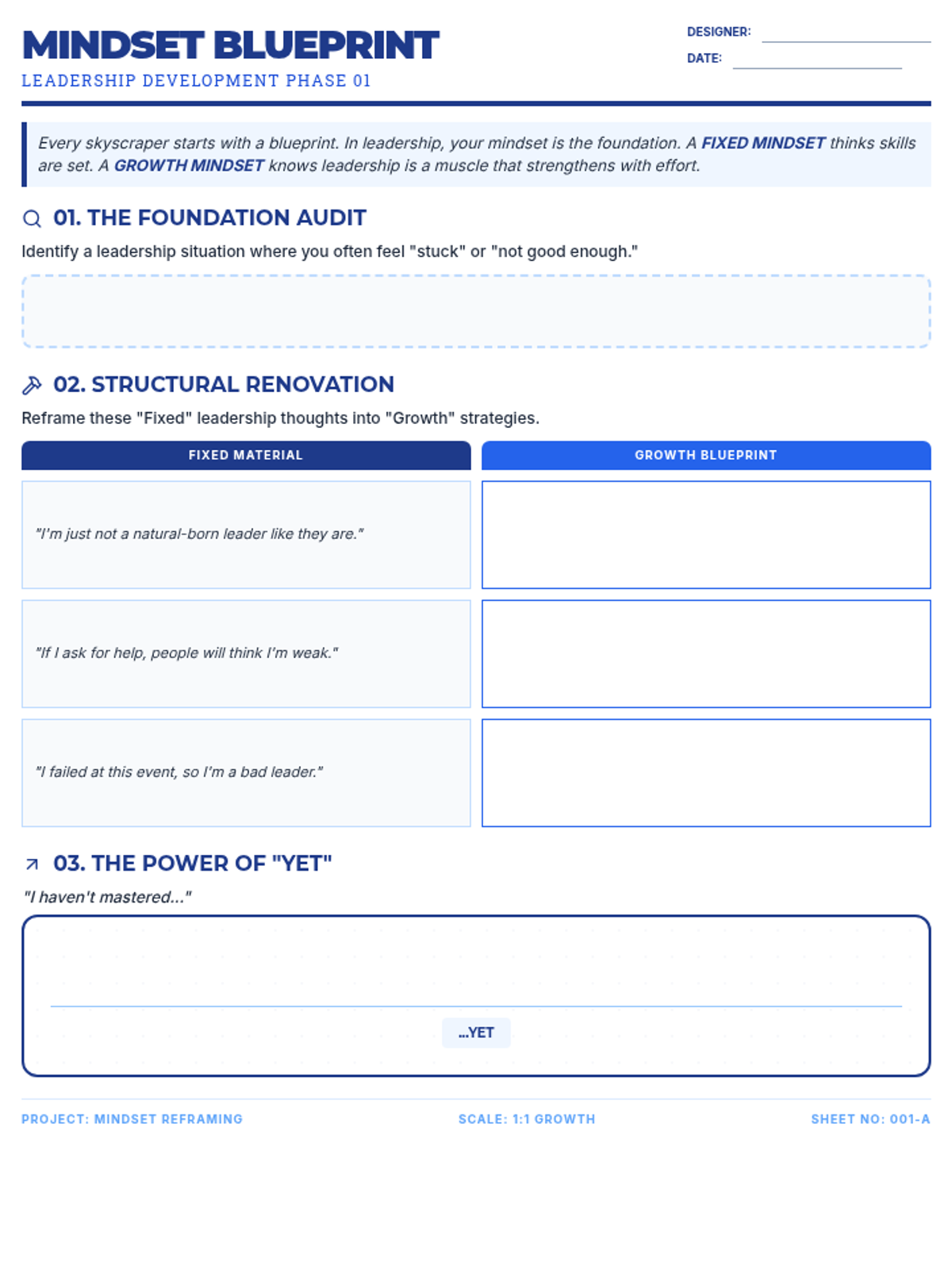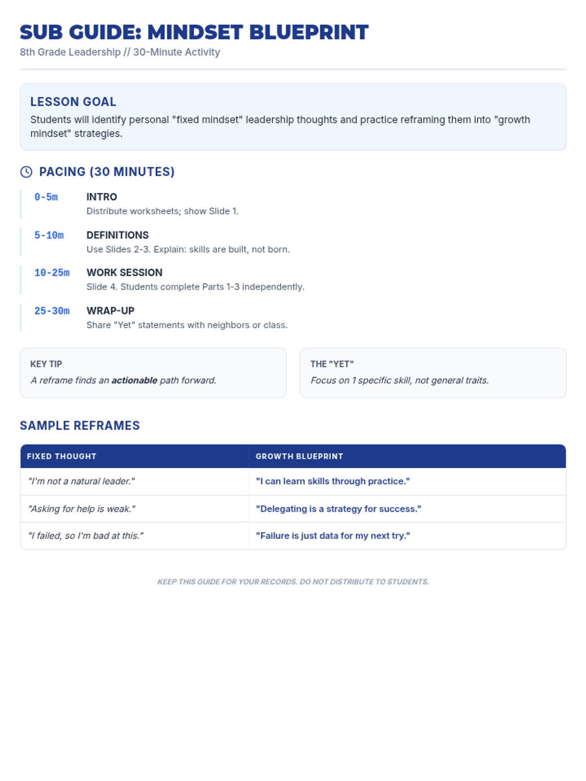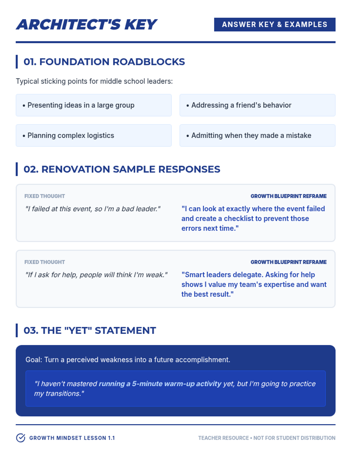 A quick, high-impact growth mindset activity designed for 8th-grade leadership students to analyze and rebuild their mental frameworks using an architectural blueprint theme. This self-contained lesson is perfect for sub plans, focusing on the 'Power of Yet' and reframing leadership challenges.