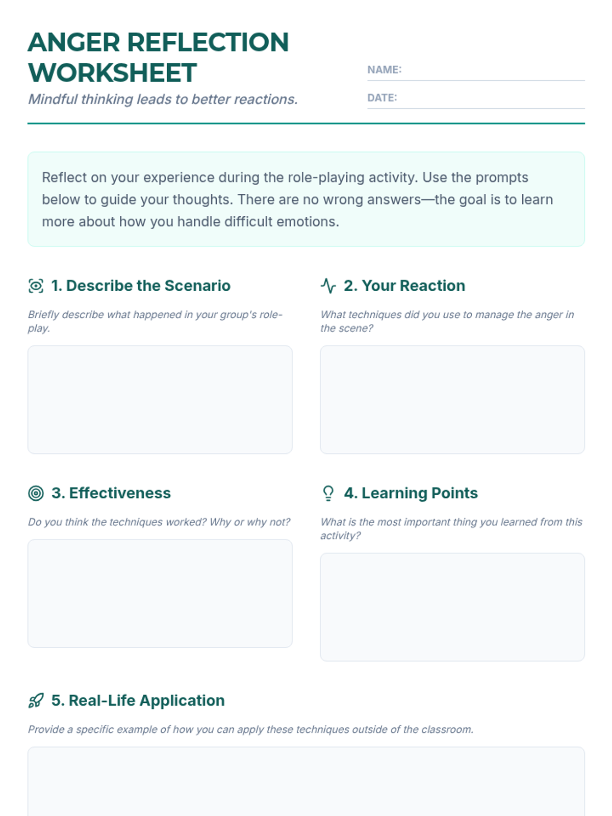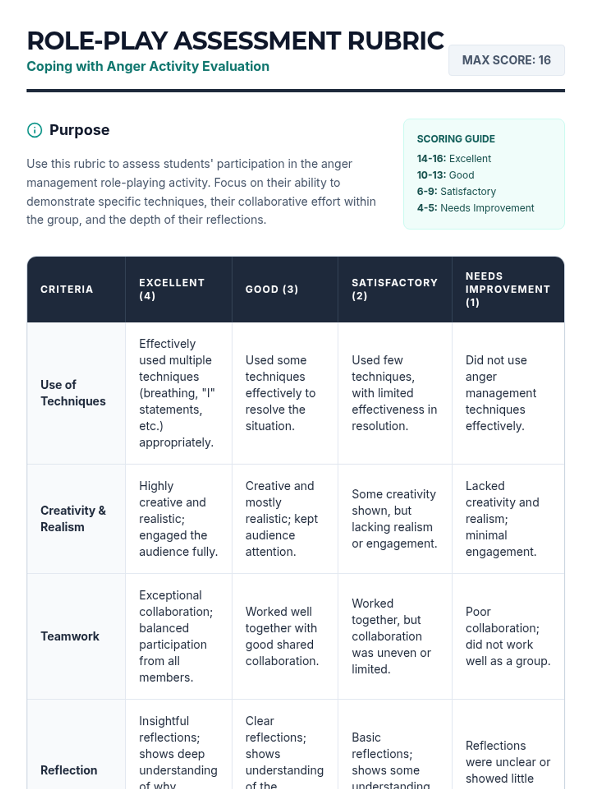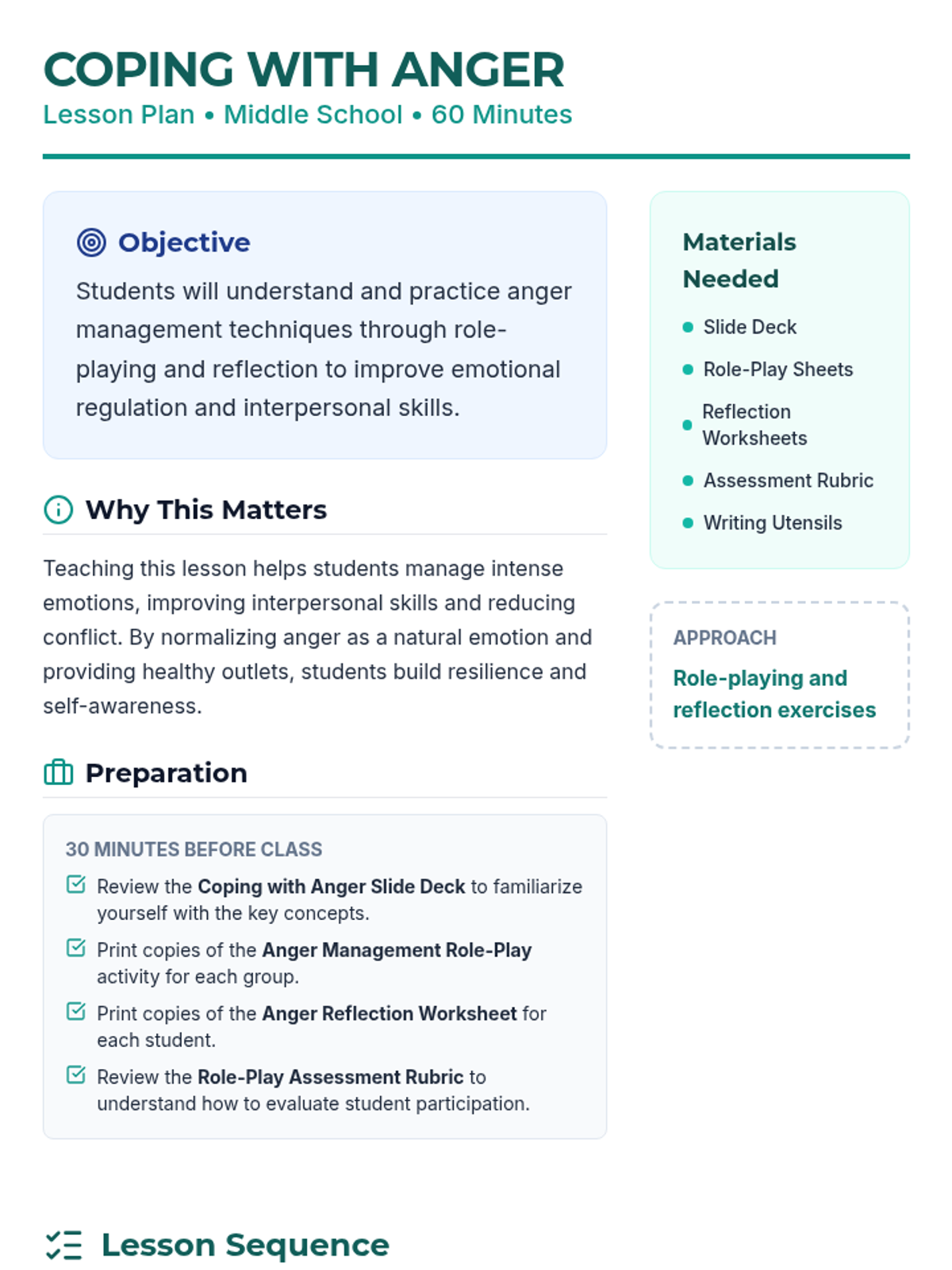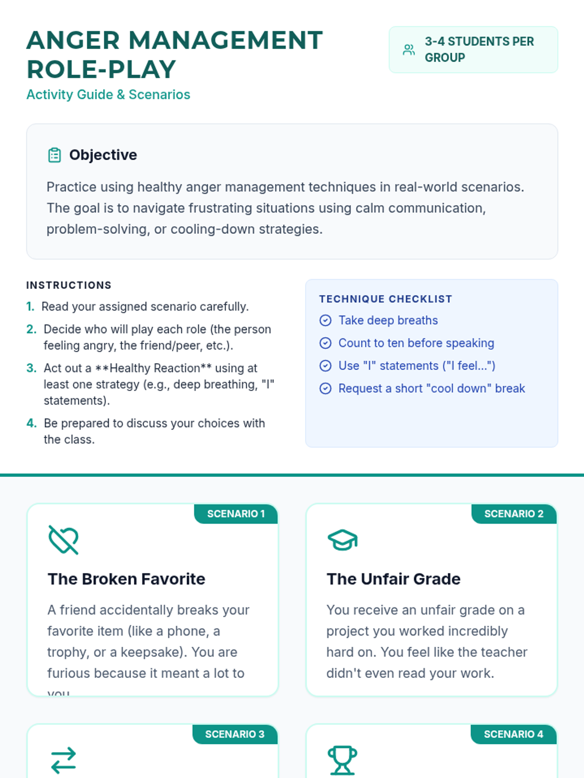 A 60-minute lesson for middle school students to explore healthy anger management strategies through role-playing and personal reflection.