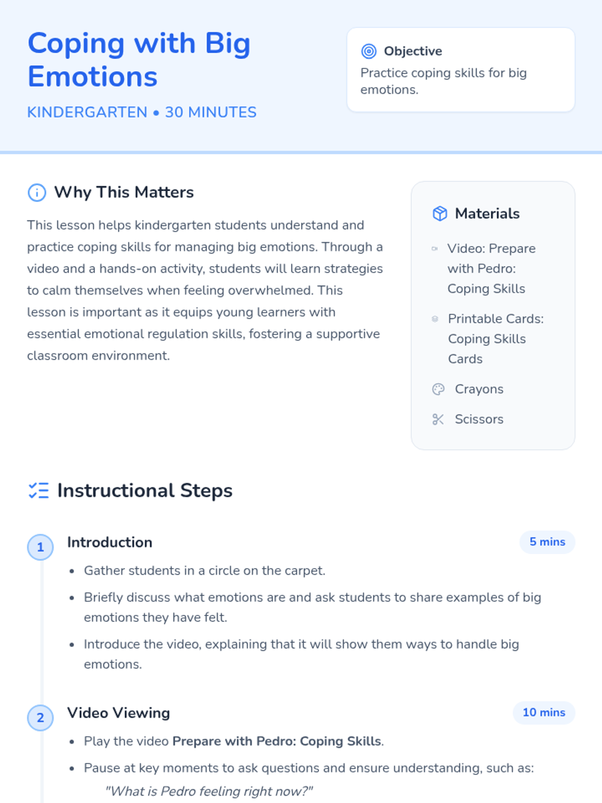 This lesson helps kindergarten students understand and practice coping skills for managing big emotions using the 'Prepare with Pedro' framework. Students will learn and practice specific strategies like deep breathing and counting to calm down when feeling overwhelmed.