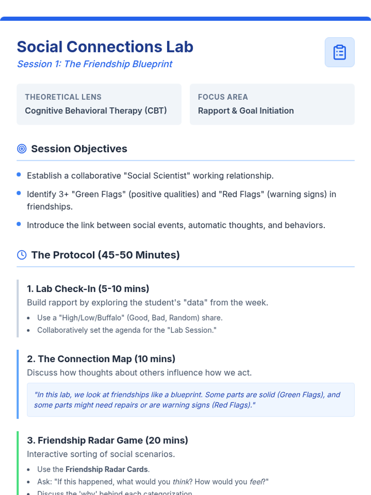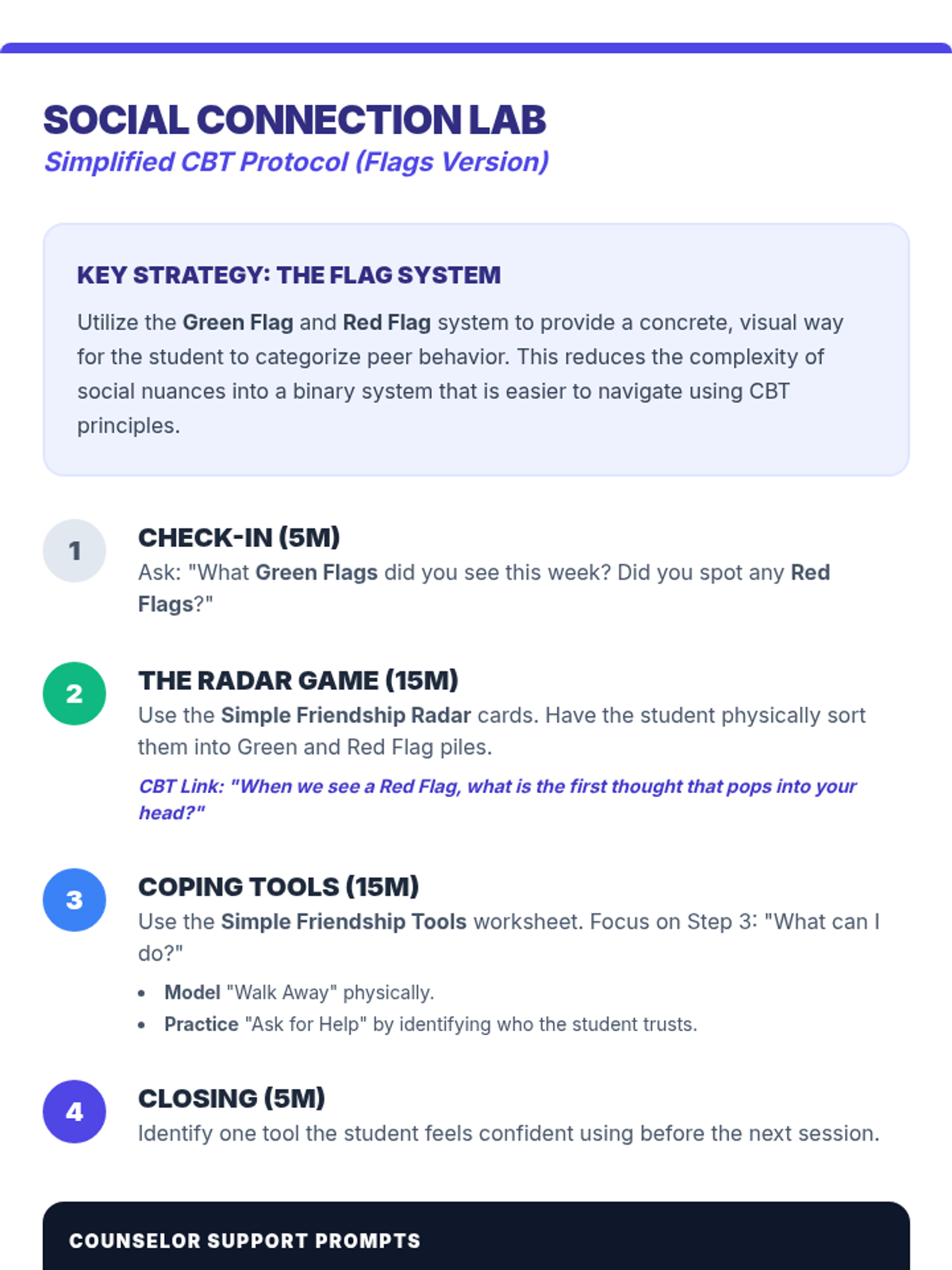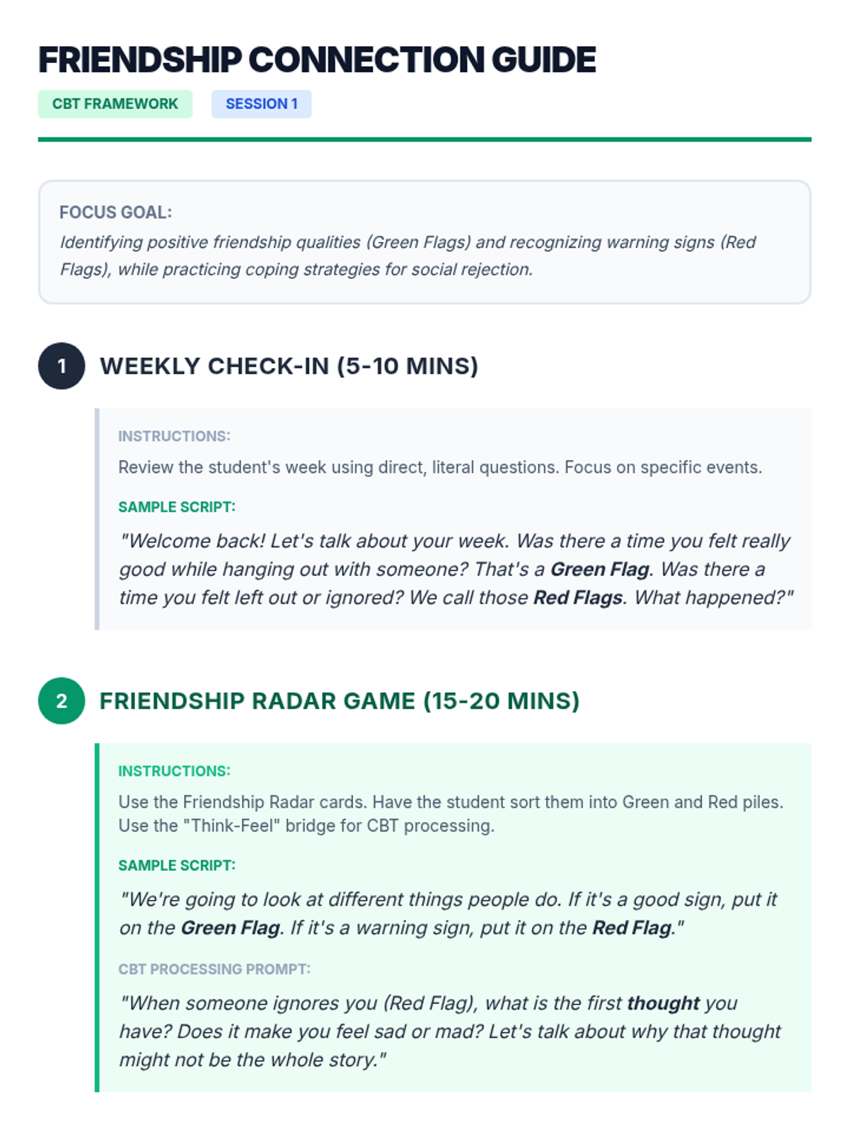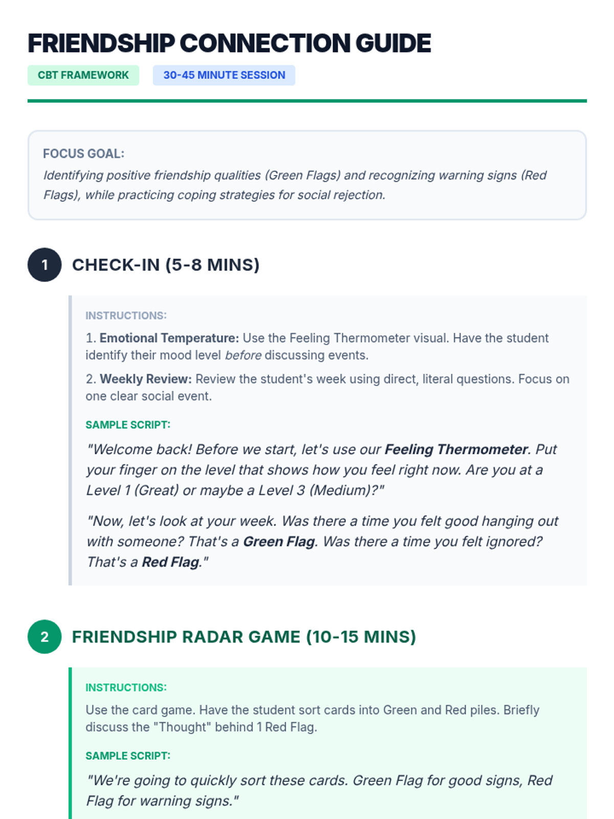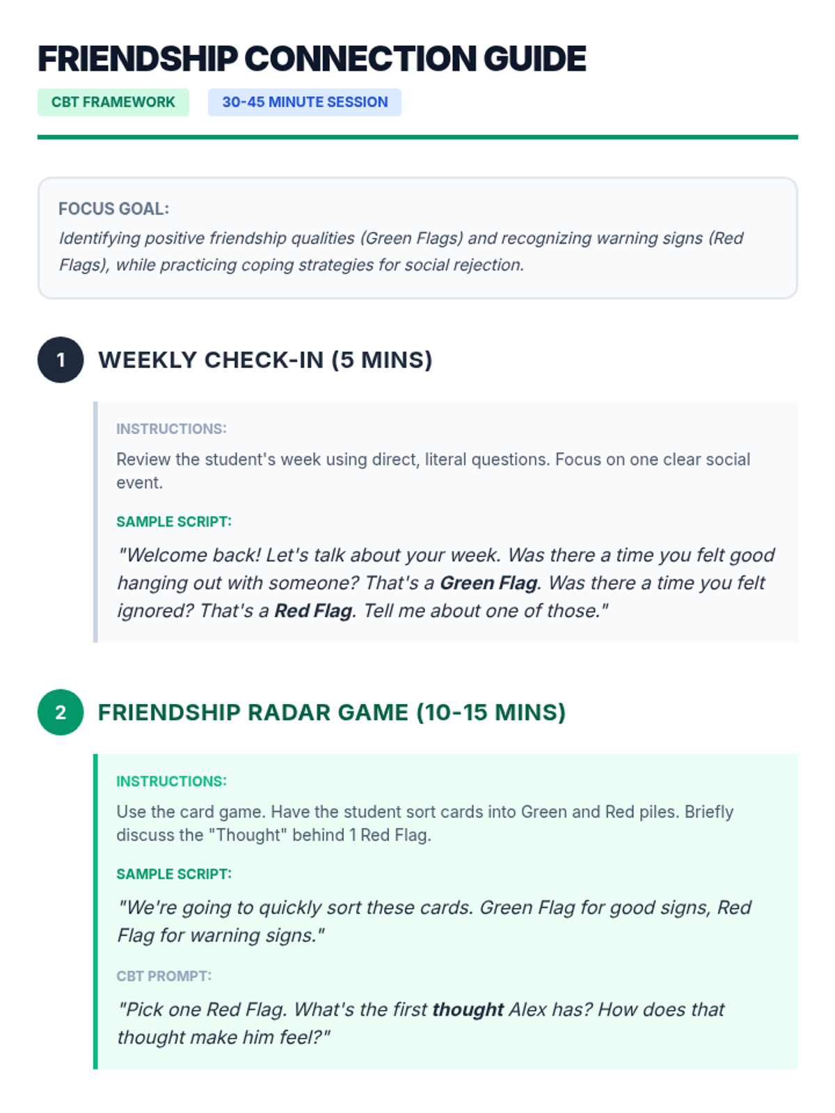 A CBT-based counseling session for high-functioning autistic students focused on identifying healthy friendship qualities, recognizing red flags, and developing coping strategies for social rejection.