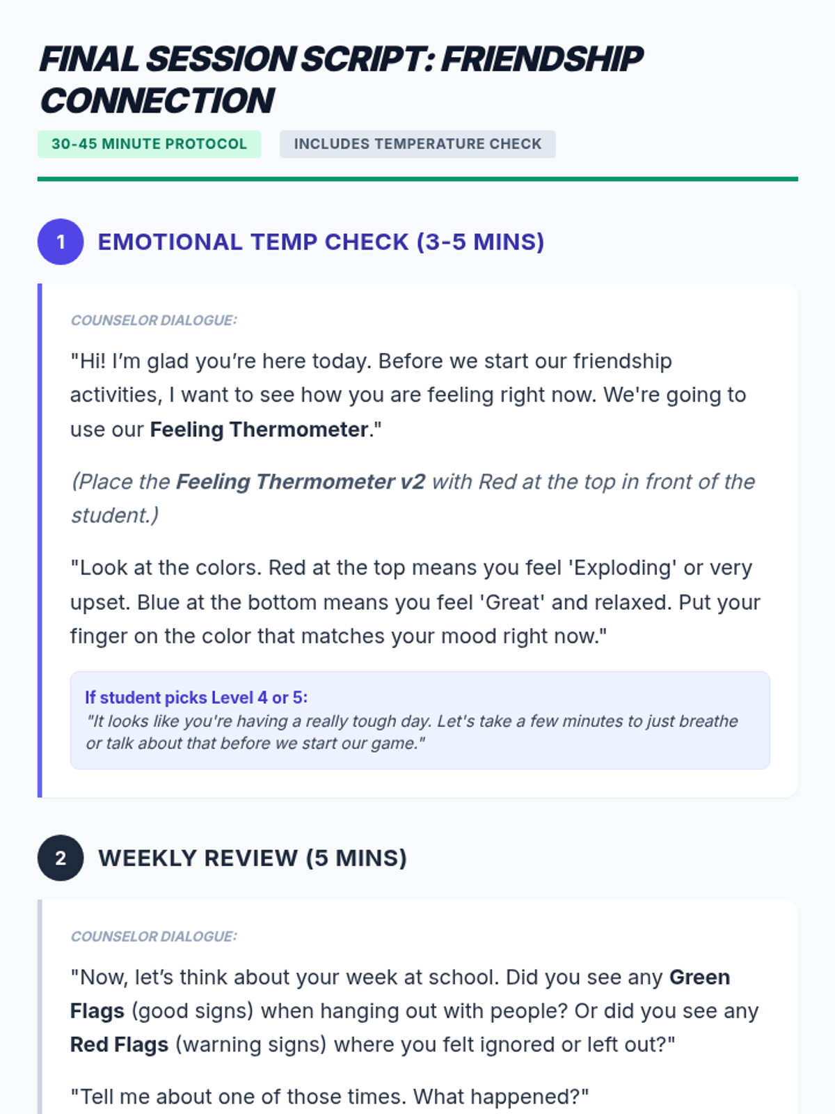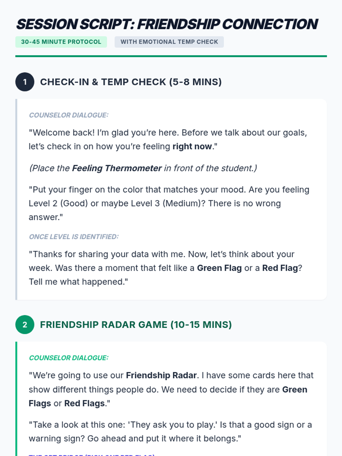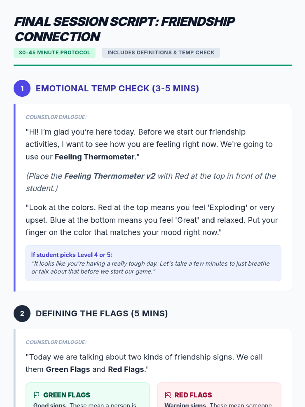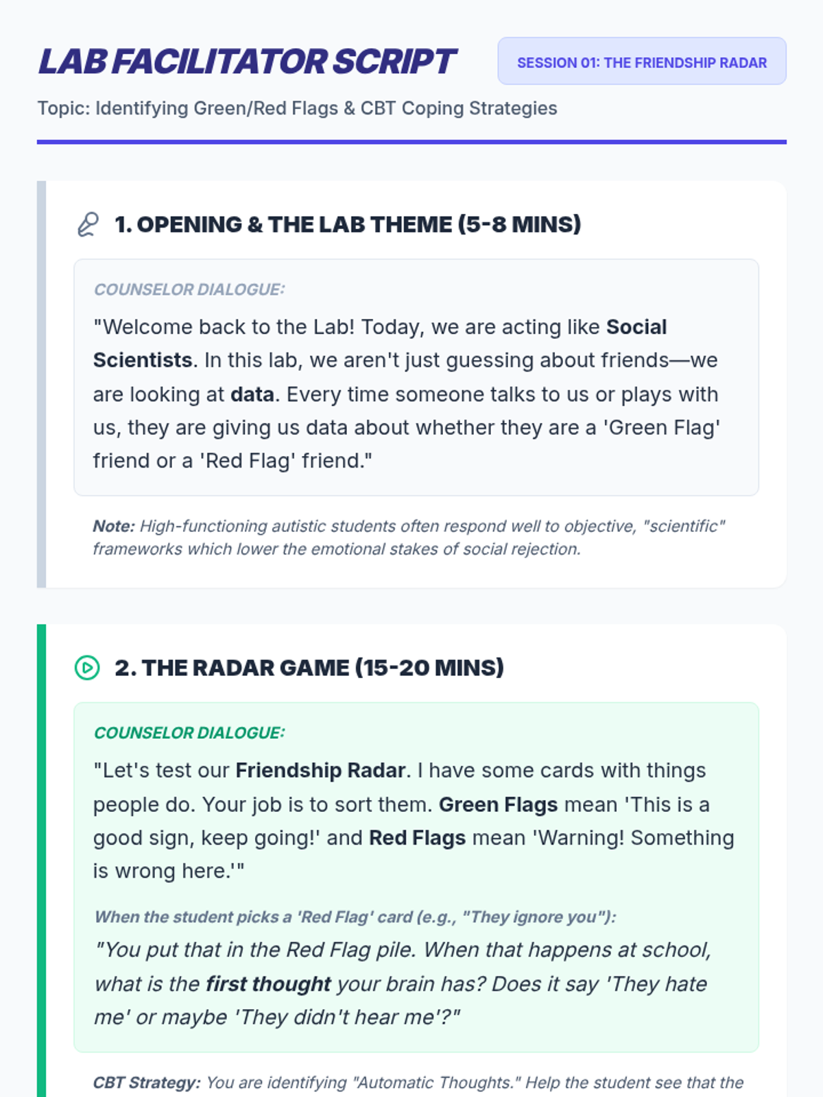 A CBT-based counseling session for high-functioning autistic students focused on identifying healthy friendship qualities, recognizing red flags, and developing coping strategies for social rejection.