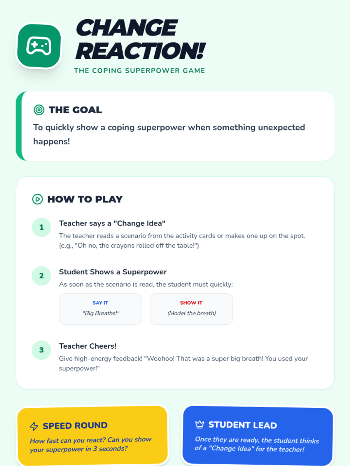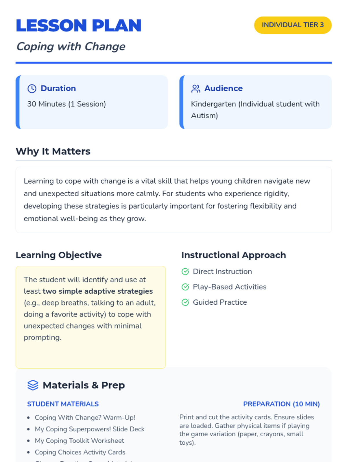 A 30-minute individual counseling lesson for Kindergarten students with Autism, focusing on developing adaptive strategies for coping with unexpected changes through a superhero-themed 'coping superpowers' framework.
