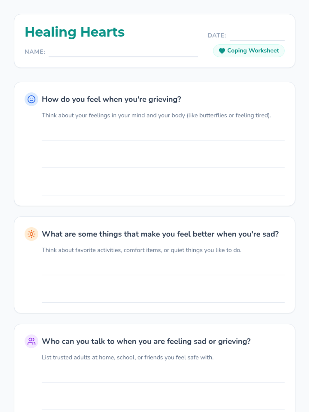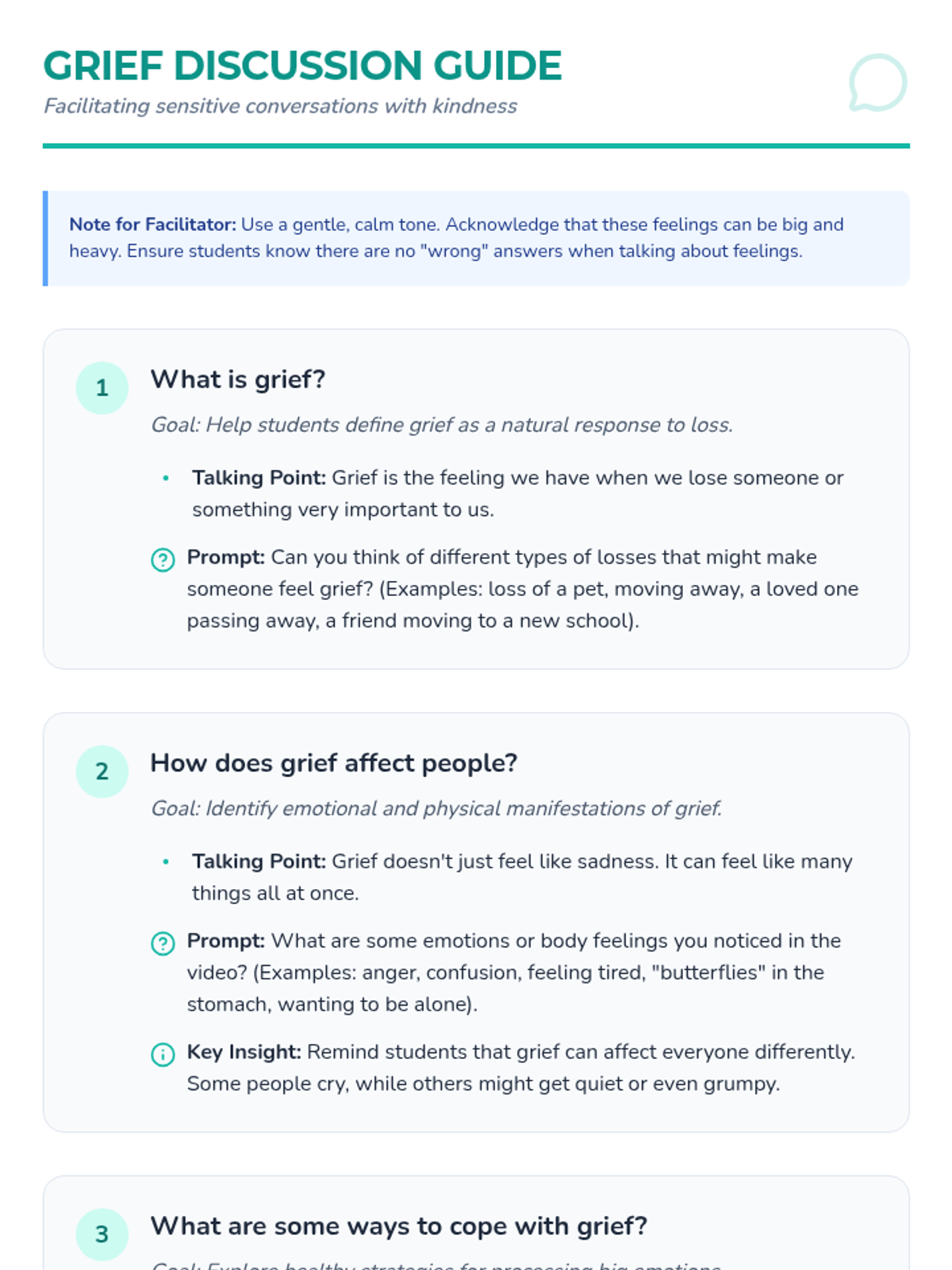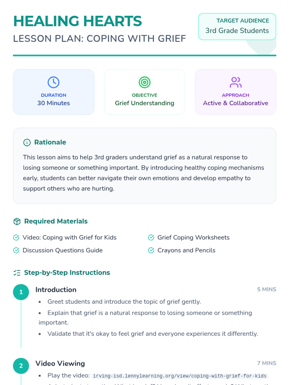 This lesson helps 3rd graders understand grief as a natural response to loss and introduces healthy coping mechanisms through video, guided discussion, and reflective drawing and writing.