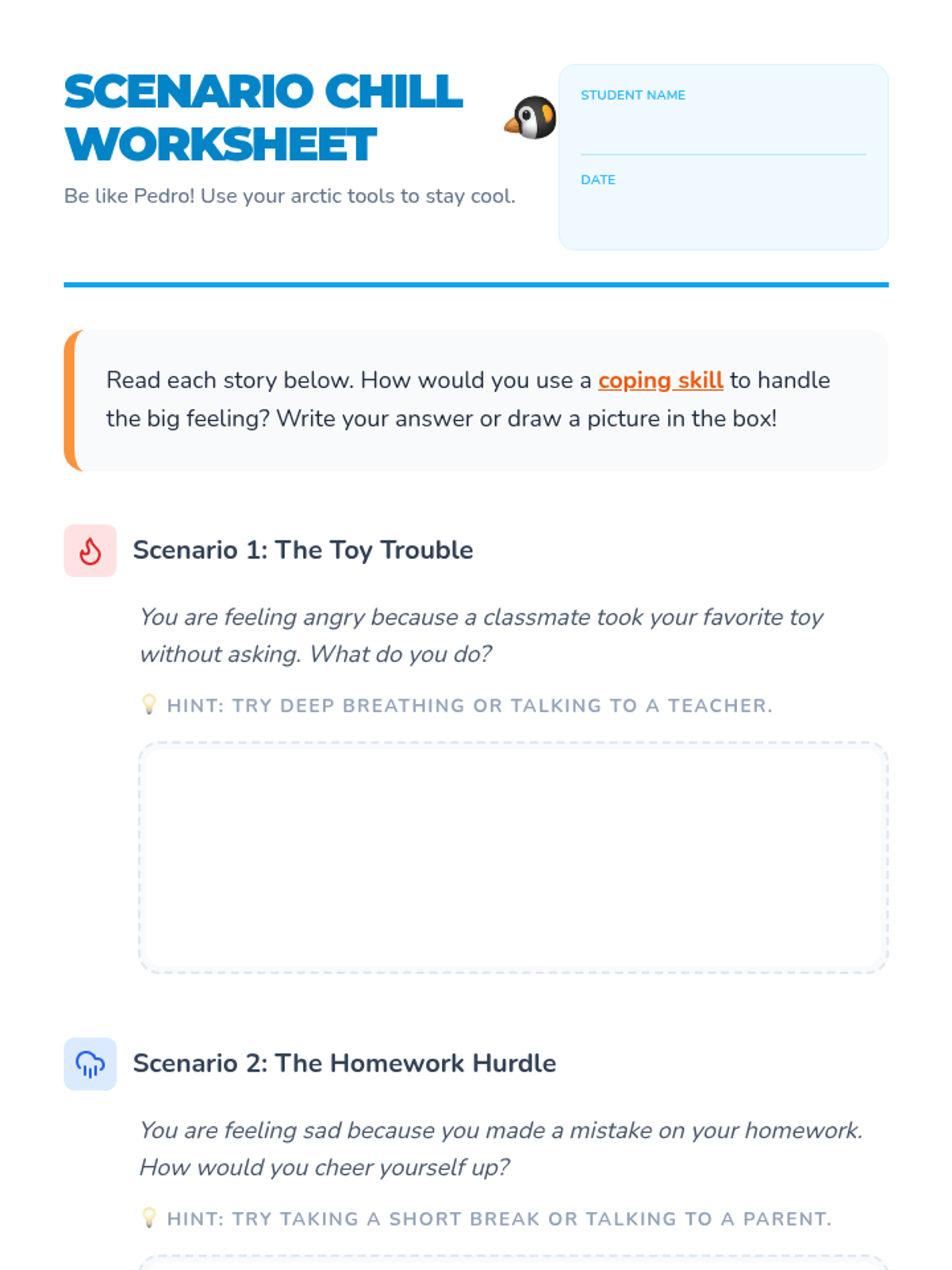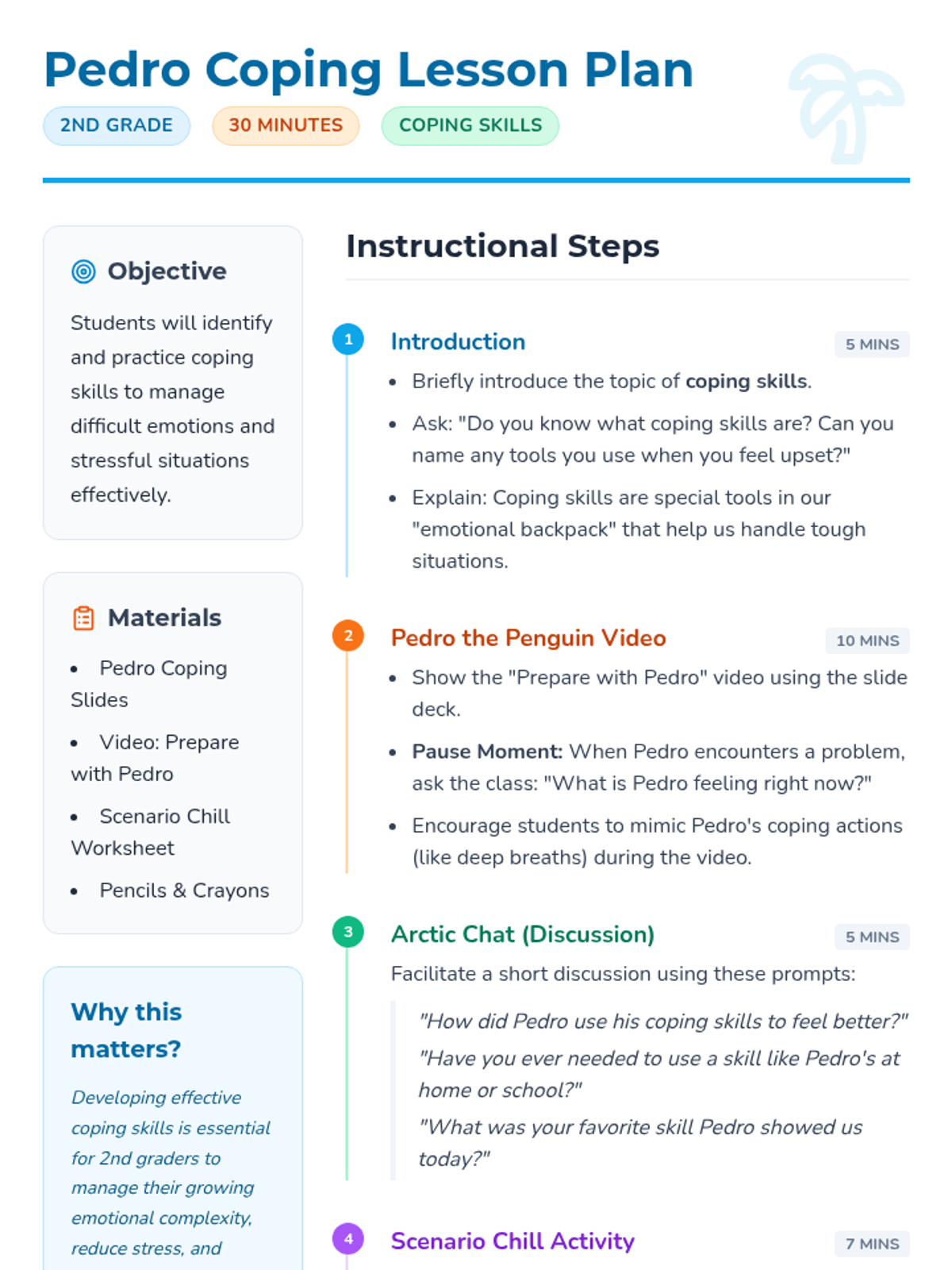 A fun, interactive lesson for 2nd graders that uses Pedro the Penguin to teach essential coping skills for managing tough emotions and situations.