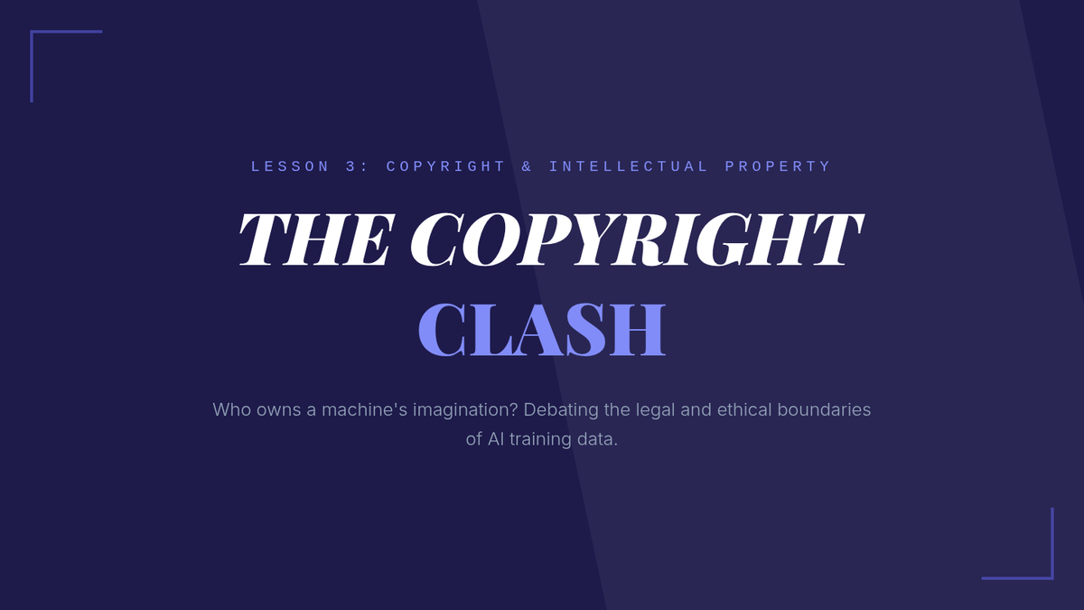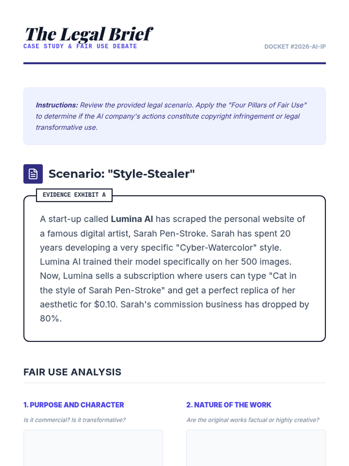 An examination of the legal battles surrounding AI training on copyrighted works without consent. Students review current lawsuits involving artists and writers, debating the concept of 'fair use' in the context of machine learning.