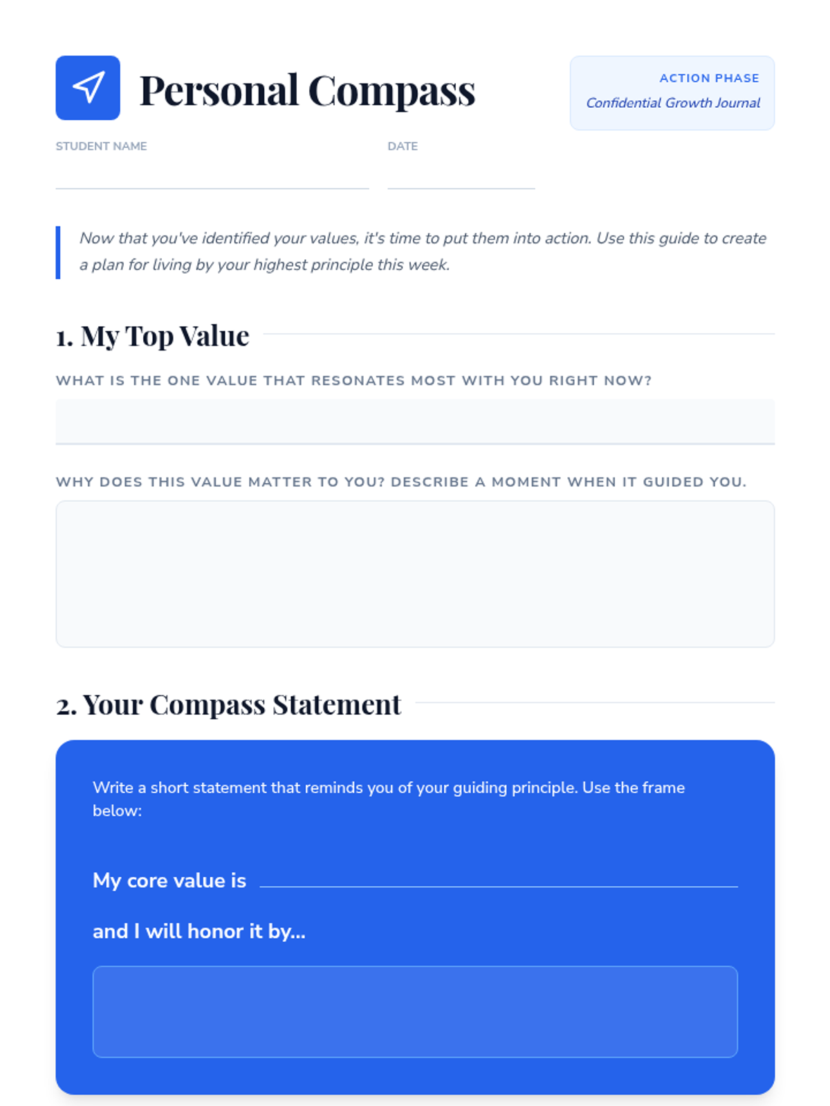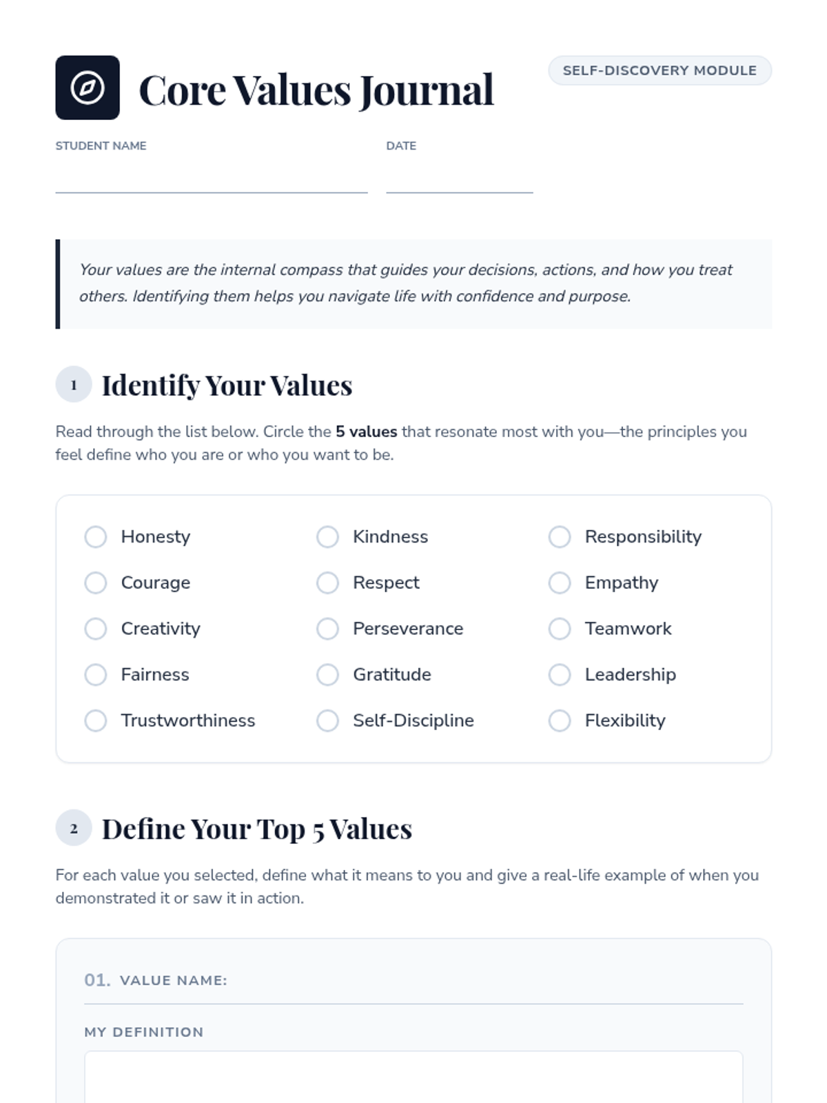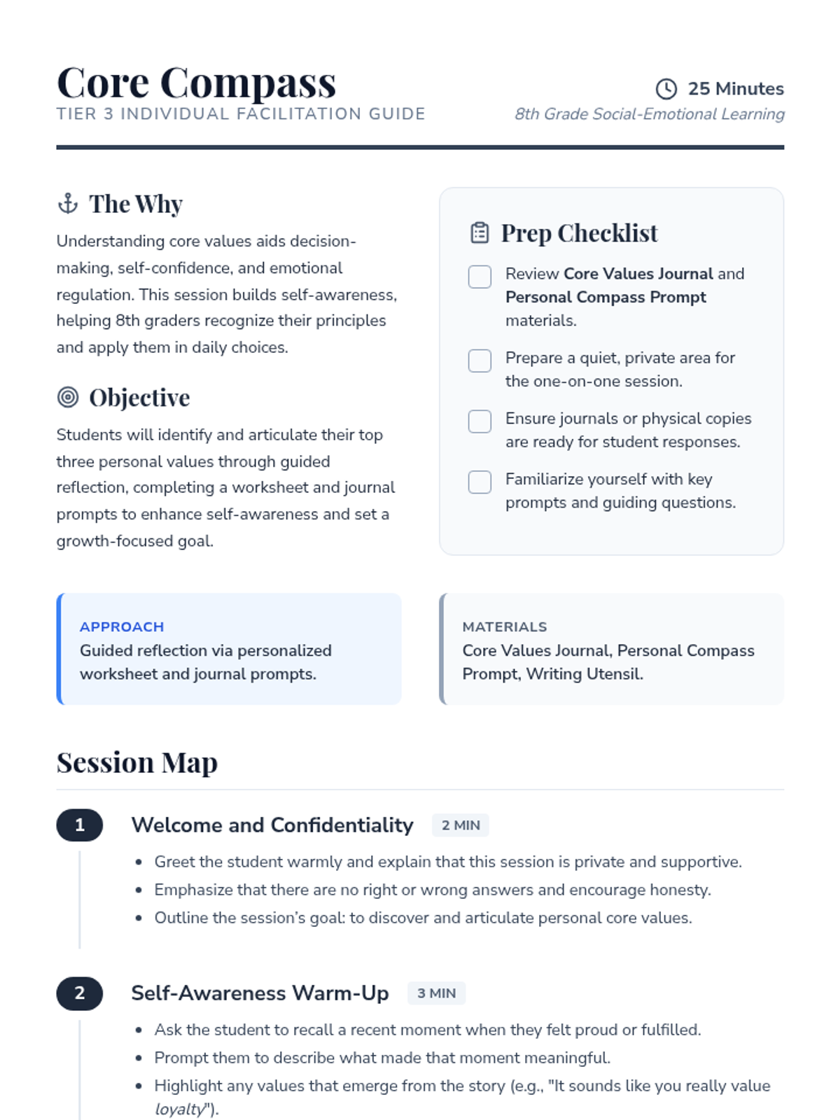 A confidential Tier 3 intervention for 8th graders to explore and articulate their core values through guided reflection and action planning.