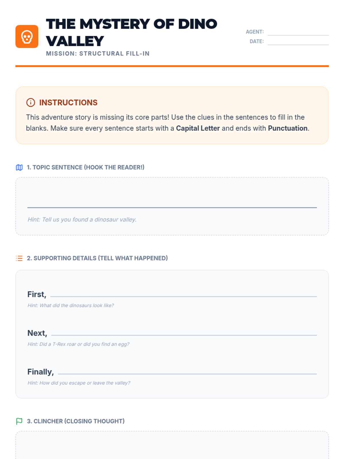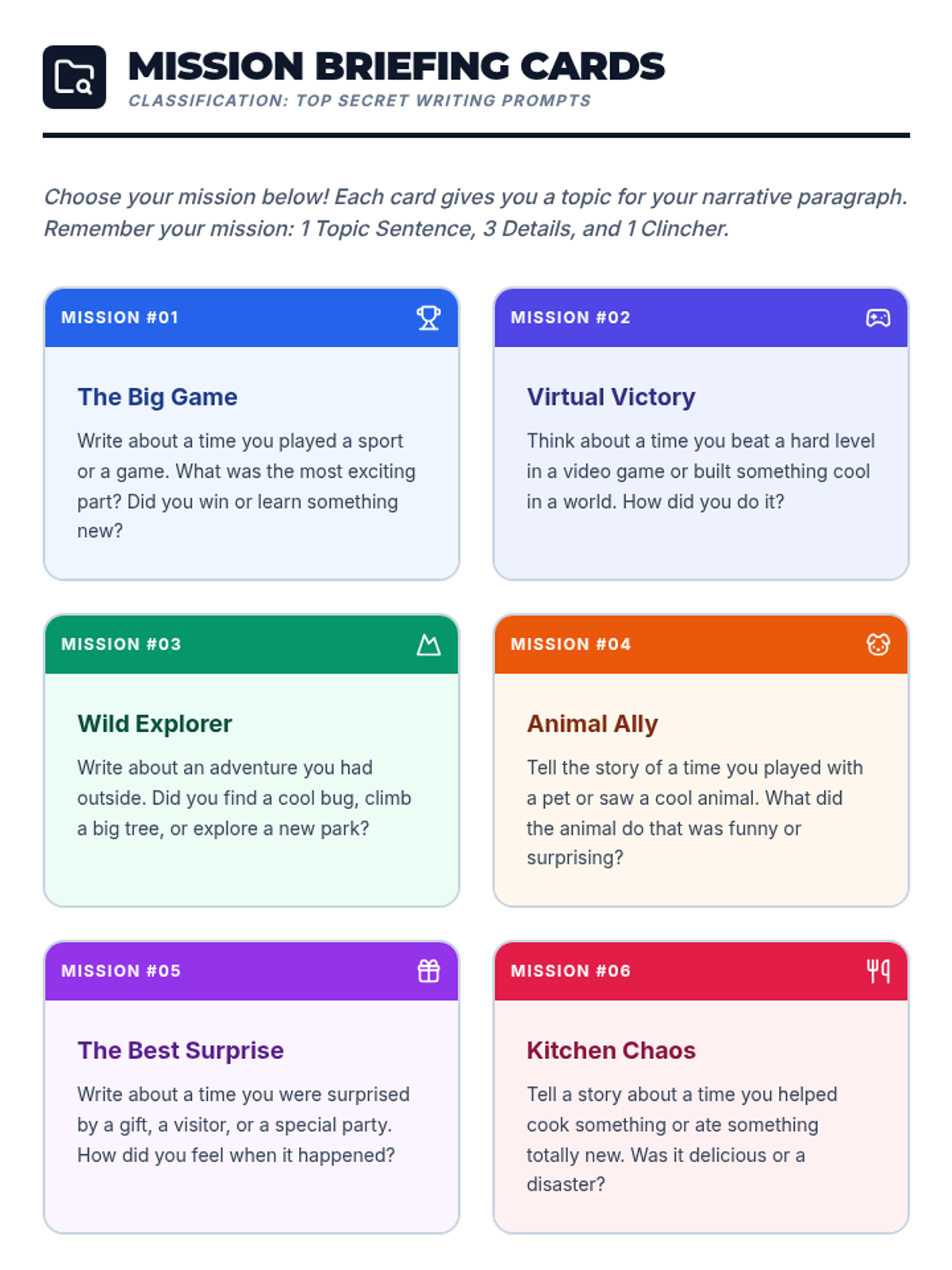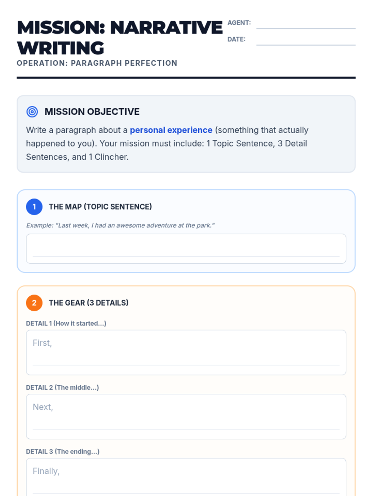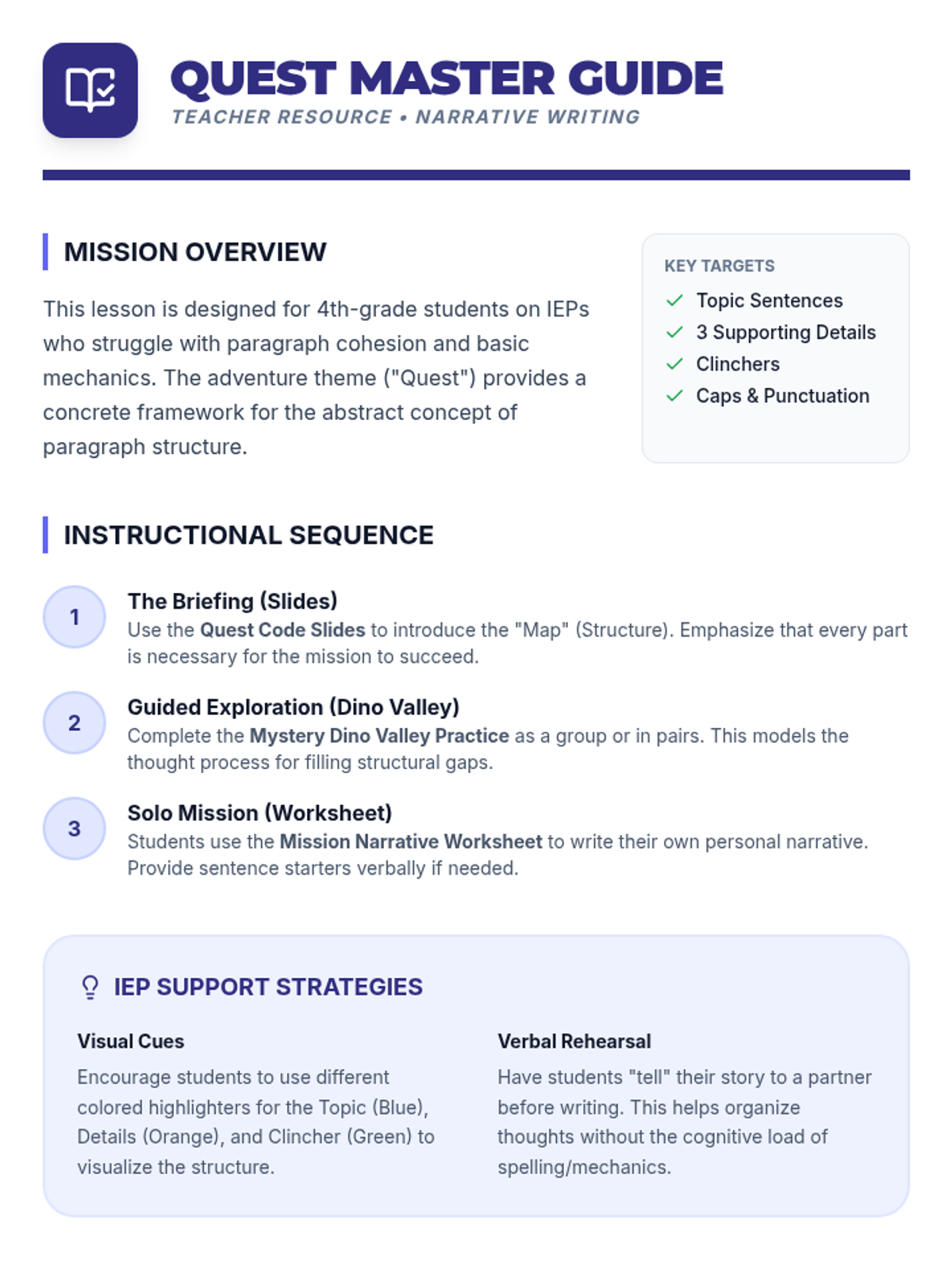 A structured writing lesson designed for 4th-grade students on IEPs, focusing on the mechanics and structure of a narrative paragraph through an 'Adventure Quest' theme. Students will learn to construct paragraphs with a topic sentence, three supporting details, and a clincher while maintaining proper grammar and punctuation.
