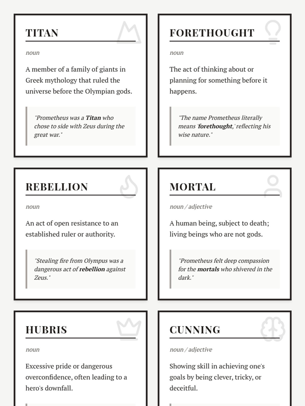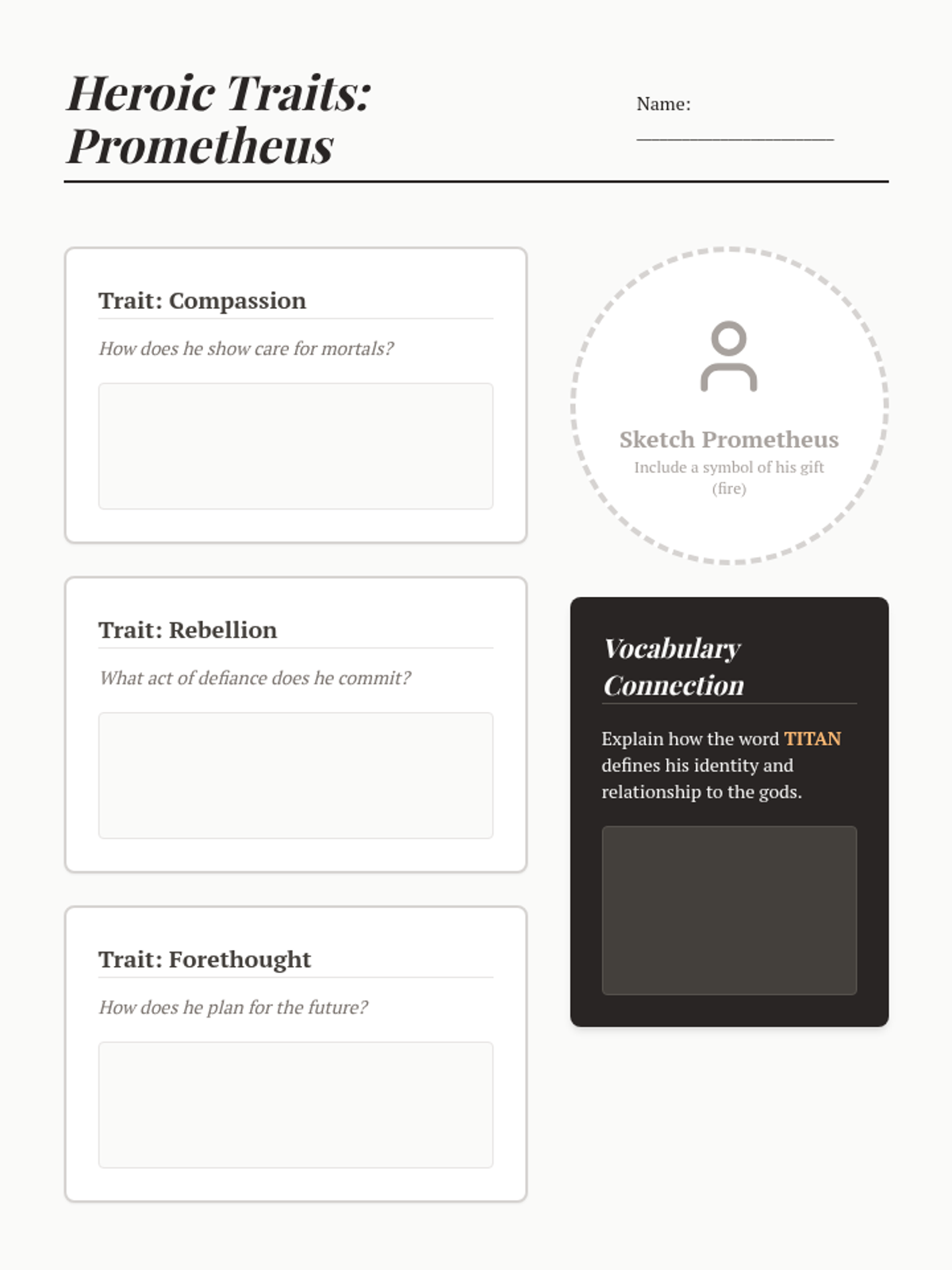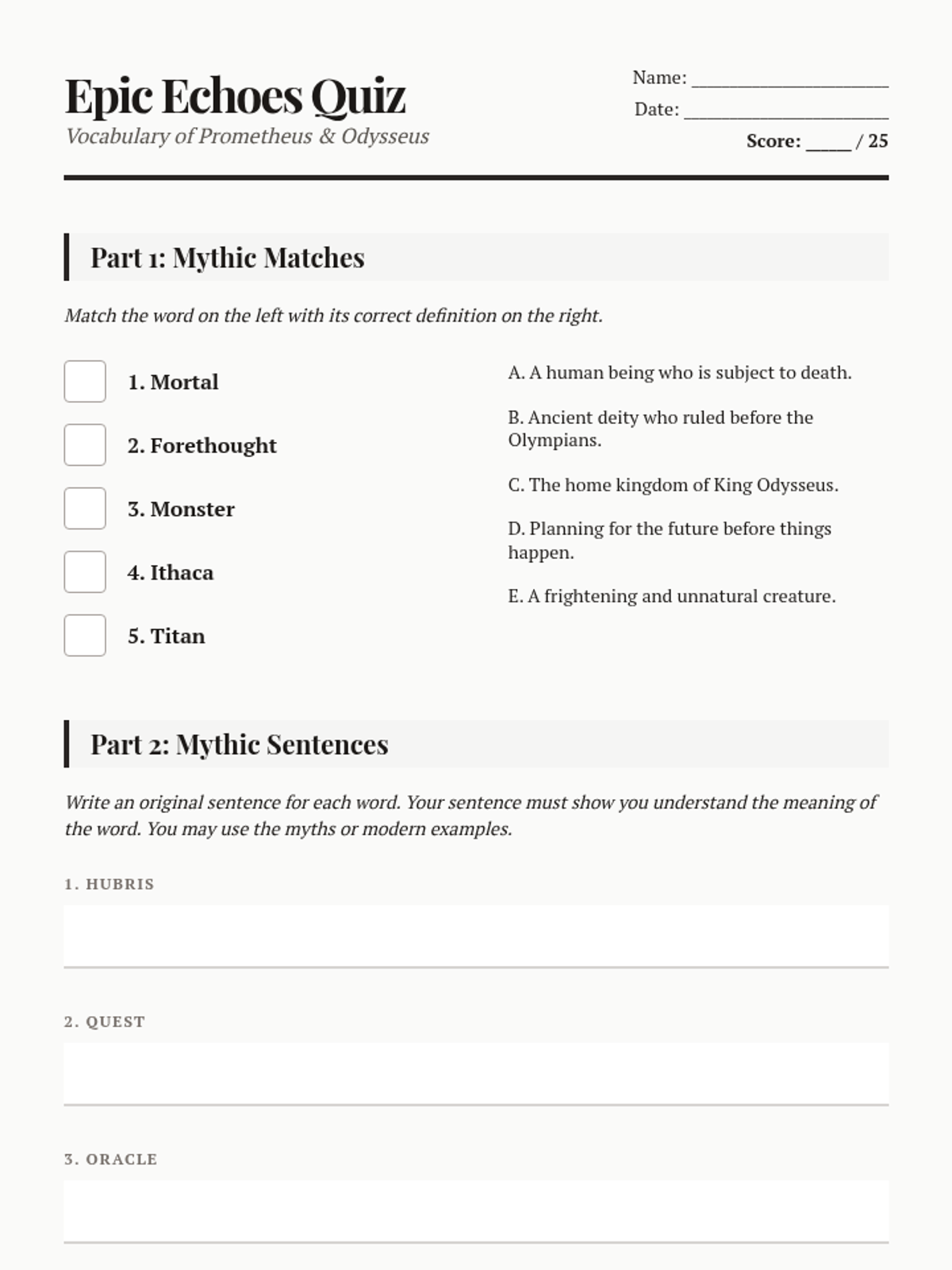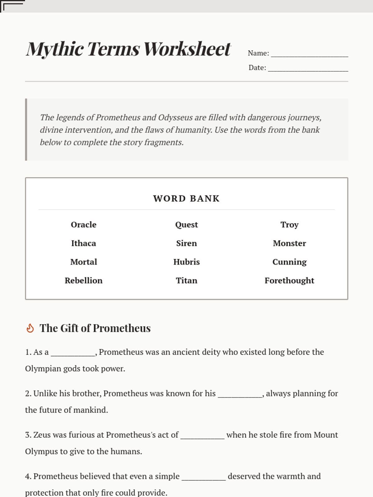 Students explore the stories of Prometheus's rebellion and Odysseus's long journey home, building vocabulary related to Greek mythology, character traits, and epic quests.