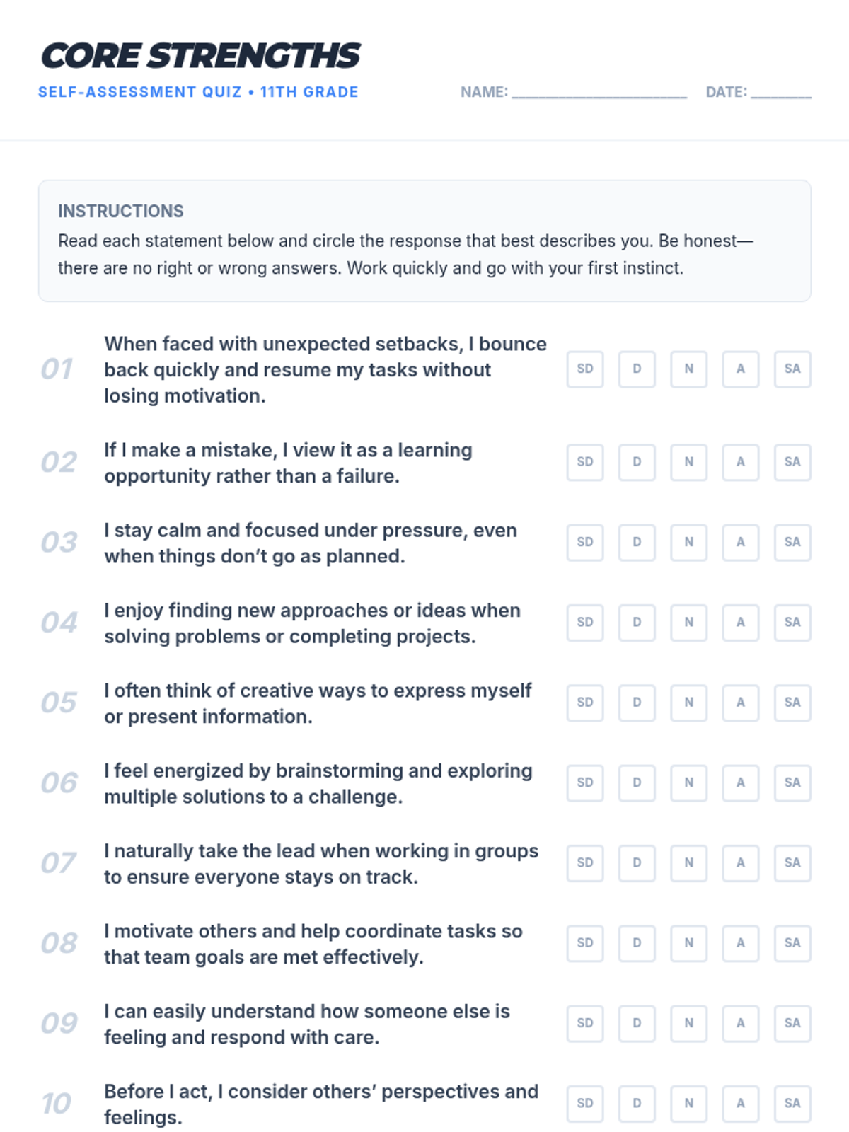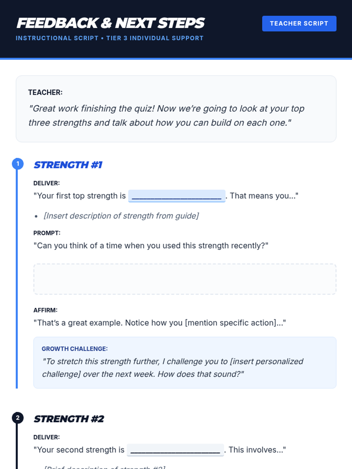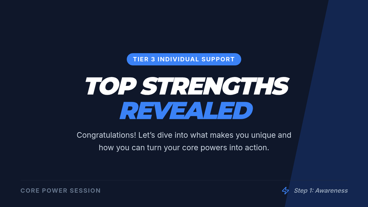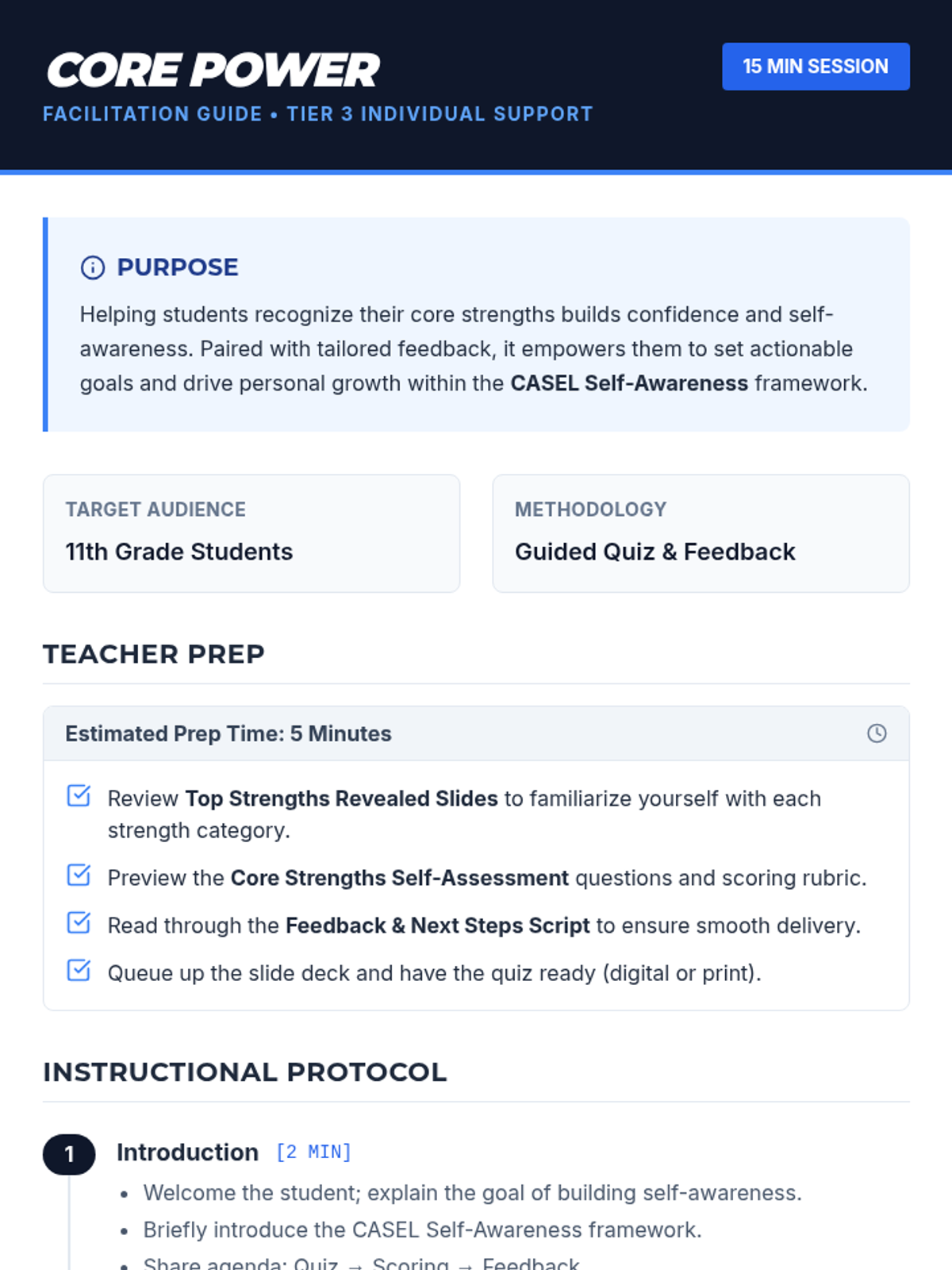 A 15-minute Tier 3 individualized session where 11th graders identify their top three strengths using the CASEL Self-Awareness framework and set personalized growth challenges.